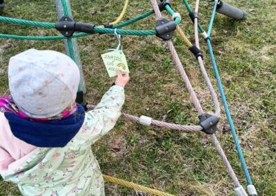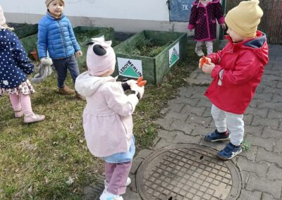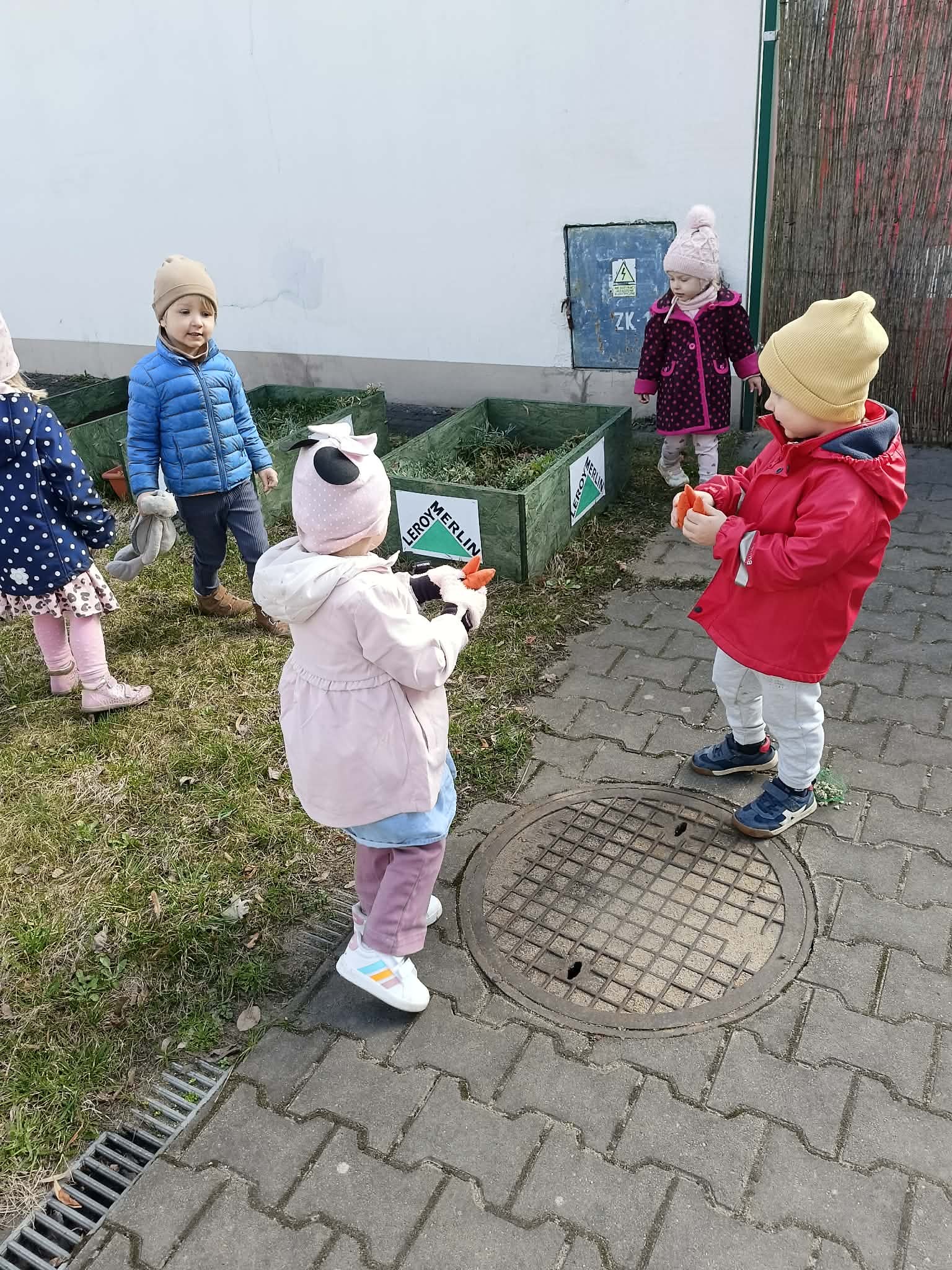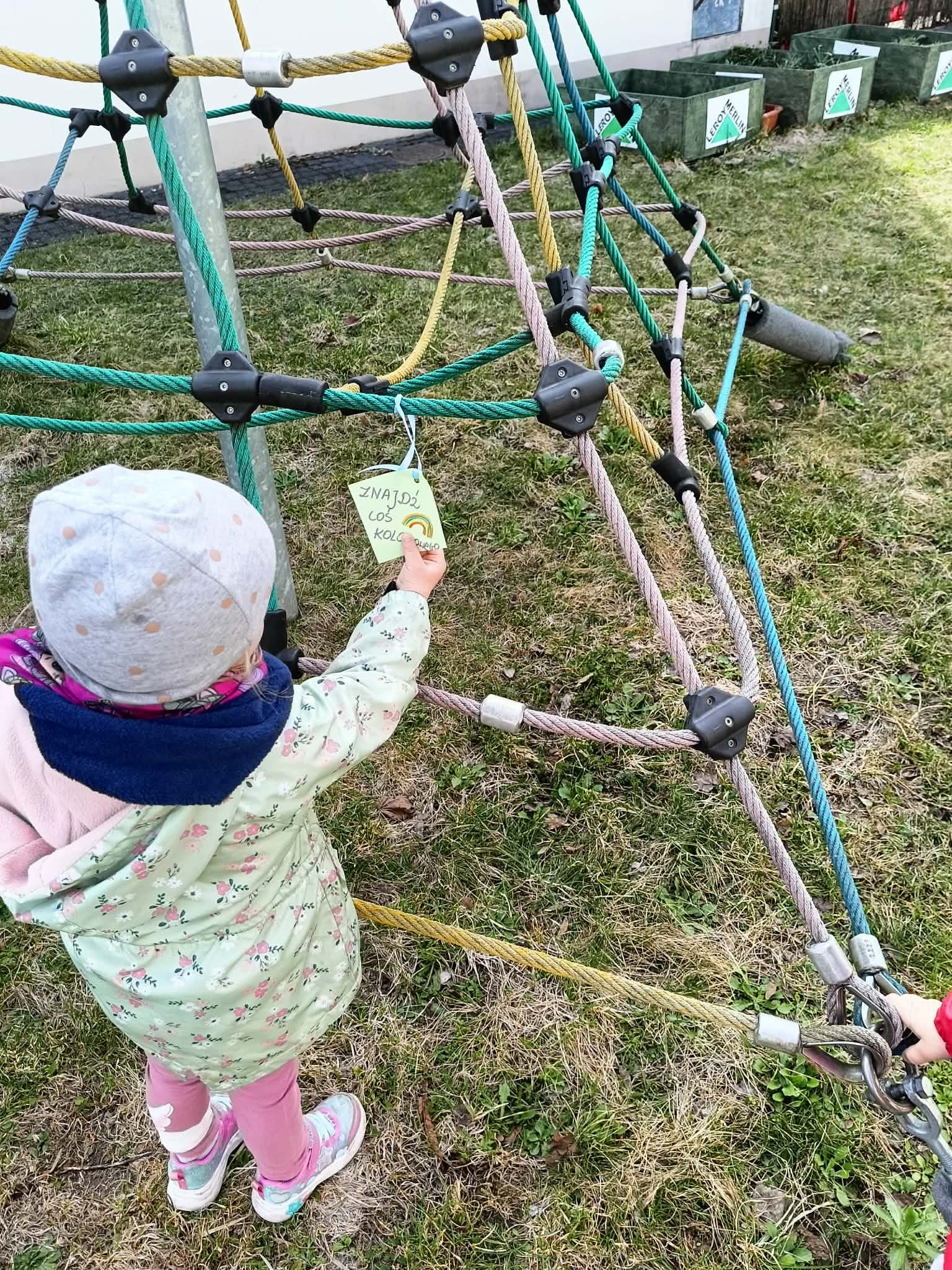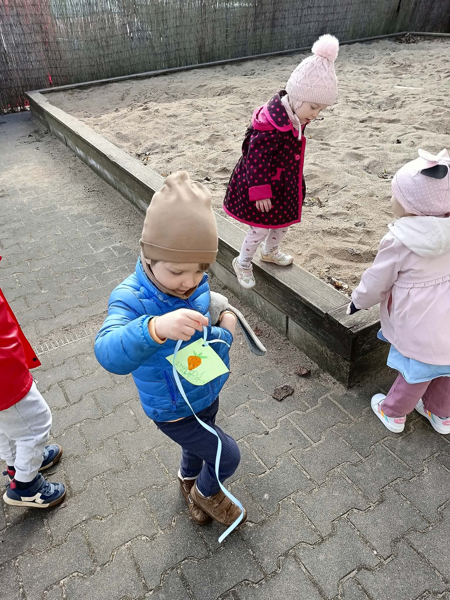Po drodze wykonywały różne zadania – skakały jak zajączki, szukały kolorowych przedmiotów i odnajdywały ukryte marchewki. Dzięki sprytowi i współpracy udało się dotrzeć do celu – odnaleźć ukryty prezent! 🎁