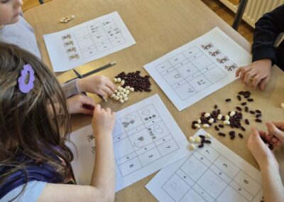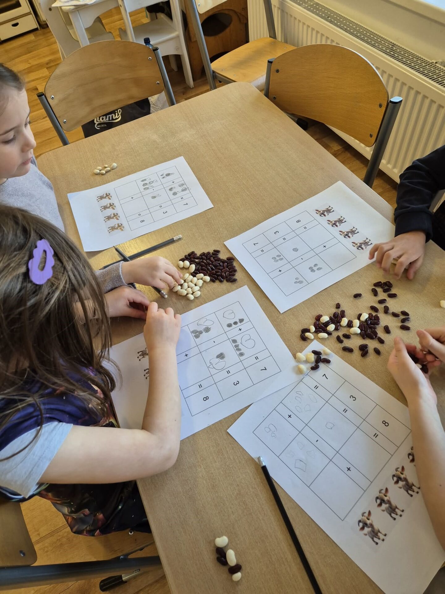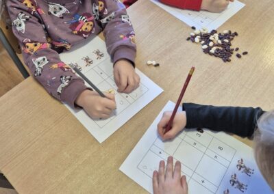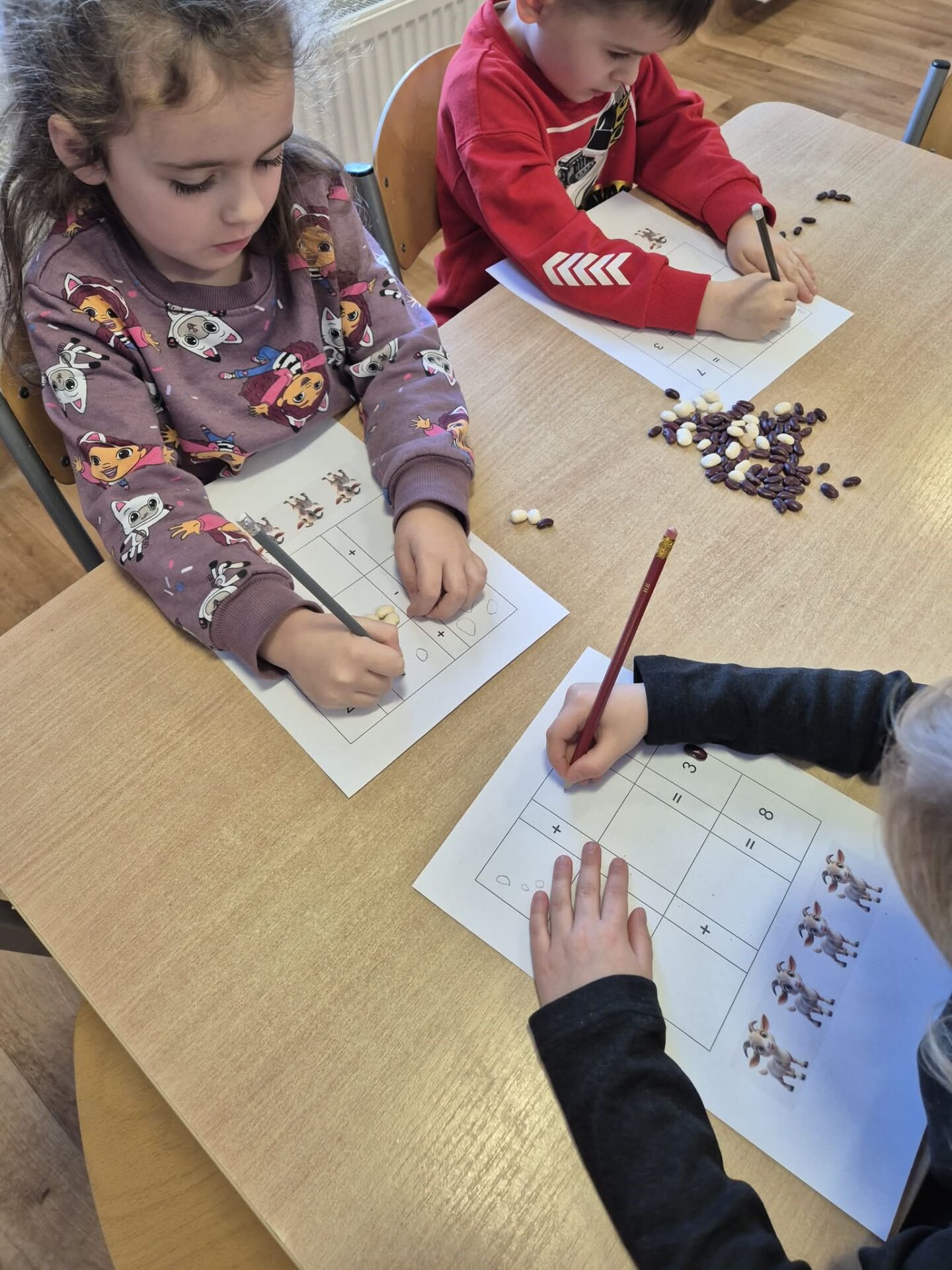 Dodatkowo wykonywaliśmy karty pracy z liczeniem na konkretach, podczas których poprzez zabawę dzieci utrwalały poznane znaki matematyczne.