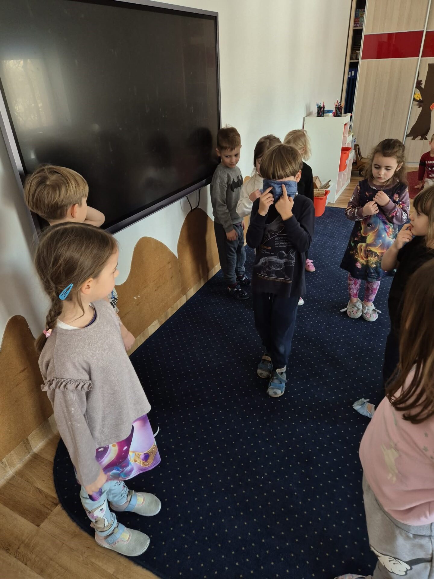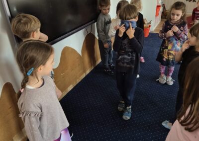 Z wielką fascynacją i zaciekawieniem bawiły się w labirynt, który tworzyły samodzielnie. Jedno dziecko miało zakryte oczy, a drugie je prowadziło. Dzięki tej zabawie dzieci kształtowały orientację przestrzenną oraz schemat własnego ciała — jedno z nich musiało uważnie słuchać i stawiać kroki zgodnie z podawanymi kierunkami, natomiast drugie musiało formułować jasne i precyzyjne komunikaty.