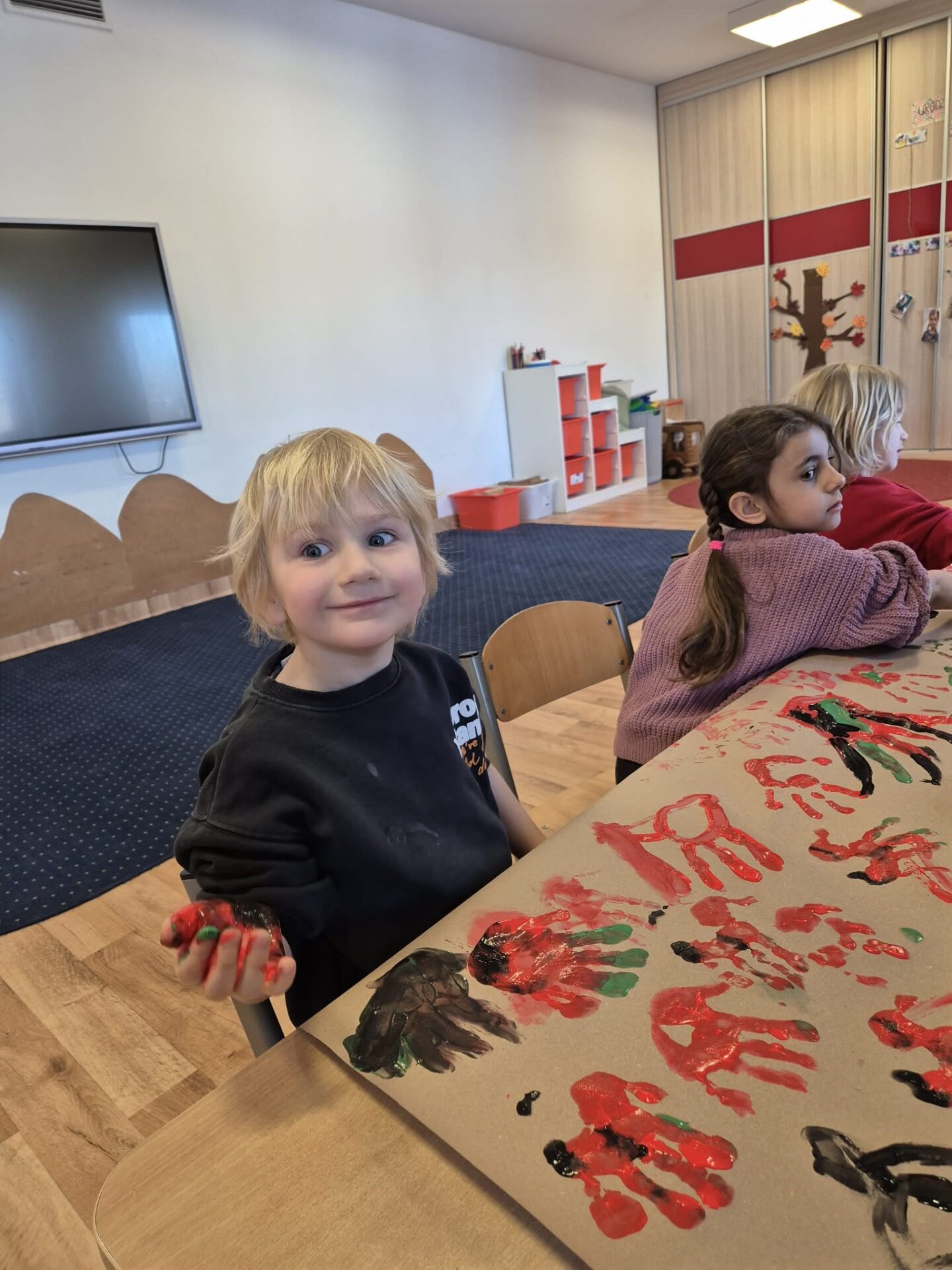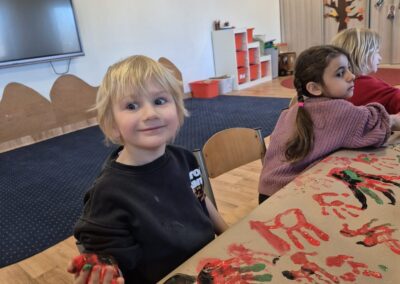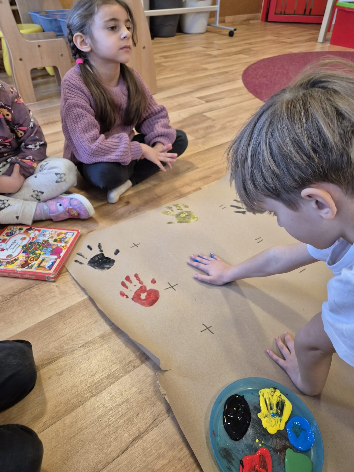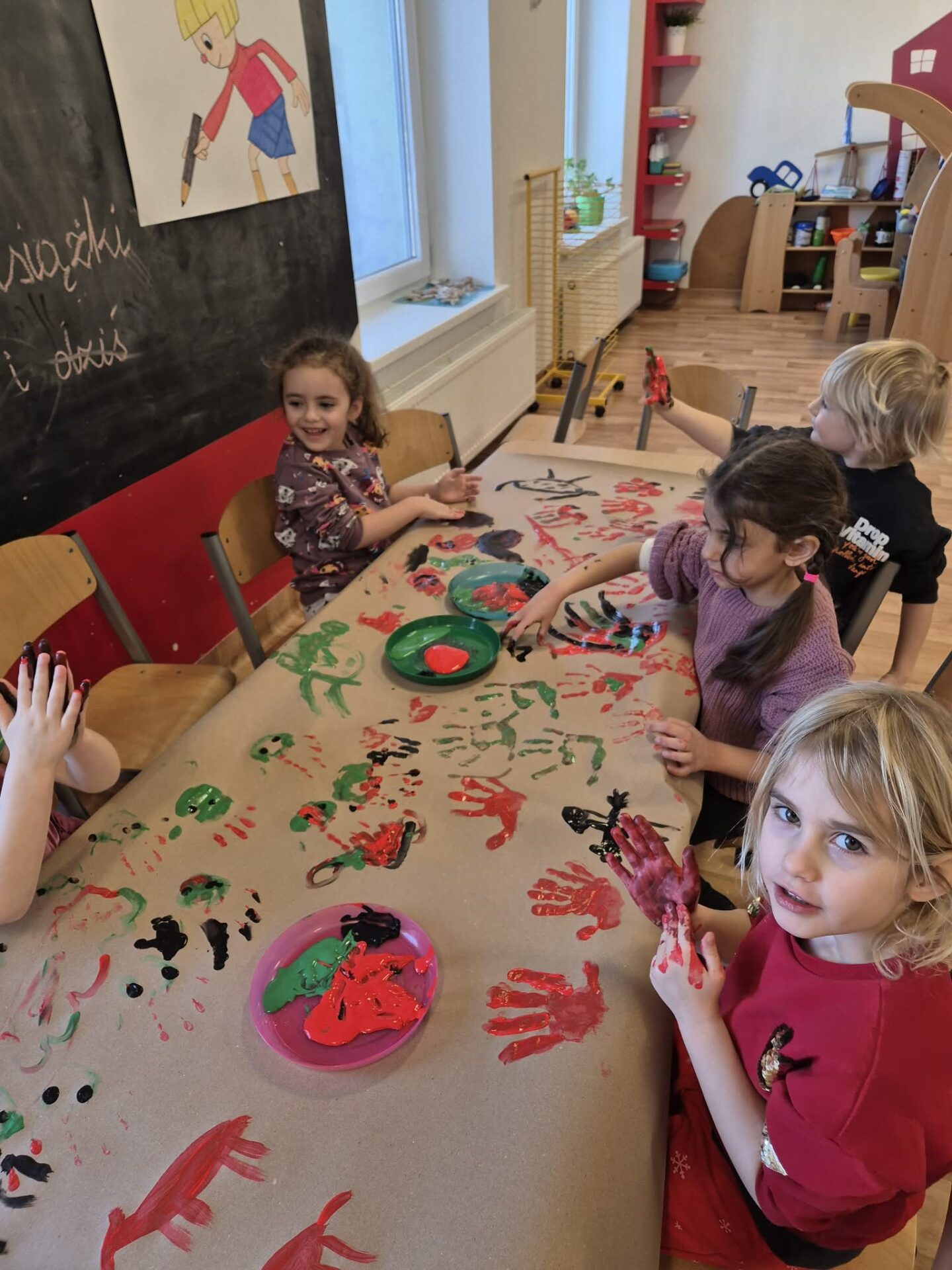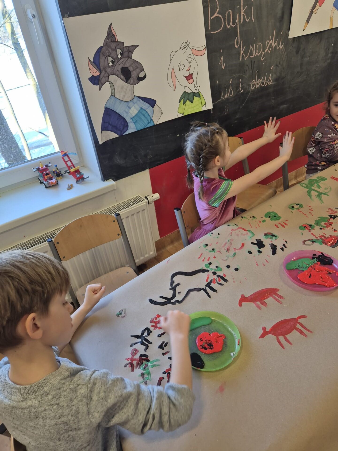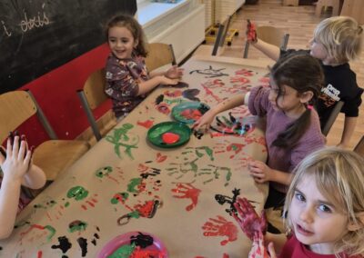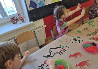 Dzieci eksperymentowały z kolorami, przypominając sobie, jakie barwy powstają z ich połączenia. Głównym wyzwaniem było jednak stworzenie naszej własnej – lelukowej jaskini, wypełnionej historią zapisaną kolorem i kształtami. To było wyjątkowe doświadczenie, pełne kreatywności, współpracy i radości z tworzenia.