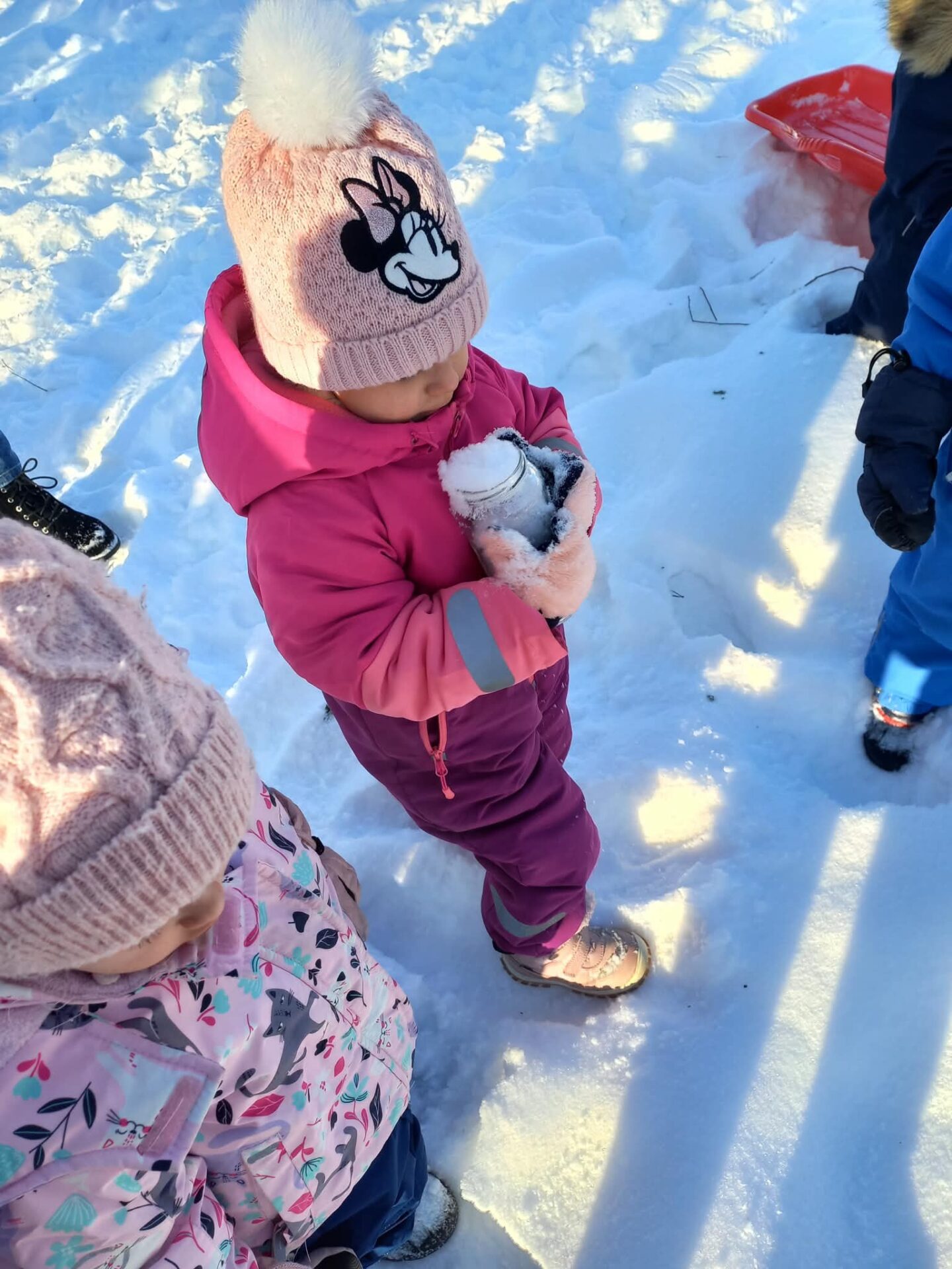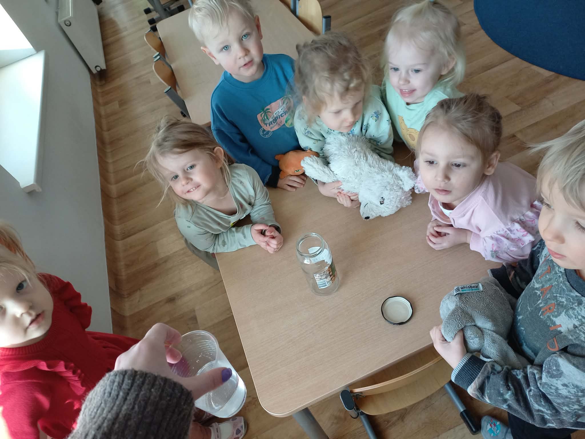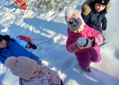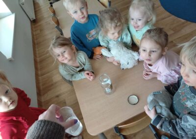 Podczas spaceru na placu przedszkolnym dzieci zebrały śnieg z wyznaczonego miejsca i umieściły go w słoiku, który napełniły po brzegi. Następnie obserwowaliśmy, co stanie się ze śniegiem po przeniesieniu go do ciepłego pomieszczenia. Wraz ze wzrostem temperatury śnieg zmienił swój stan skupienia – stopniowo topniał, zamieniając się w wodę, i zmniejszając swoją objętość w słoiku.