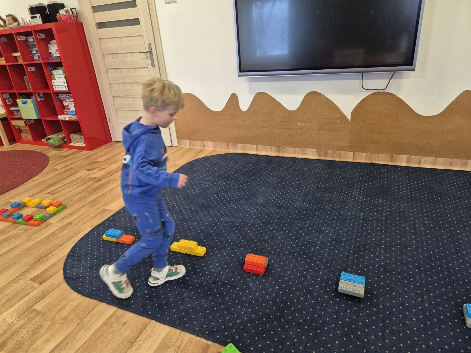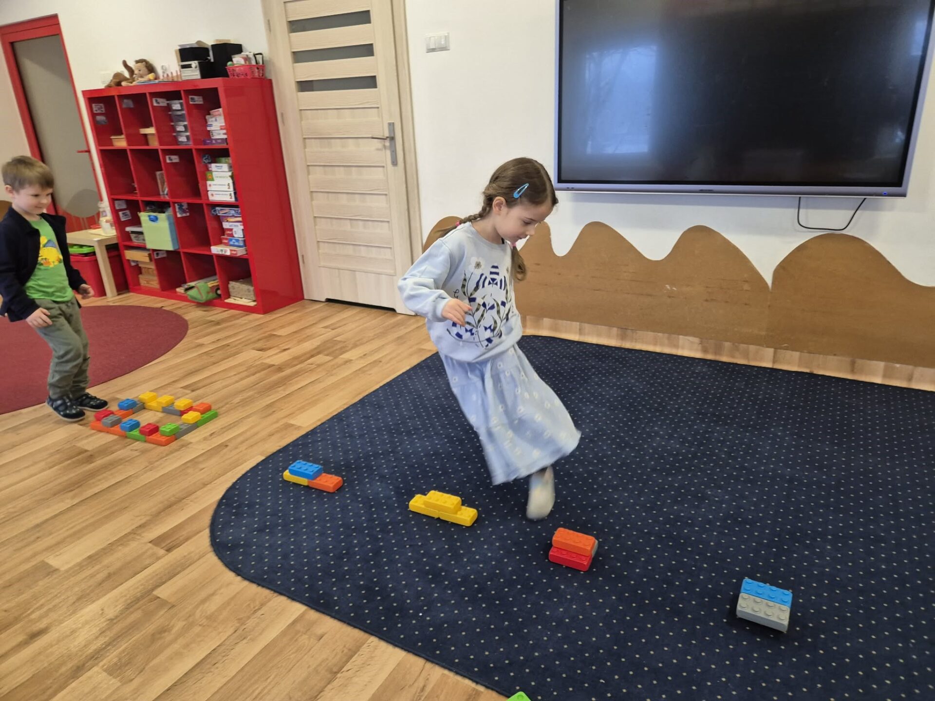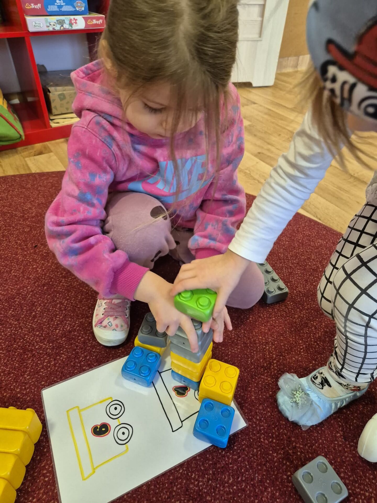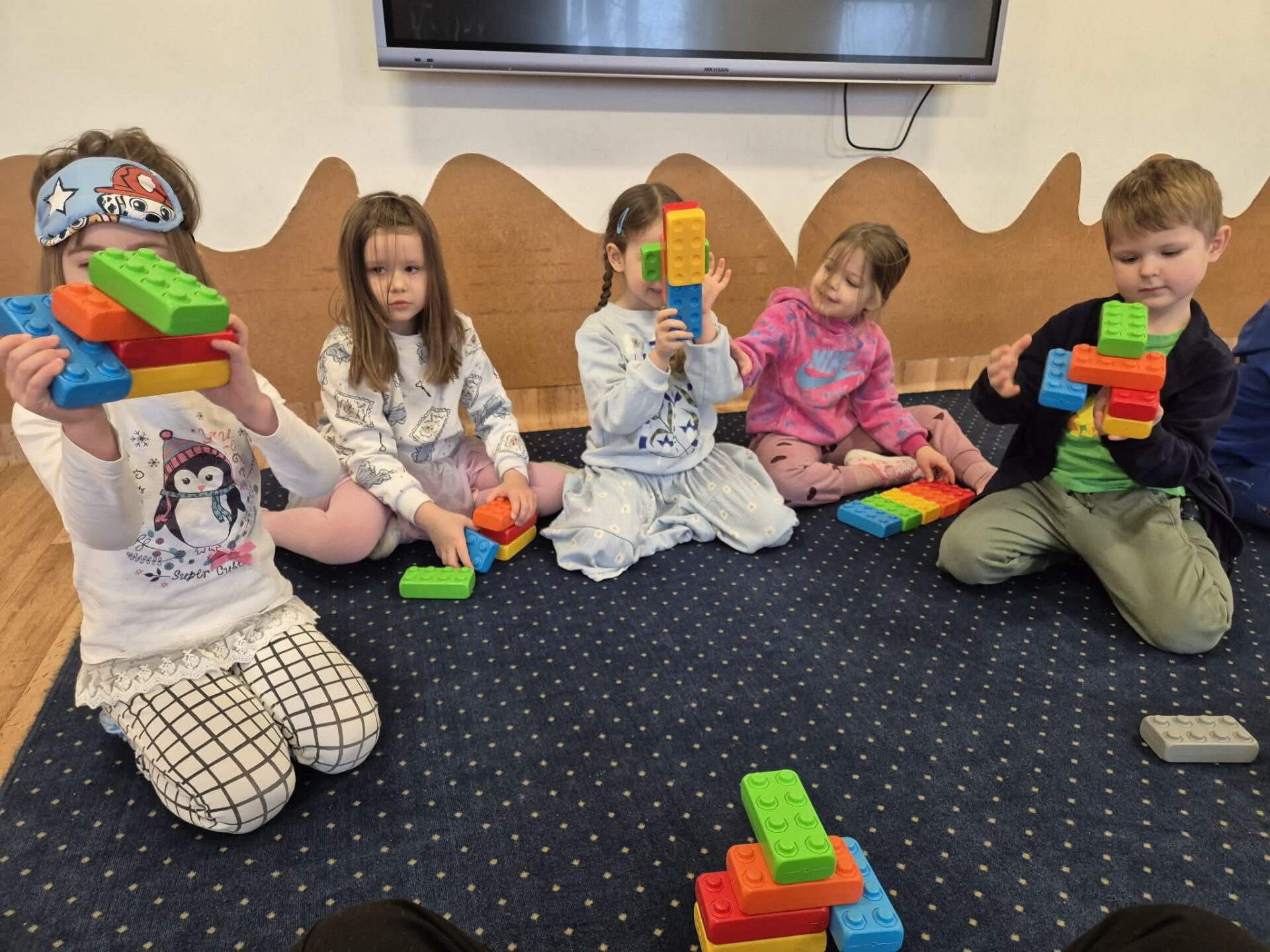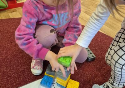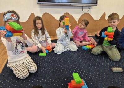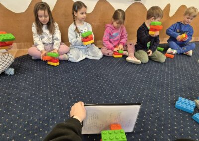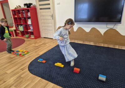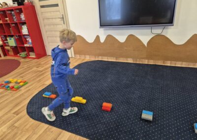 Następnie przyszedł czas na zabawy zręcznościowe – pracując w parach, dzieci tworzyły tory przeszkód z klocków, ćwicząc współpracę, koordynację i kreatywność. Nie zabrakło też zadań rozwijających spostrzegawczość oraz umiejętności matematyczne. Dzieci otrzymały ilustracje wagoników różniących się kolorem i cyfrą, a ich zadaniem było skompletowanie ich kolejno: według koloru, liczby oczek na klocku, a na końcu według obu kryteriów jednocześnie.