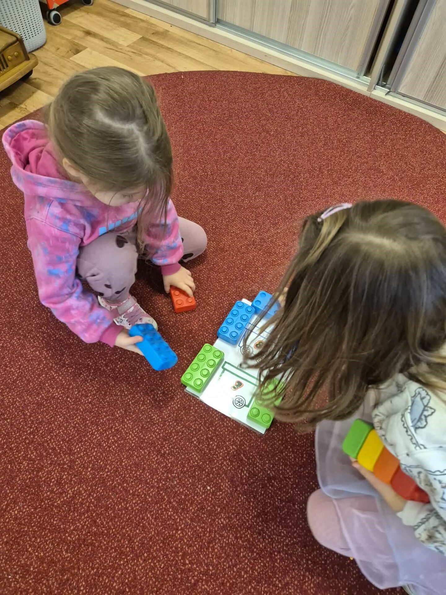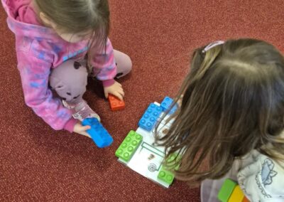 Podjęliśmy się również wyzwania pamięciowego, kształtującego umiejętność kontynuowania sekwencji, czyli podstawy myślenia programistycznego. Dzieci odtwarzały budowle po krótkiej obserwacji konstrukcji wykonanej przez nauczycielkę, zapamiętując kolejność kolorów i sposób ułożenia klocków.