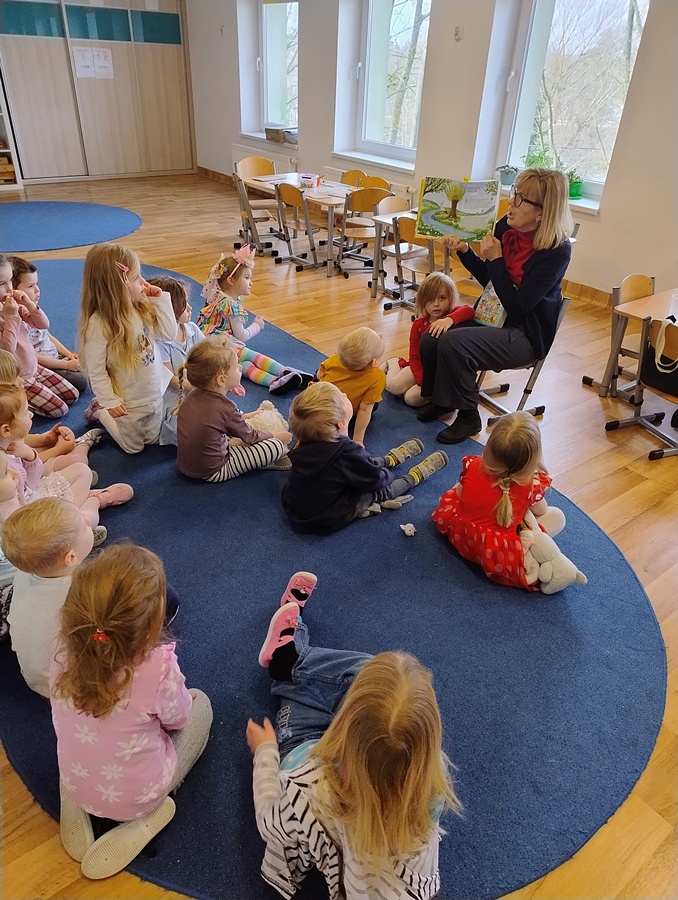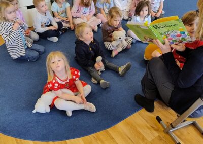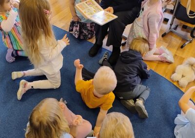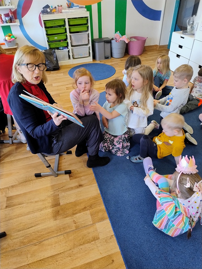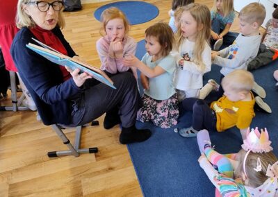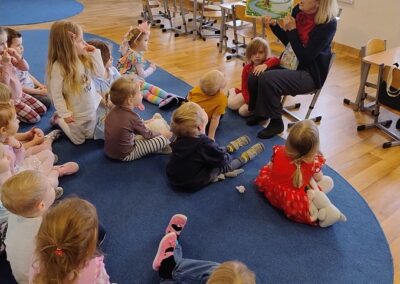 Leluki Turkusowe ponownie uczestniczyły w głośnym czytaniu dzieciom. Podczas spotkania czytaliśmy książkę pt. „Obrazki dla maluchów. W przedszkolu” autorstwa Emilie Beaumont oraz Nathalie Bélineau. Publikacja stała się doskonałym punktem wyjścia do rozmów o codziennym życiu przedszkolaka. W nawiązaniu do tematu projektu pt. „Jak ludzie ubierali się w różnych epokach?”, omawialiśmy również ubiór odpowiedni do przedszkola w różnych porach roku, zwracając uwagę na zmieniające się warunki pogodowe i potrzebę dostosowania stroju.