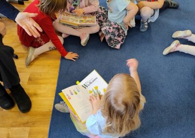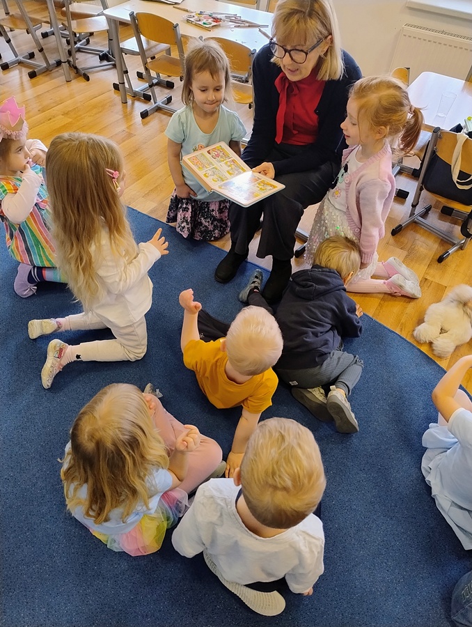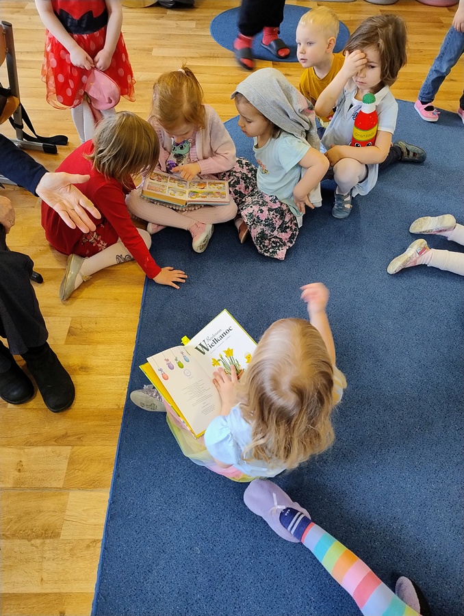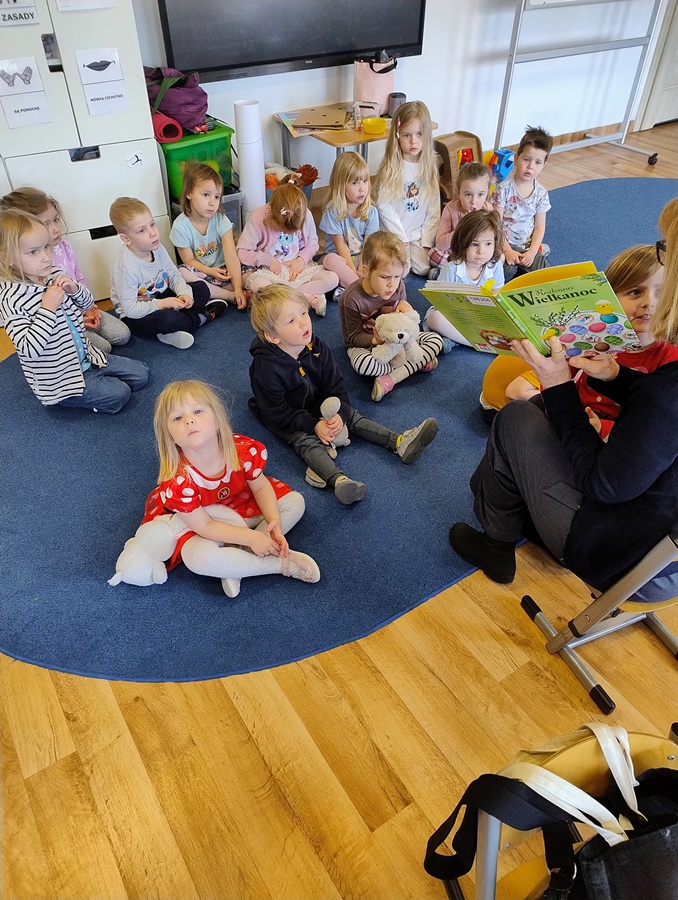 Omówiliśmy także książkę pt. „Radosna Wielkanoc” autorstwa Anny Dłużewskiej w związku ze zbliżającymi się Świętami Wielkanocnymi. Dzieci poznały zwyczaje świąteczne, dawniej i dziś, ciekawostki z różnych regionów kraju, obrzędy, wiersze o Wielkanocy, znaczenie wielkanocnych symboli oraz pomysły na ozdoby.