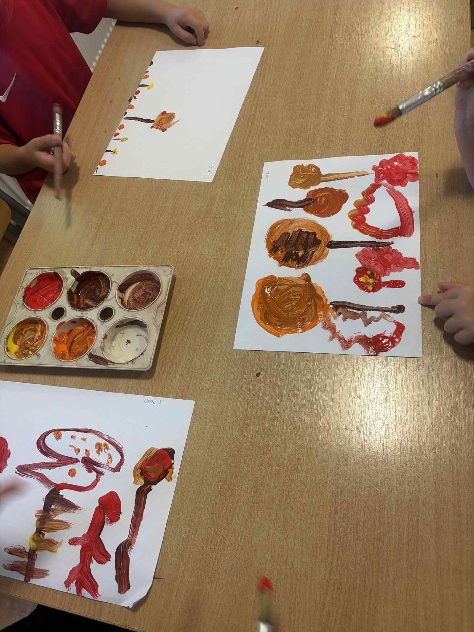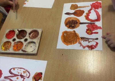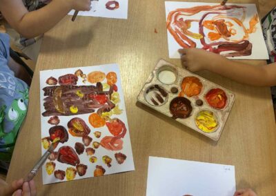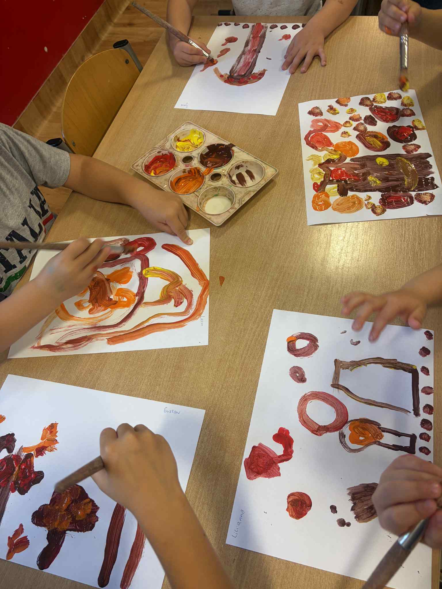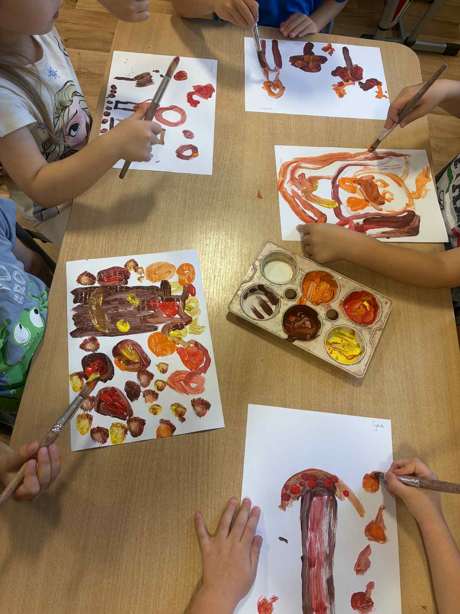 Dziś Leluki Czerwone stworzyły barwne prace plastyczne, inspirowane pięknem jesieni. Wykorzystaliśmy farby aby w pełni oddać kolory spadających liści, kasztanów, grzybów i jesiennego krajobrazu. Powstały pełne wyobraźni i radości obrazy, które już od dziś zdobią naszą szatnię.