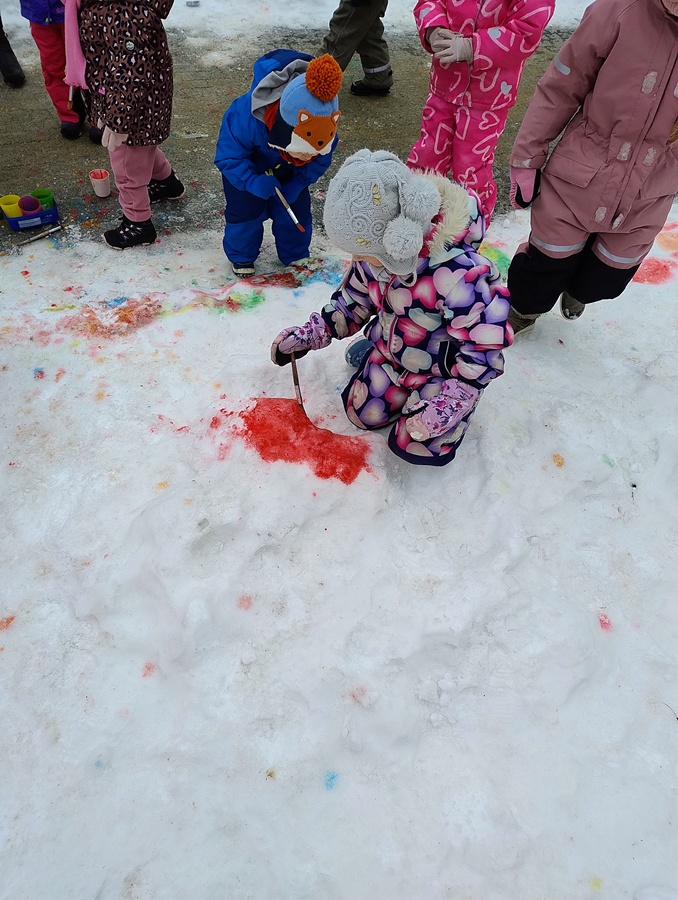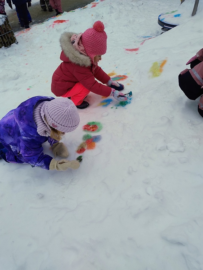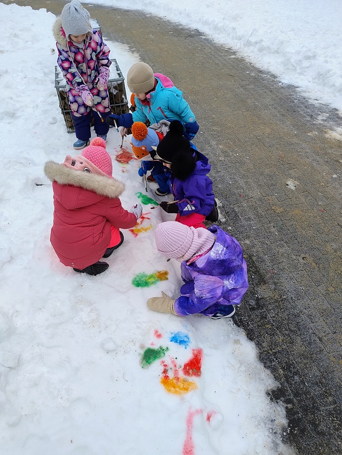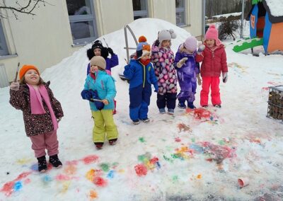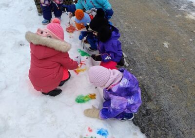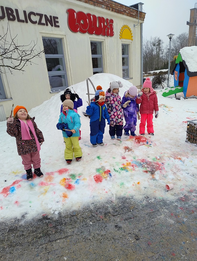 Podczas zimowych zabaw na dworze, dzieci malowały na śniegu kolorowymi farbami. Chcieliśmy wspólnie ożywić i pokolorować biały, zimowy krajobraz, a przy okazji rozwijać kreatywność, sprawność manualną oraz wrażliwość artystyczną. Zabawa była też doskonałą okazją do eksperymentowania z kolorami i czerpania radości z twórczego działania na łonie natury.