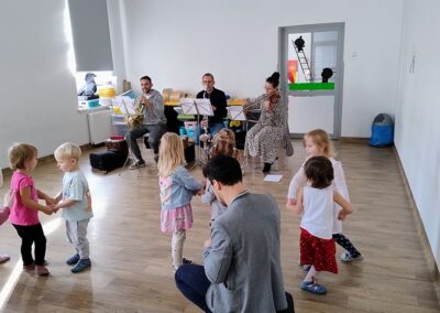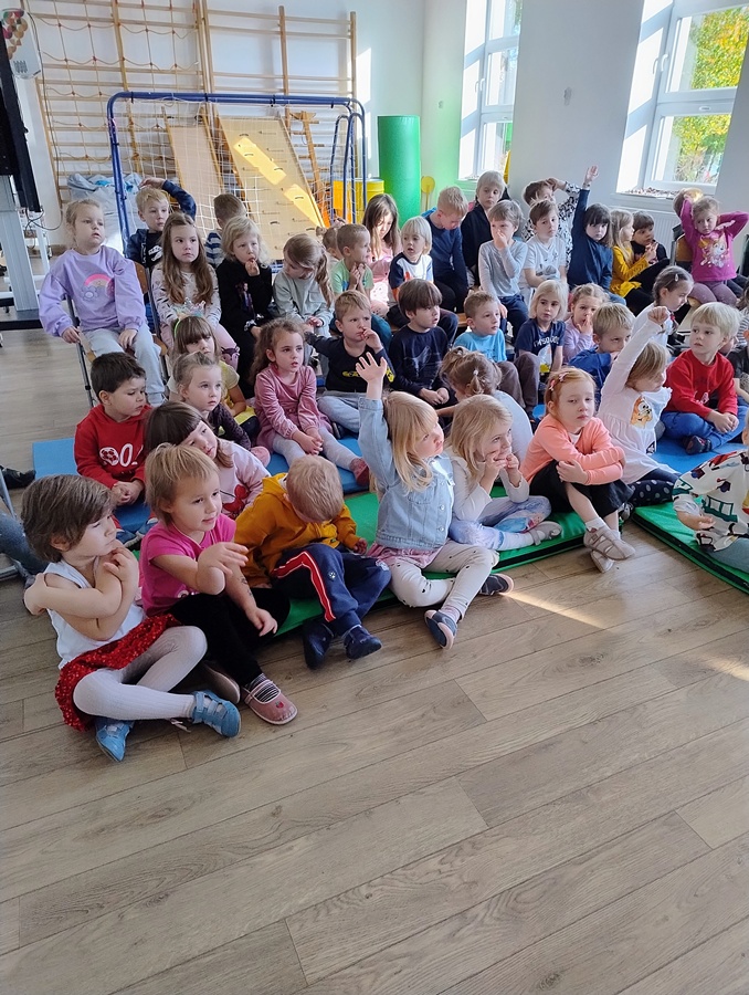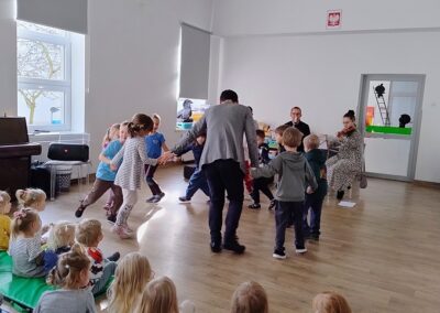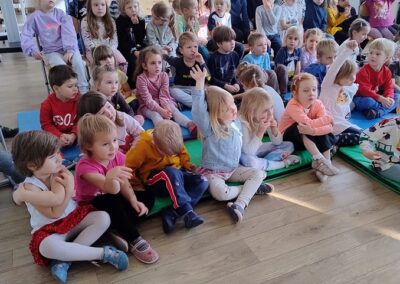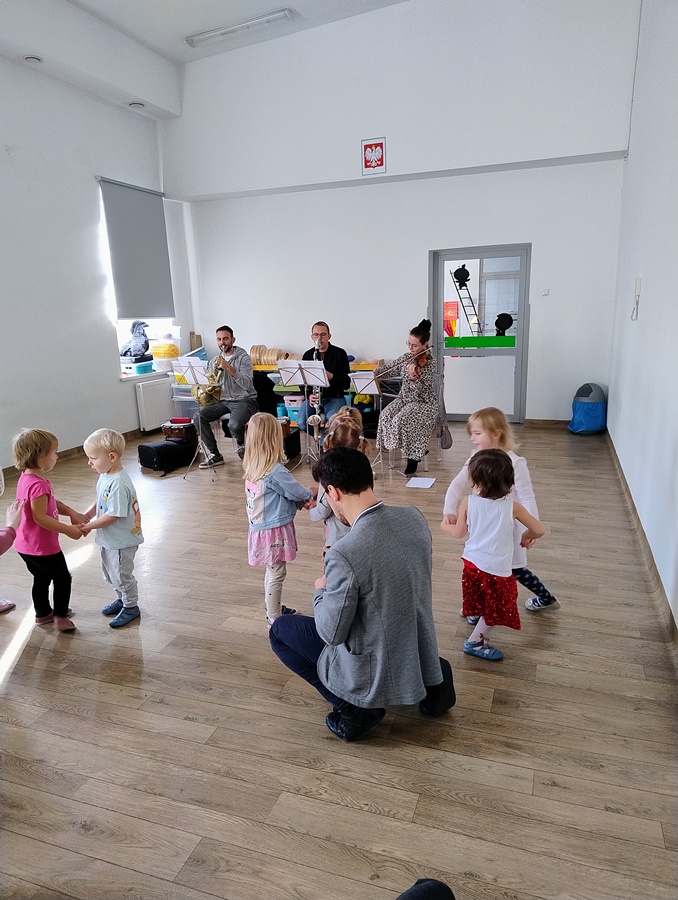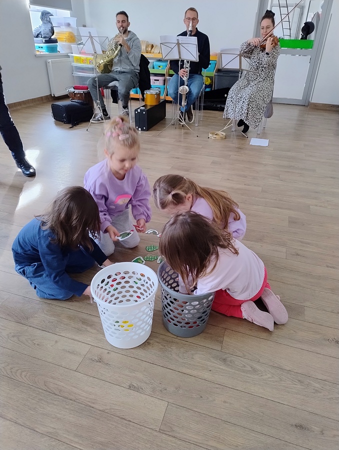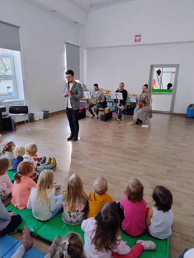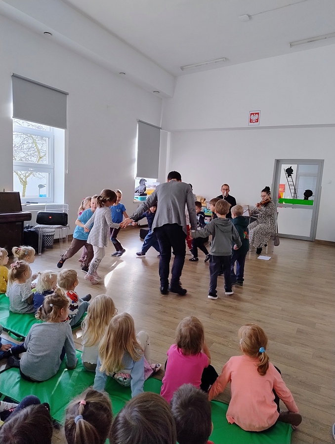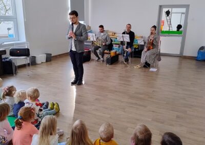 Dzisiaj w naszym przedszkolu, w ramach cyklu „Spotkania z Panią Muzyką”, odbył się koncert muzyczny pt. „Muzyka, kamera, akcja”. Muzycy z Warmińsko- Mazurskiej Filharmonii im. Feliksa Nowowiejskiego w Olsztynie zaprezentowali nam utwory znane z filmów. Leluki aktywnie uczestniczyły w zabawach rytmicznych i muzycznych prowadzonych przez artystów. To była prawdziwa muzyczna podróż pełna radości i uśmiechów- dzieci dały się porwać dźwiękom muzyki filmowej.