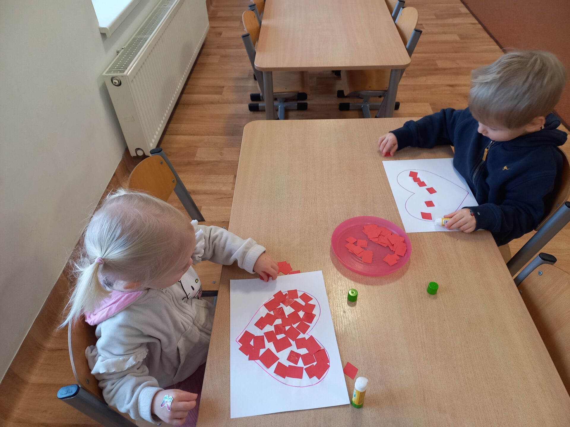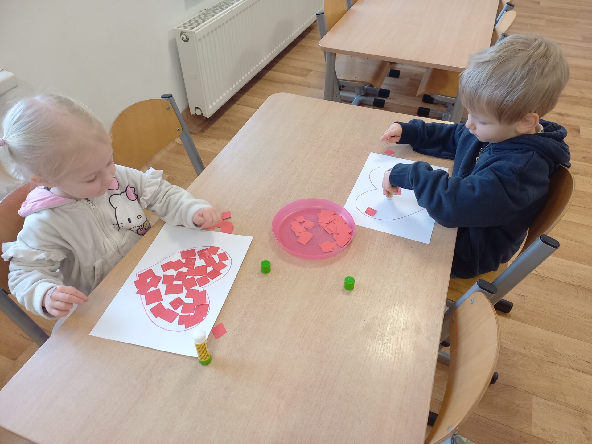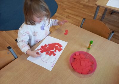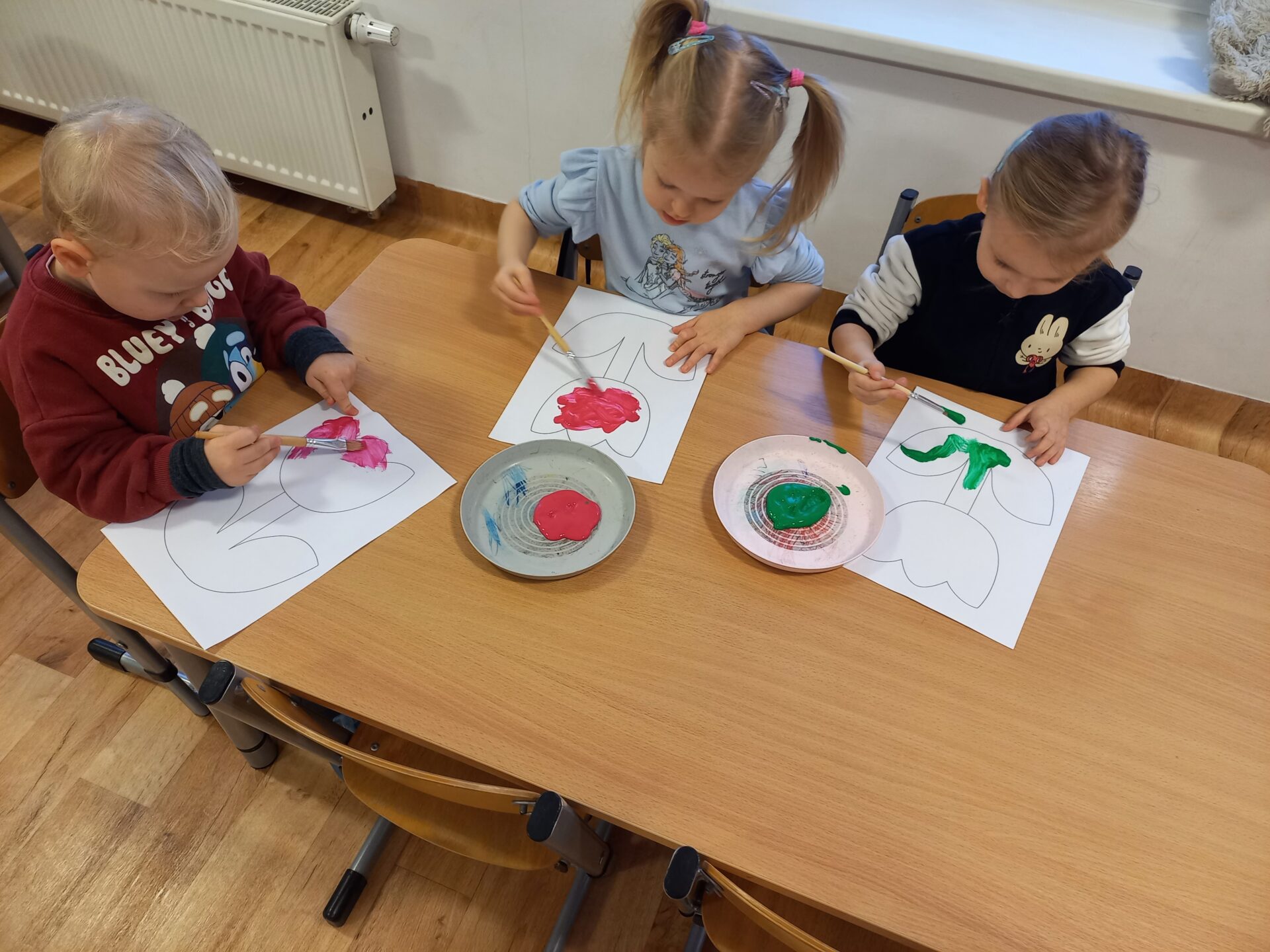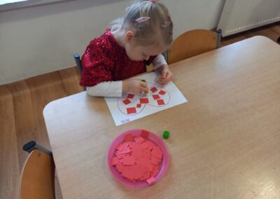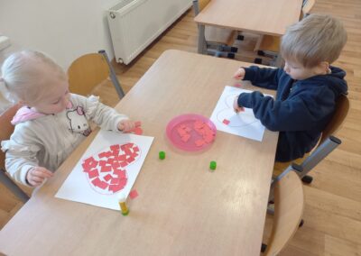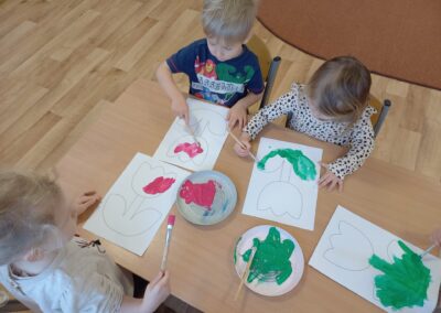 Podczas zajęć plastycznych przedszkolaki z radością malowały kwiatki farbami oraz wyklejały serduszka.