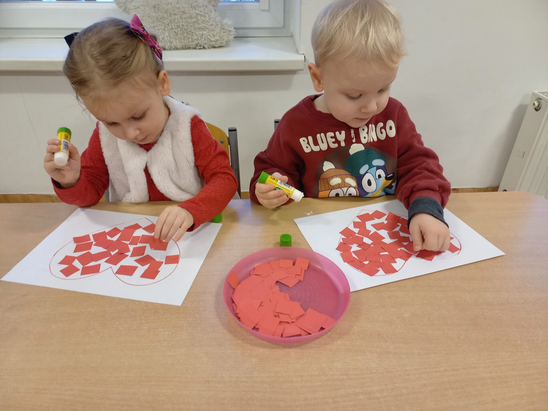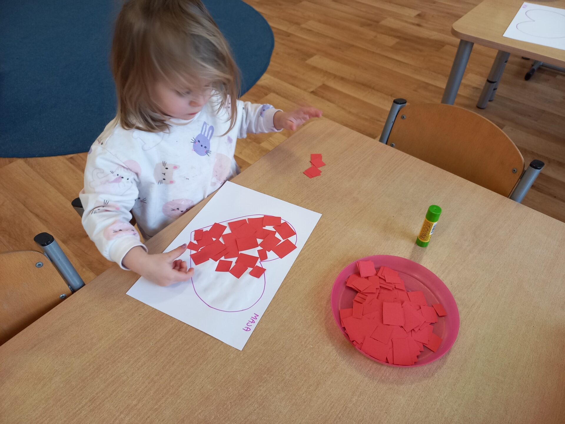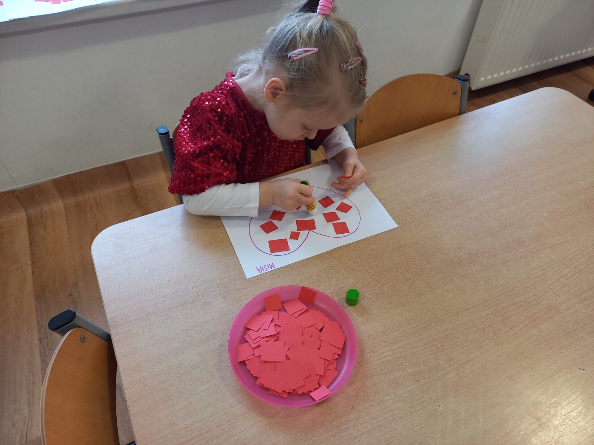 Podczas zajęć plastycznych przedszkolaki z radością malowały kwiatki farbami oraz wyklejały serduszka.