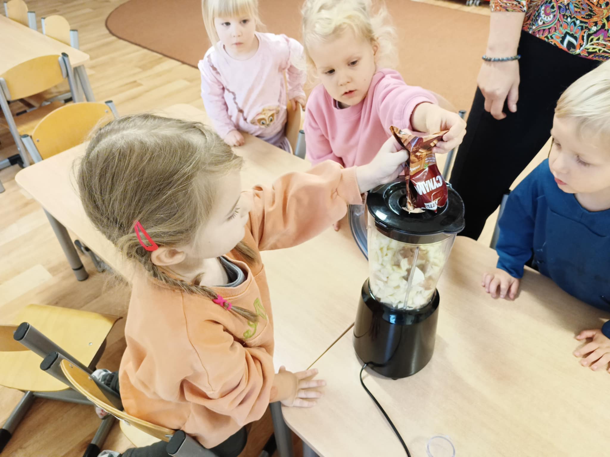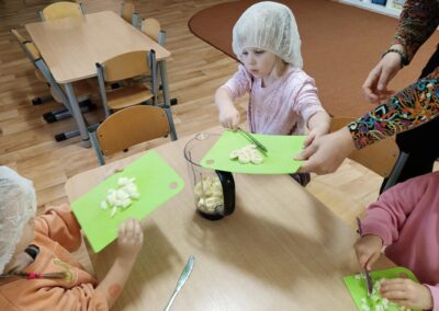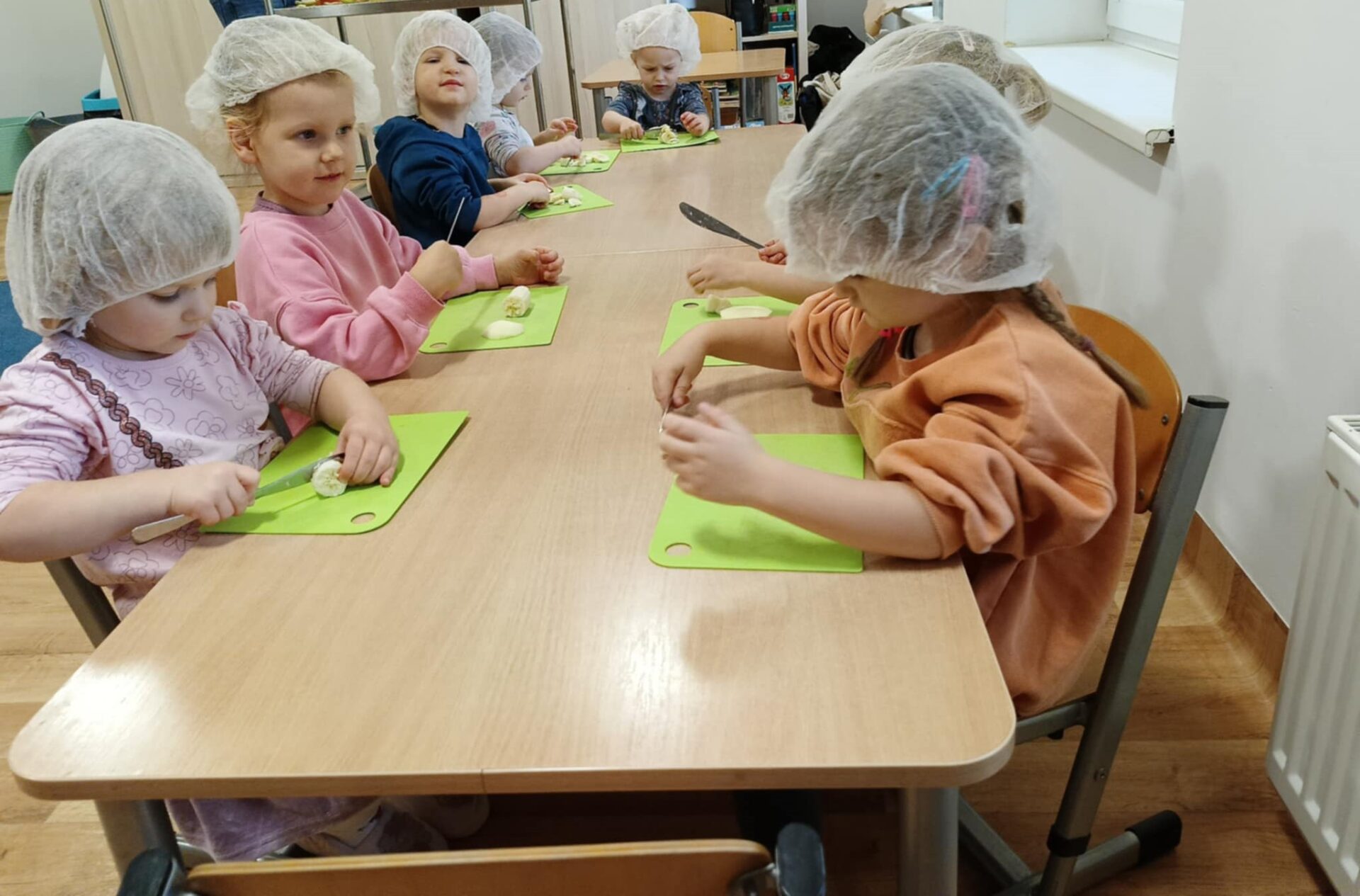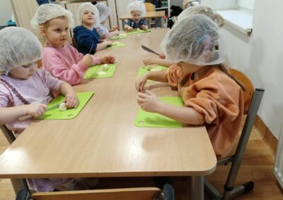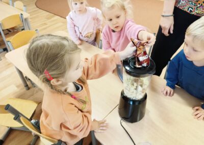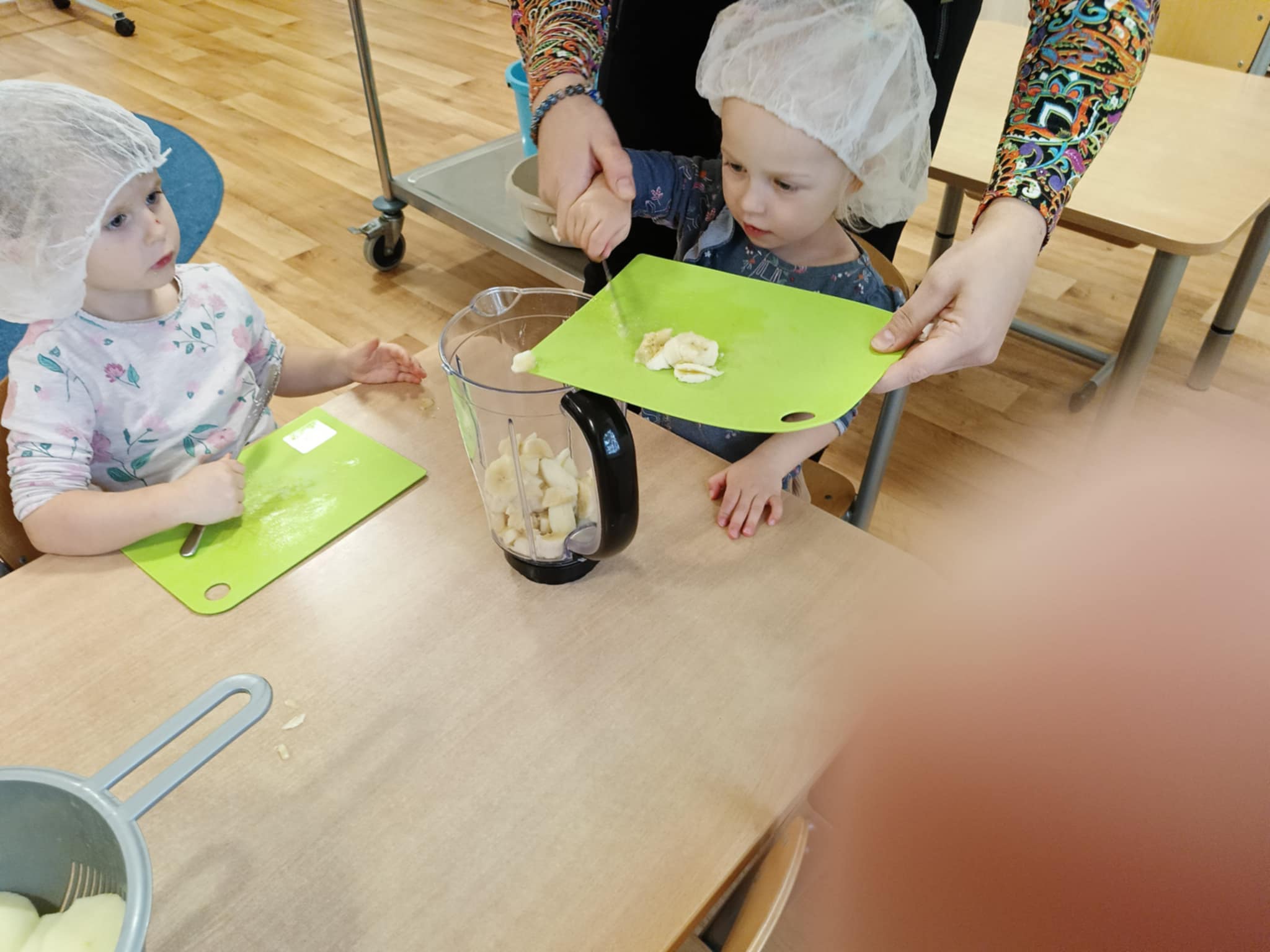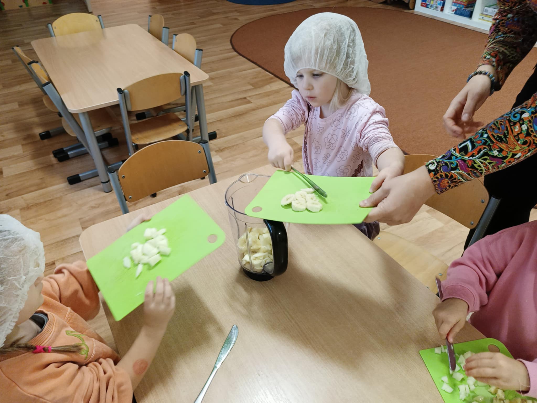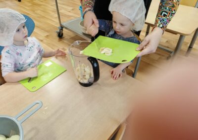 Zajęcia miały na celu rozwijanie zainteresowań kulinarnych dzieci, kształtowanie zdrowych nawyków żywieniowych oraz wspieranie samodzielności i wiary we własne możliwości. Podczas warsztatów przedszkolaki z dużym zaangażowaniem uczestniczyły w przygotowaniu zdrowego deseru. Warsztaty kulinarne były doskonałą okazją do rozwijania małej motoryki, koncentracji uwagi oraz umiejętności współpracy w grupie. Wspólne przygotowanie musu przyniosło dzieciom wiele radości i satysfakcji z własnej pracy, a degustacja była pysznym zwieńczeniem zajęć.