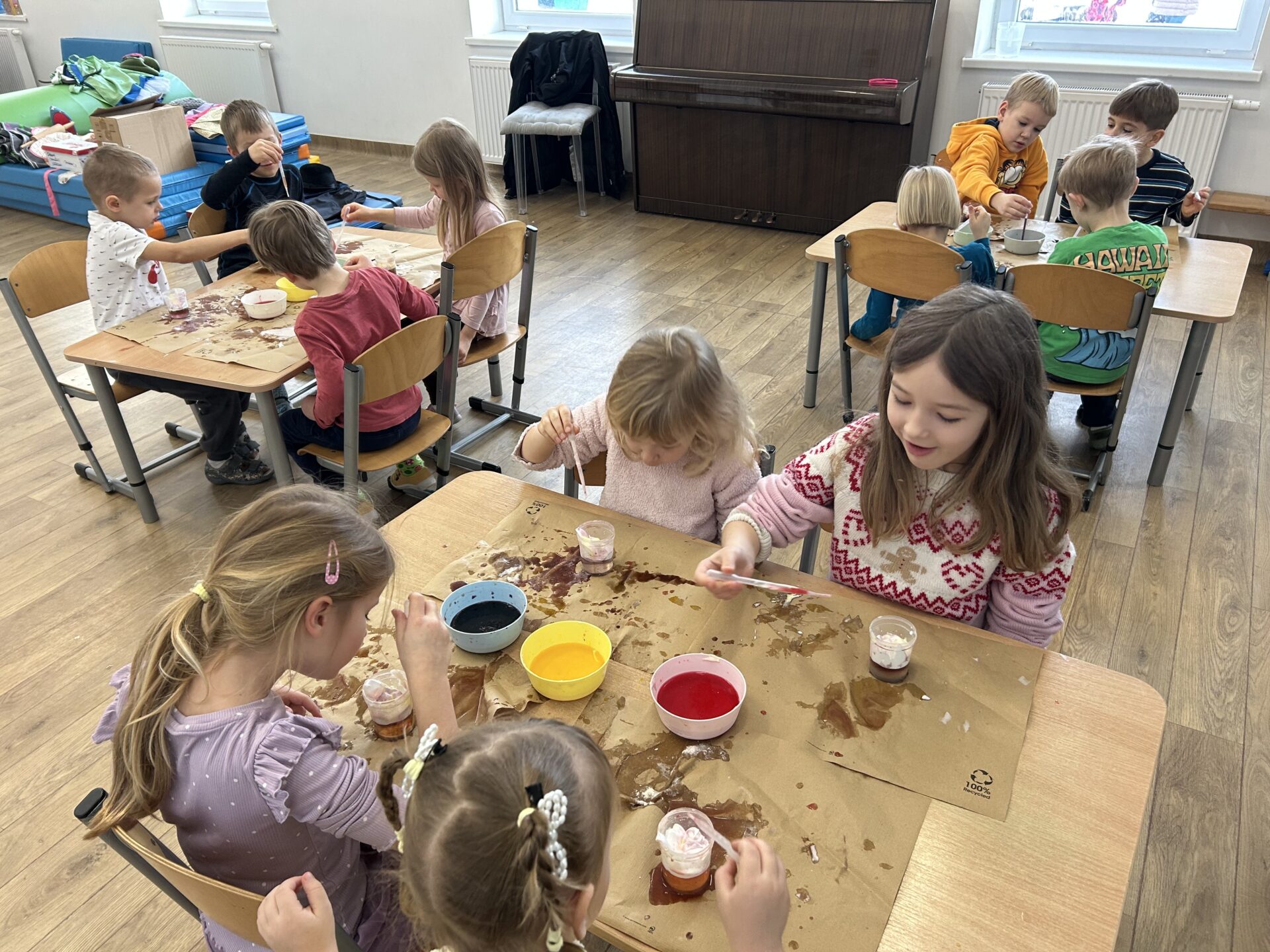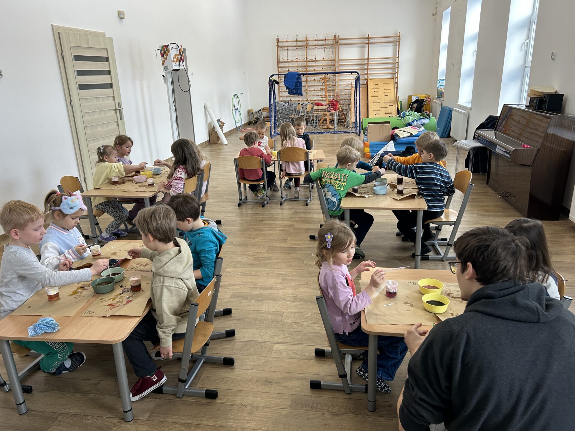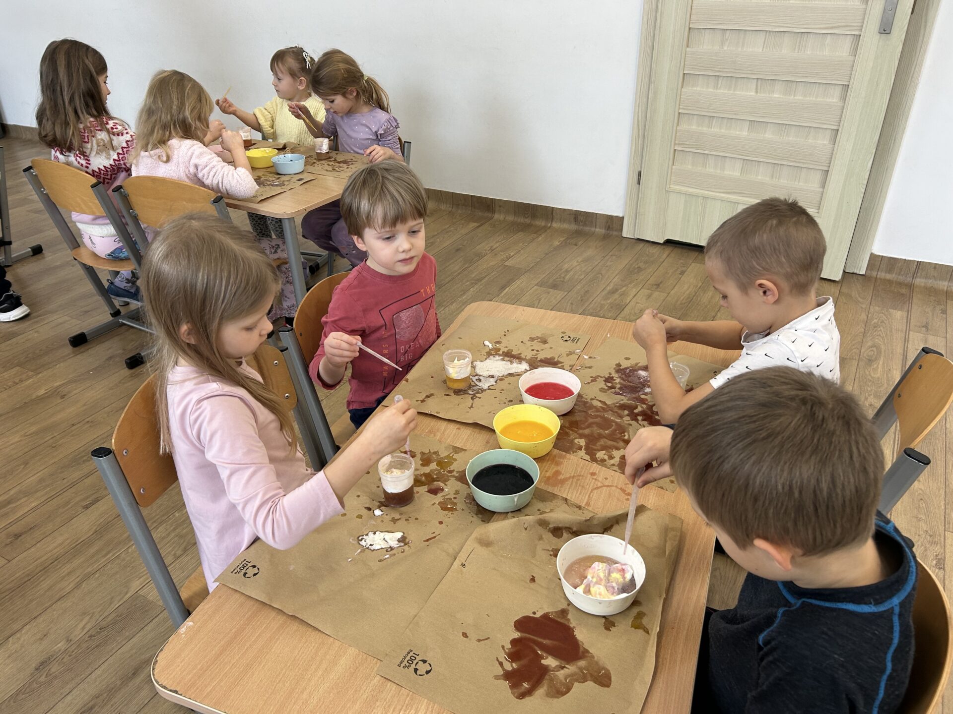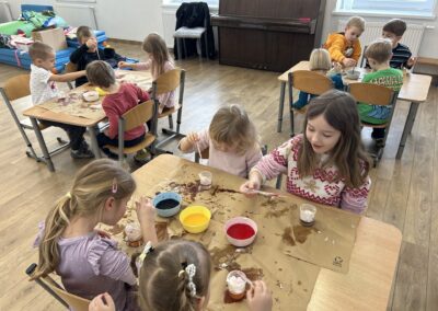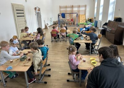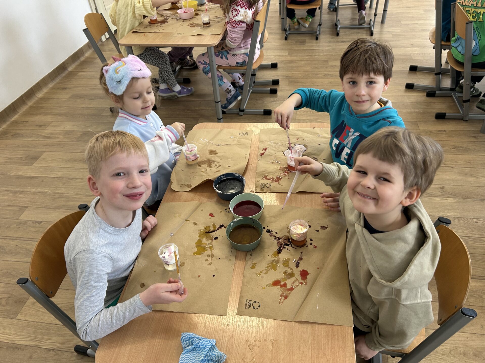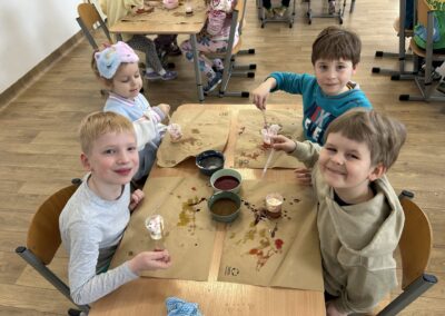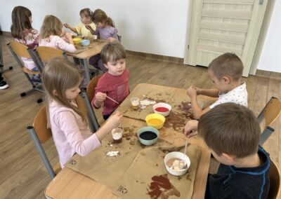 Dzisiejsze warsztaty badawcze przeniosły dzieci w świat nauki poprzez doświadczenie „Deszcz w kubku”. Przedszkolaki, krok po kroku, odkrywały jak działa dyfuzja, gęstość cieczy oraz grawitacja, obserwując zjawiska, które na co dzień pozostają niewidoczne. Z wykorzystaniem wody, pianki i barwników dzieci stworzyły niezwykły efekt kolorowego deszczu, ucząc się poprzez eksperymentowanie, zadawanie pytań i formułowanie pierwszych wniosków. Proces przenikania cieczy do cieczy zamienił się w fascynującą lekcję przyrody i fizyki w wersji „mini”. To była nauka w ruchu, w kolorze i z prawdziwym efektem „wow” – bo najlepsze odkrycia zaczynają się od ciekawości.