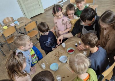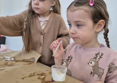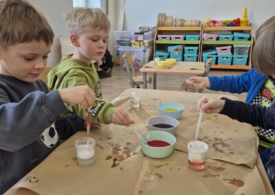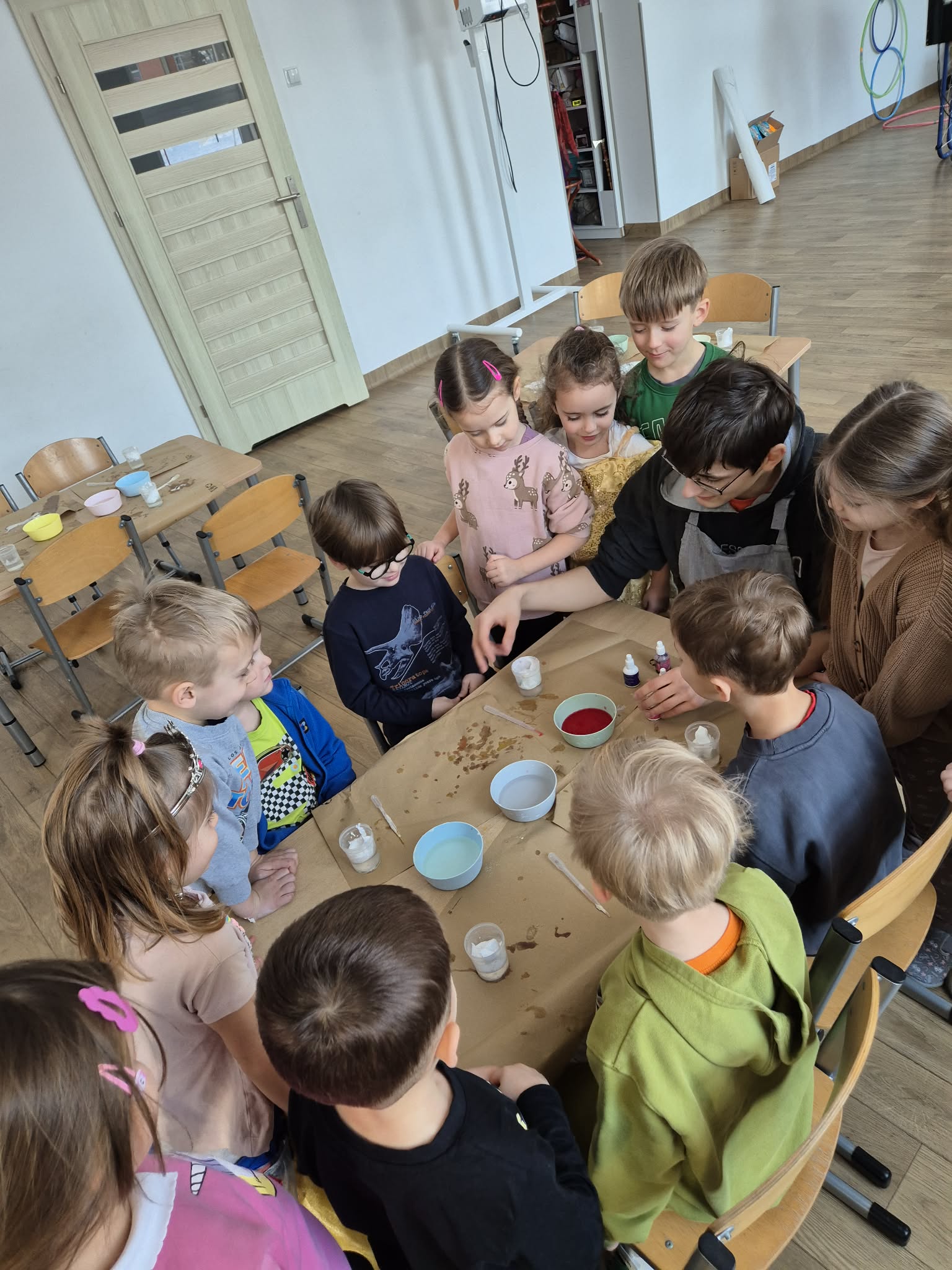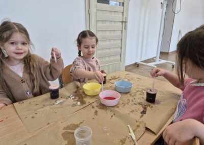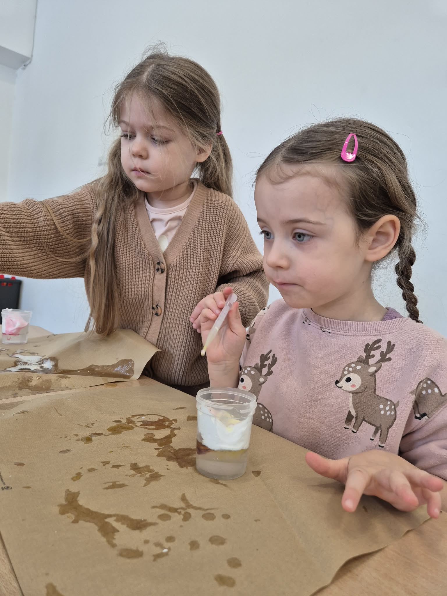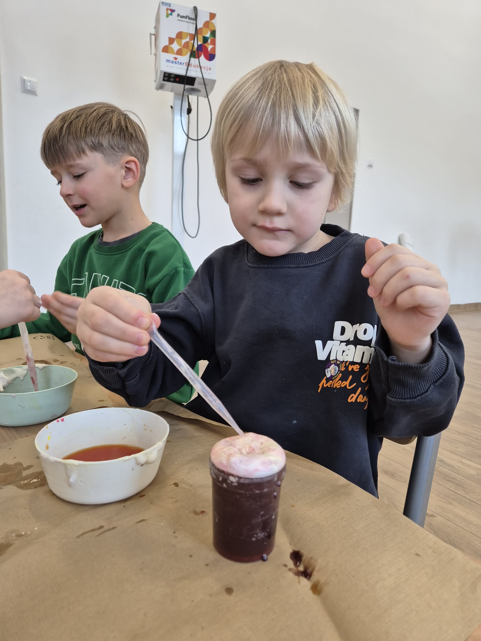 W piątek podczas warsztatów badawczych dzieci poprzez zabawę spotkały się ze zjawiskiem dyfuzji. Przy użyciu wody, pianki do golenia, barwników i pipet obserwowały, jak barwniki samoczynnie przemieszczają się i przenikają przez różne substancje, tworząc efekt „kolorowego deszczu” w kubeczkach. Eksperyment pozwolił dzieciom z bliska zobaczyć, jak zachowują się cząsteczki i jak działa dyfuzja w praktyce.