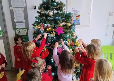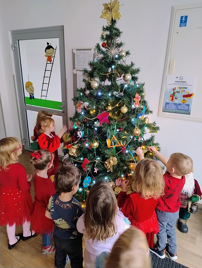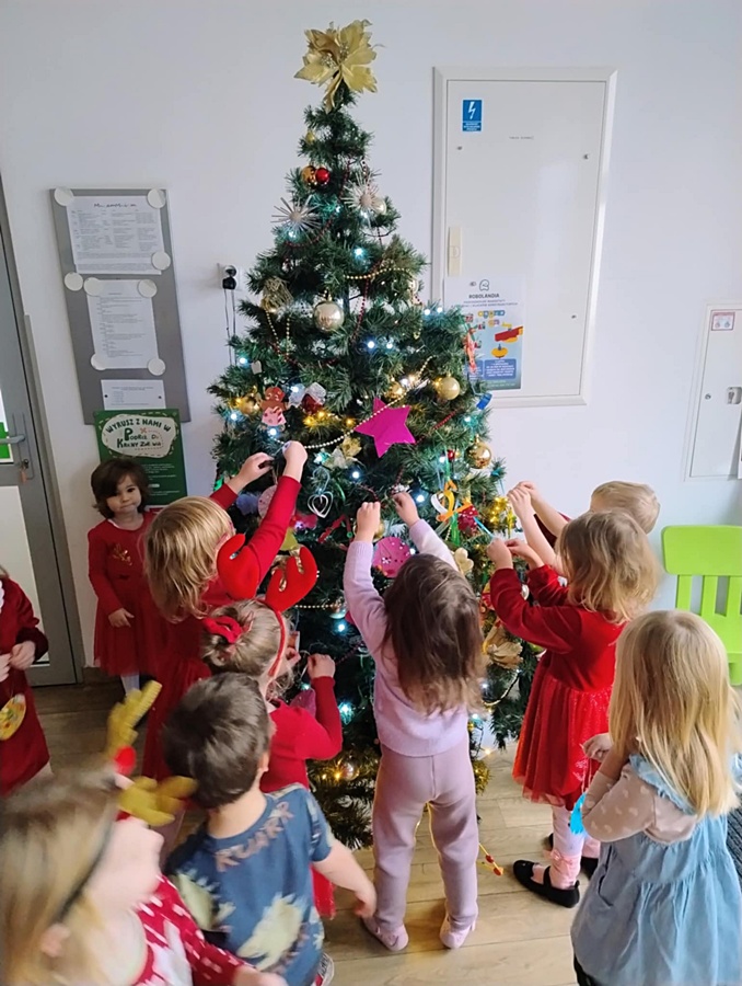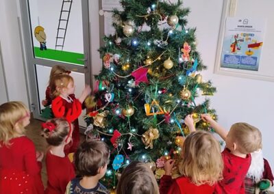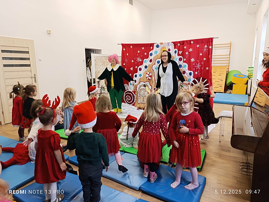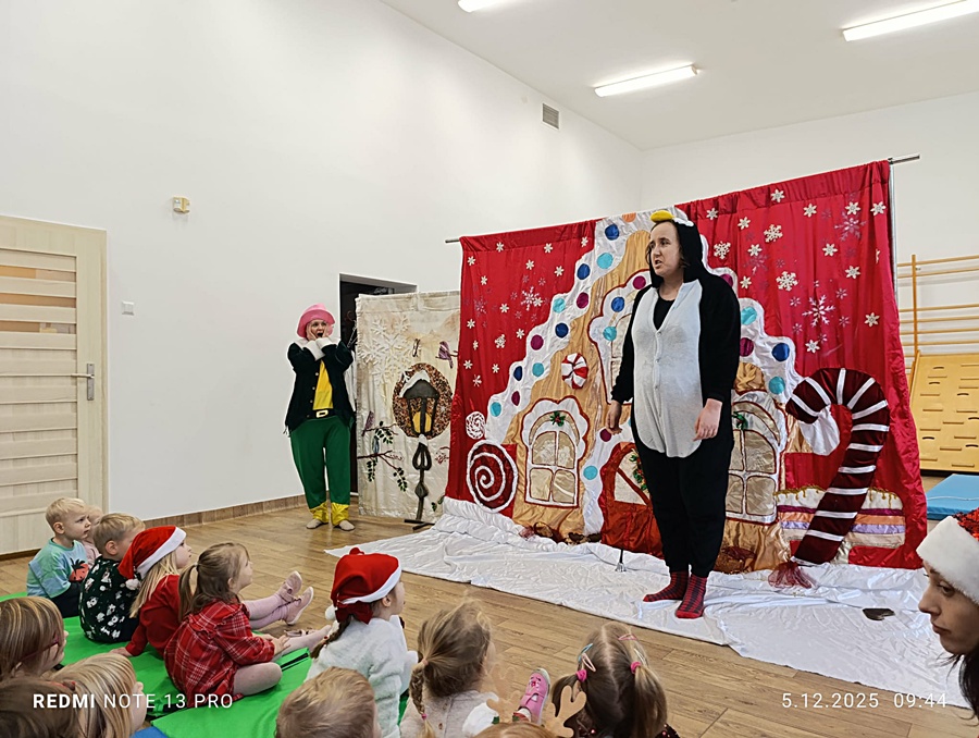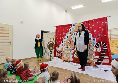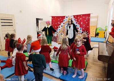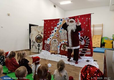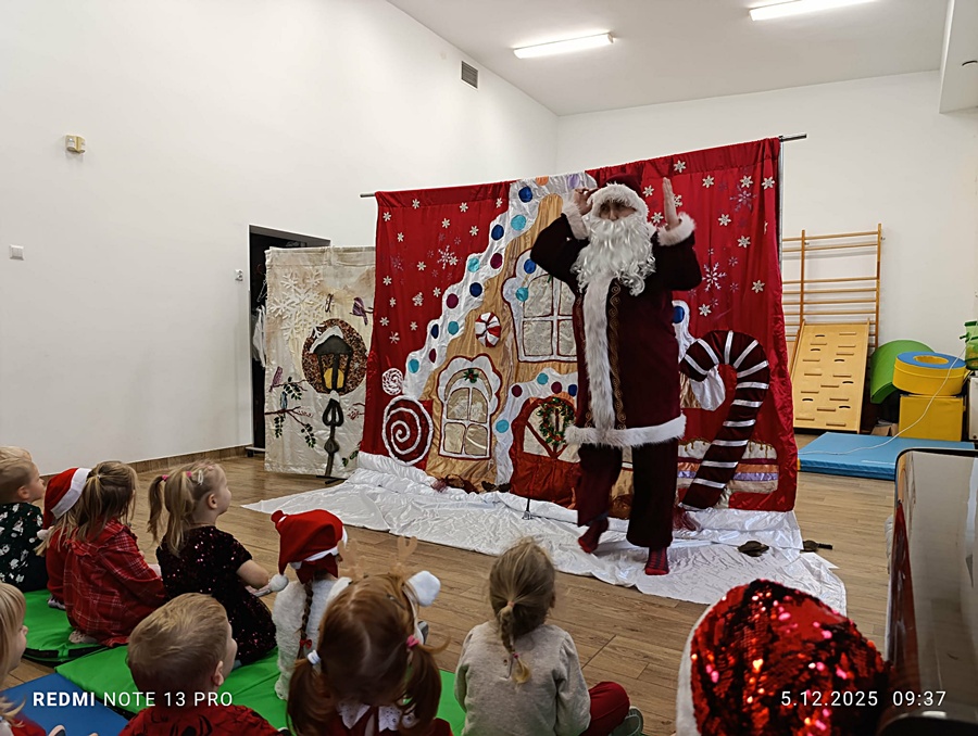 Piątek był dniem pełnym atrakcji i emocji! Leluki Turkusowe pomagały przy ubieraniu choinki własnoręcznie zrobionymi ozdobami, w naszym przedszkolu odbył się teatrzyk pt. „Święty Mikołaj w opałach” w wykonaniu aktorów ze Studia Artystycznego Magik oraz odwiedził nas długo wyczekiwany gość- Mikołaj. Na koniec każde dziecko otrzymało prezent od Mikołaja.