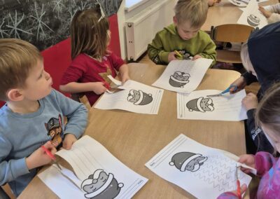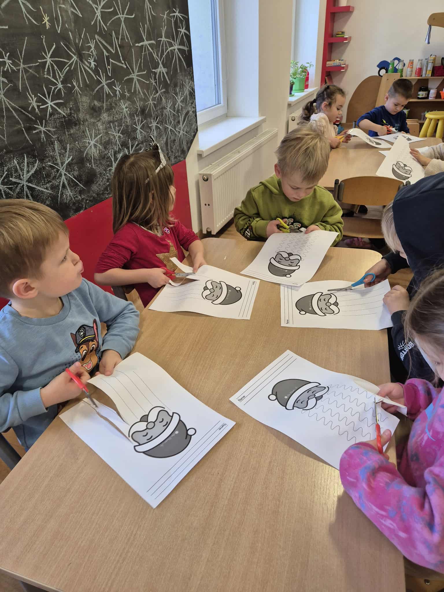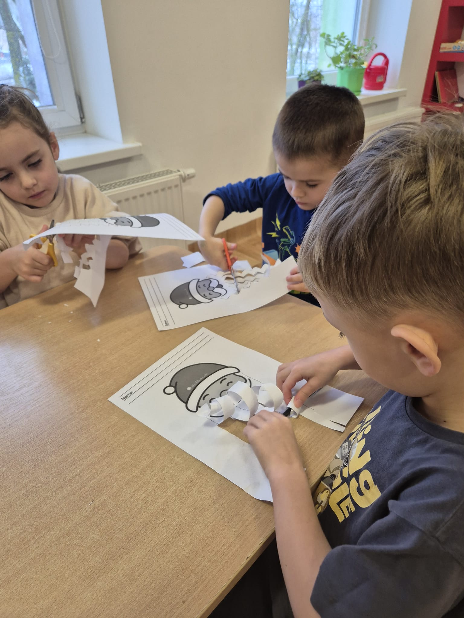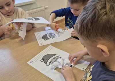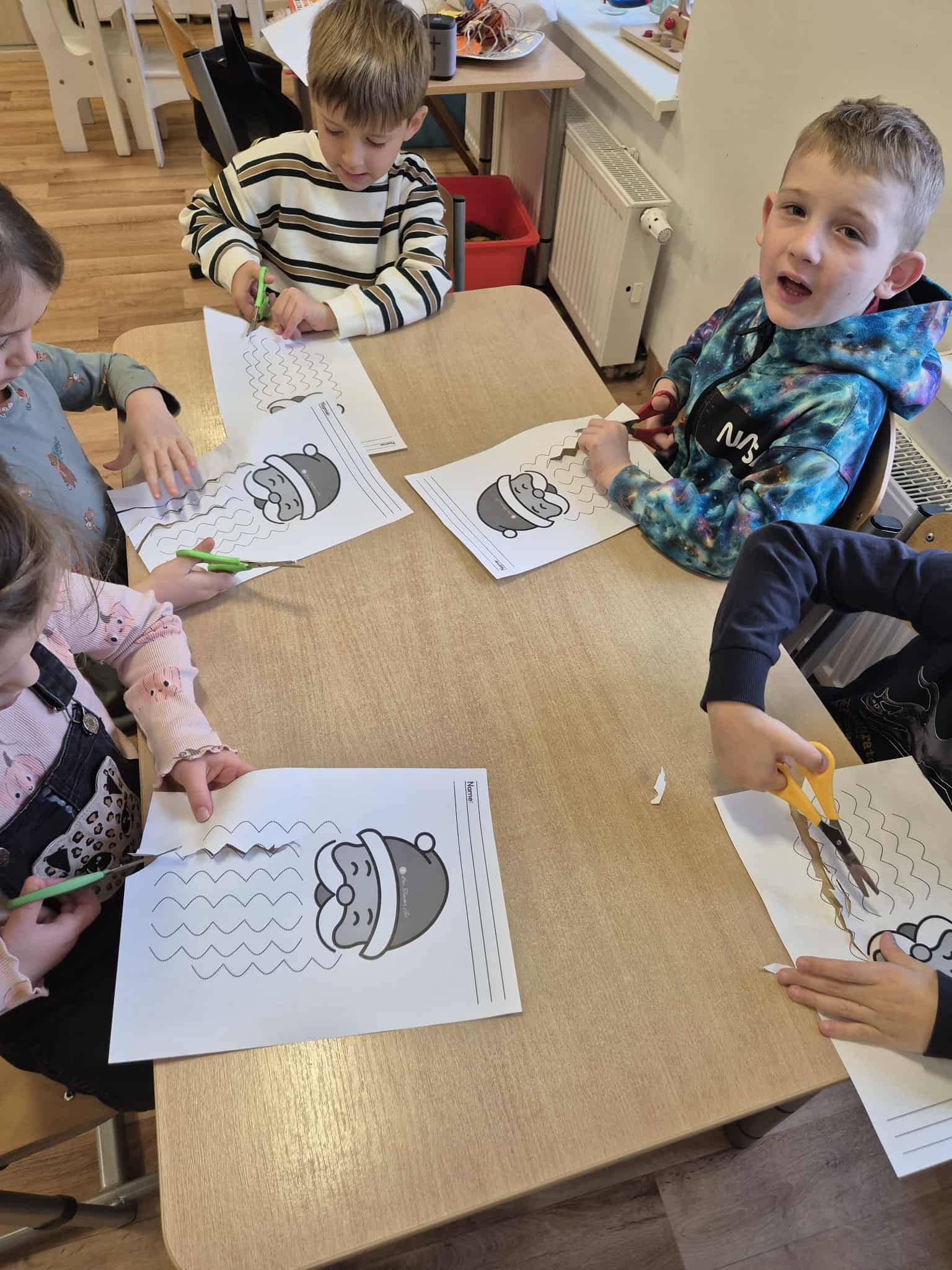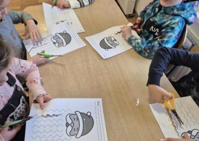 Dodatkowo poradziliśmy sobie z niesfornymi brodami Mikołajów – dzieci wycinały je nożyczkami, ćwicząc w ten sposób motorykę małą, precyzję ruchów i koncentrację. 🎅✂️