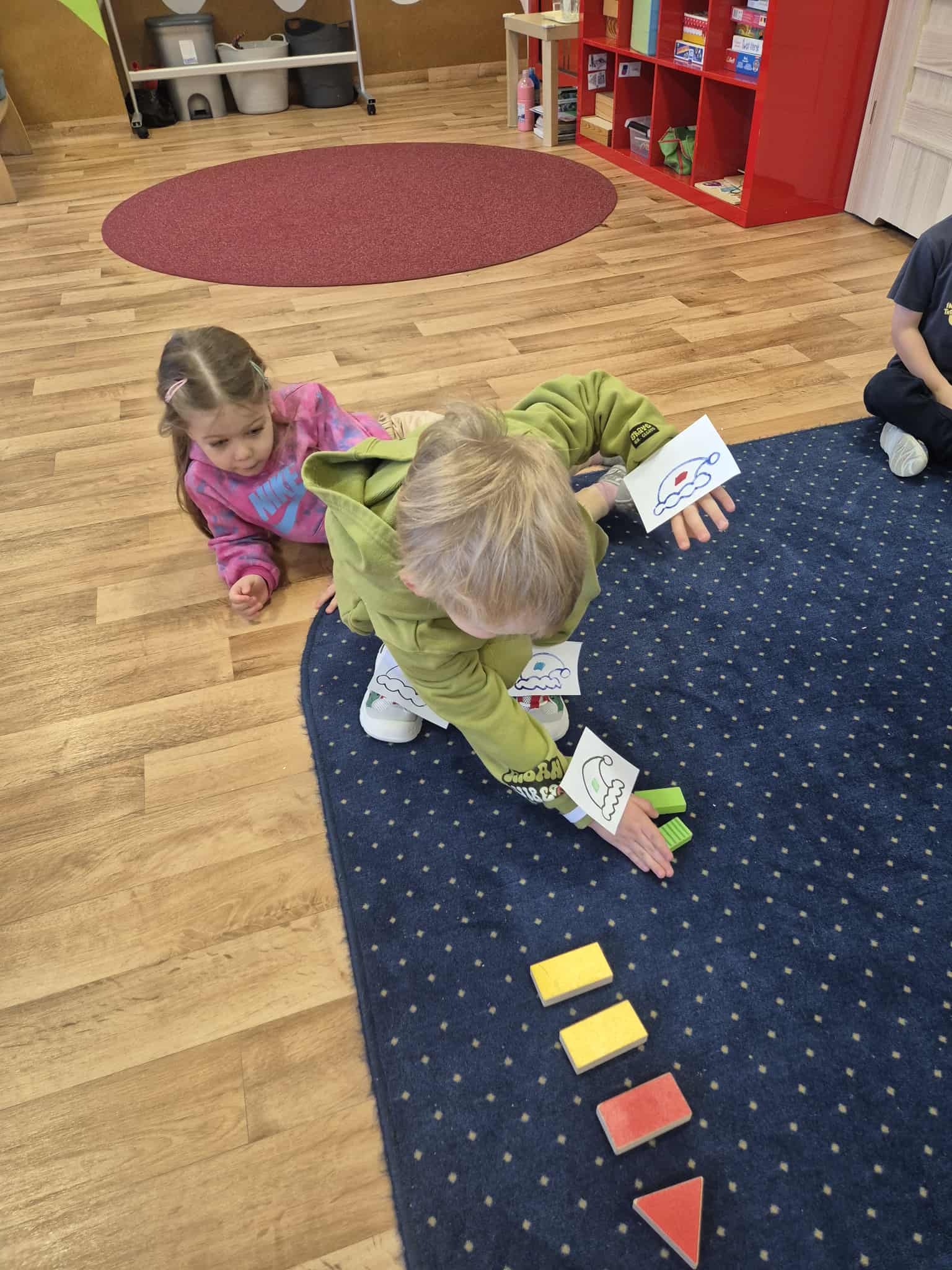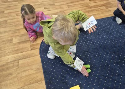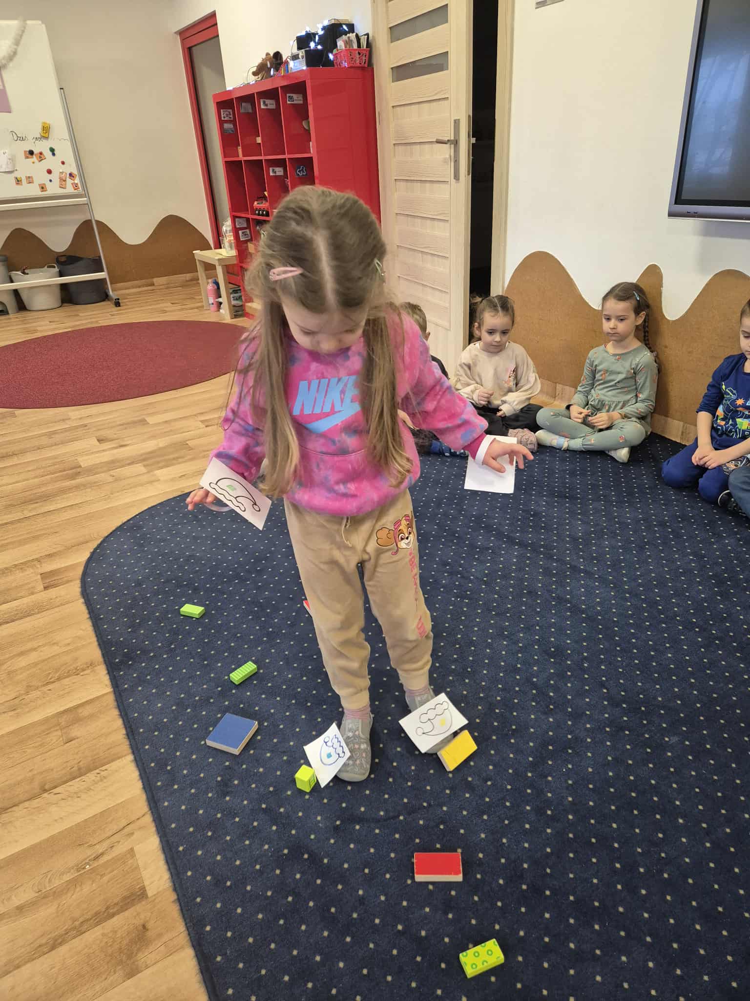 Dziś Leluki Czerwone zmierzyły się z „czapeczkowym wyzwaniem” – dzieci rozwijały koordynację wzrokowo–ruchową, pokonując specjalny tor. Każda kończyna miała przypisany kolor, np. prawa ręka – czerwony, i zadaniem dzieci było przesuwać odpowiedni klocek właściwą kończyną, zgodnie z „zakodowanym” kolorem.