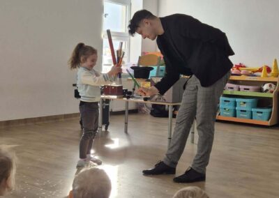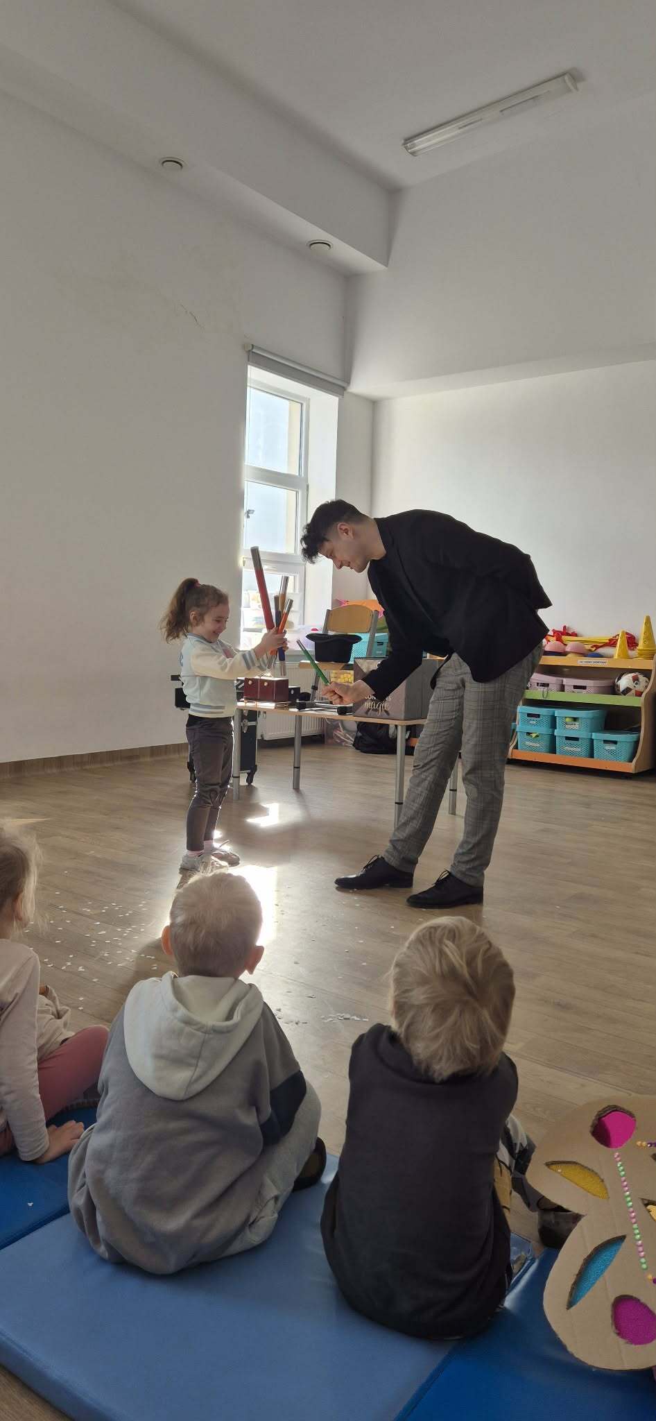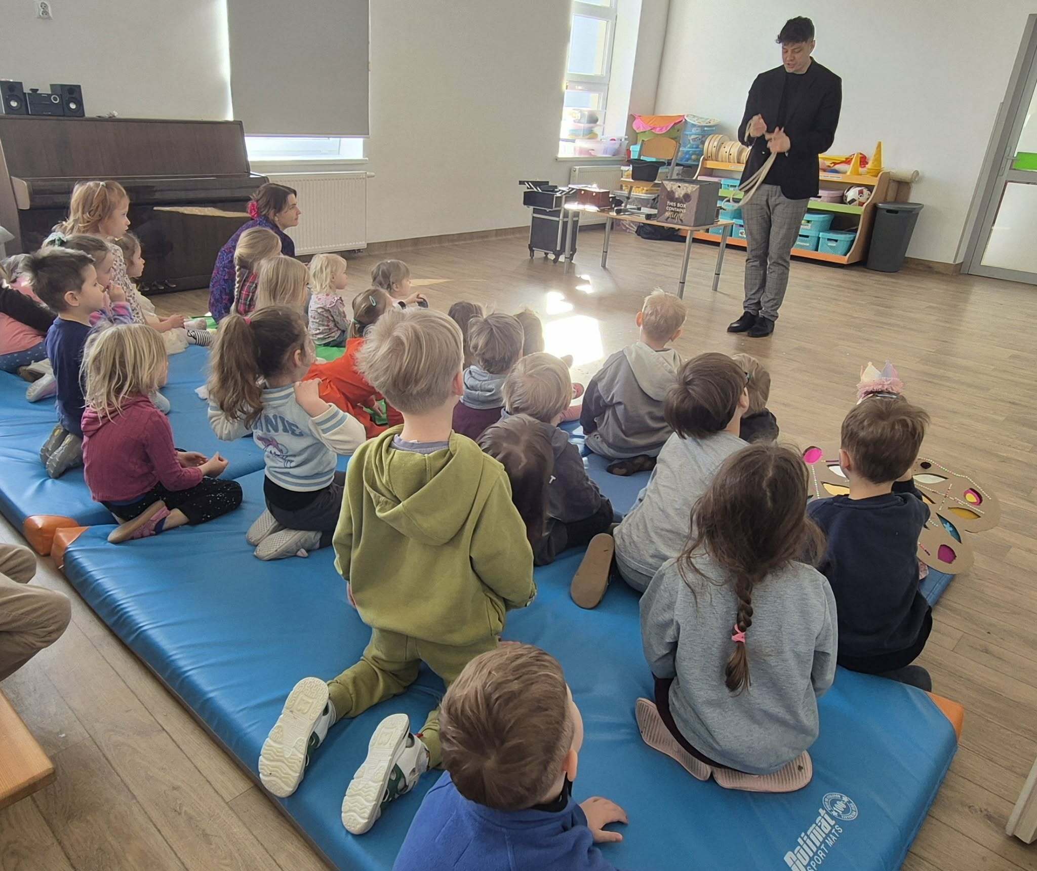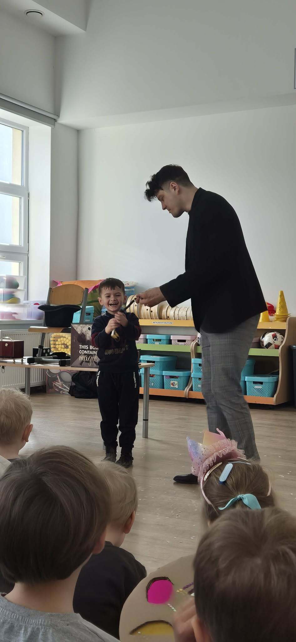W czwartek (19.03.2026) w naszym przedszkolu odbył się wyjątkowy występ magika z grupy Artyści Maccino, który dostarczył dzieciom mnóstwo radości i niezapomnianych wrażeń. Podczas pokazu dzieci mogły zobaczyć niezwykłe sztuczki oraz magiczne iluzje, które wzbudzały duże zainteresowanie i wiele uśmiechów.