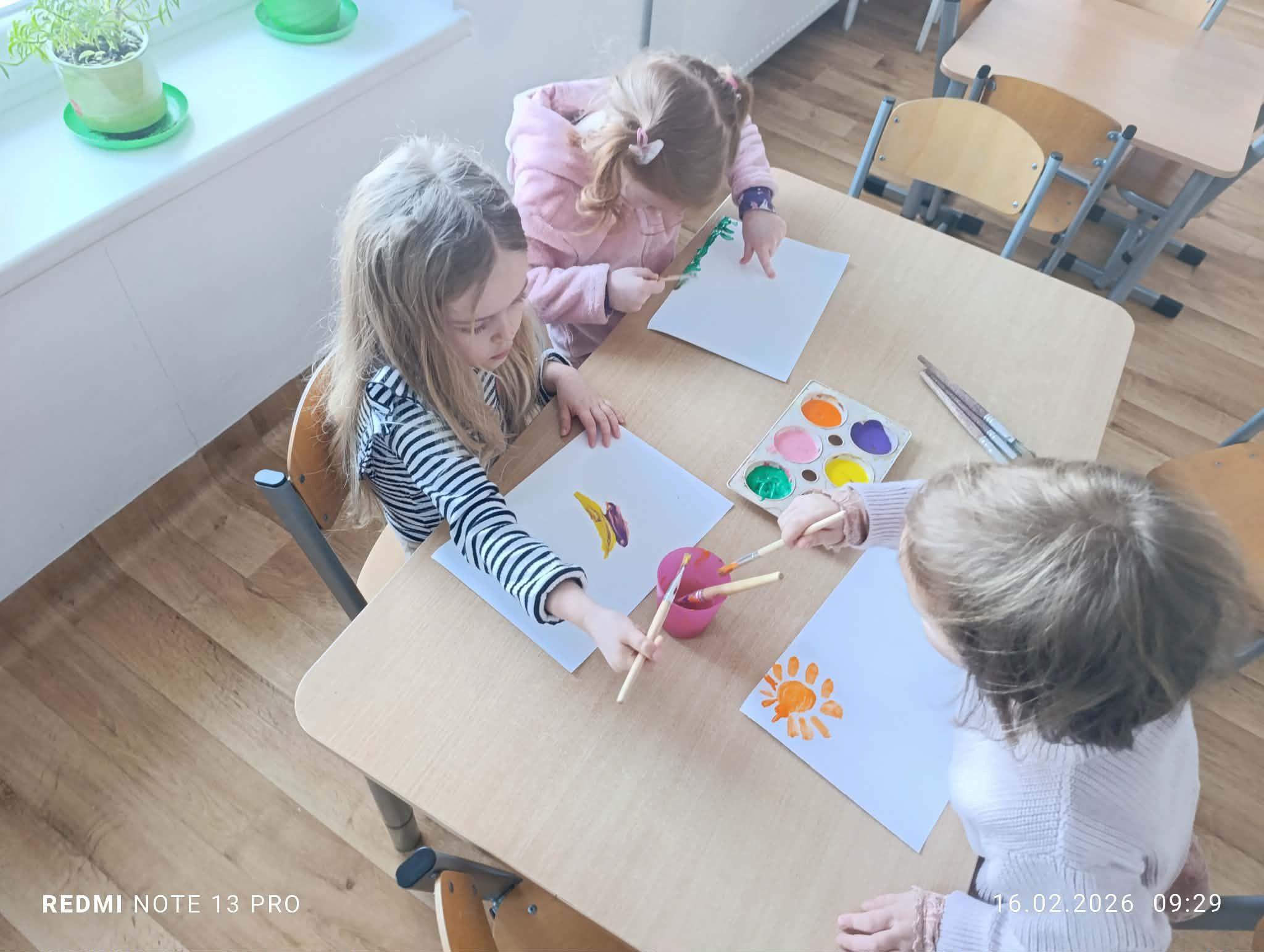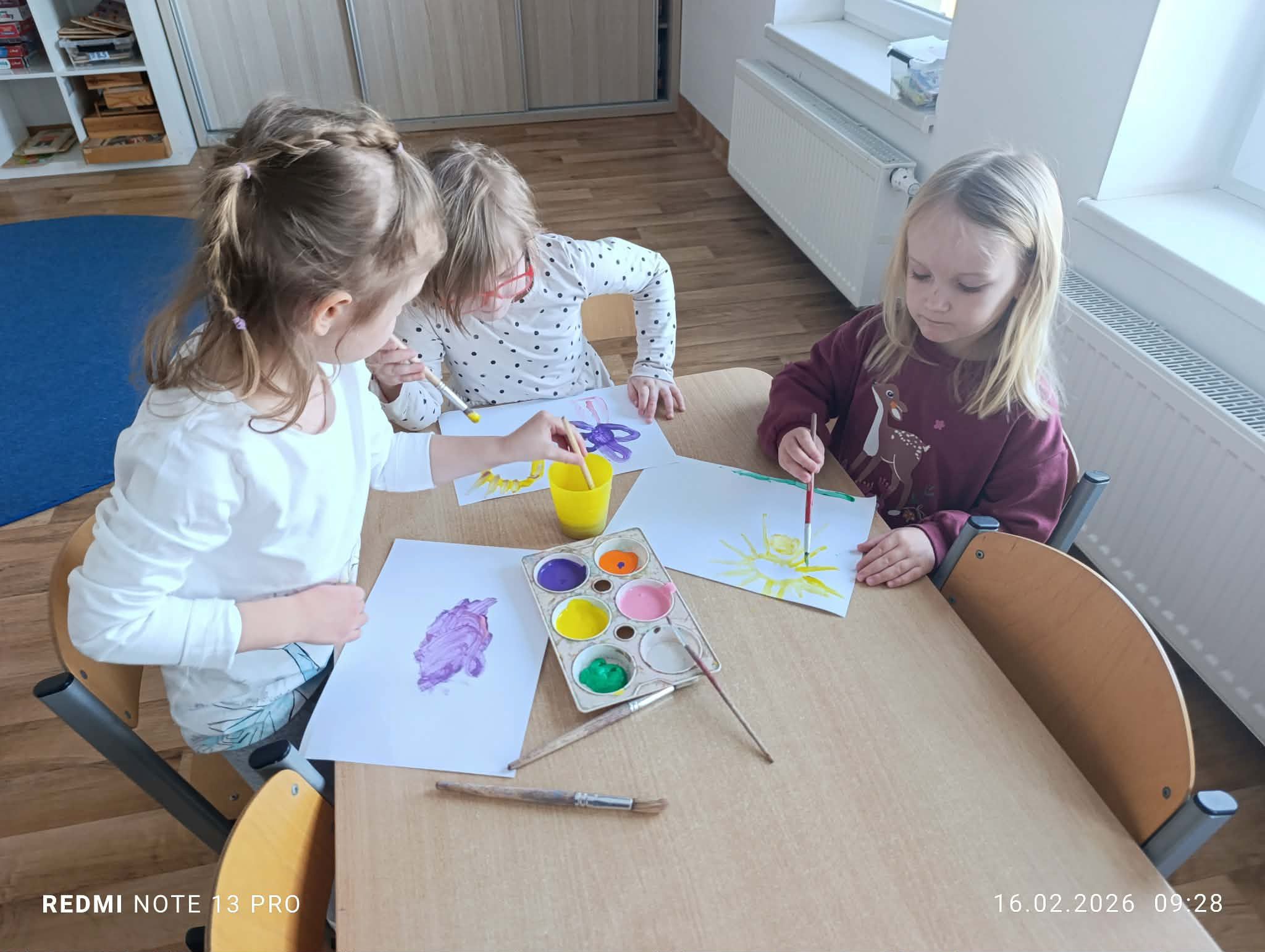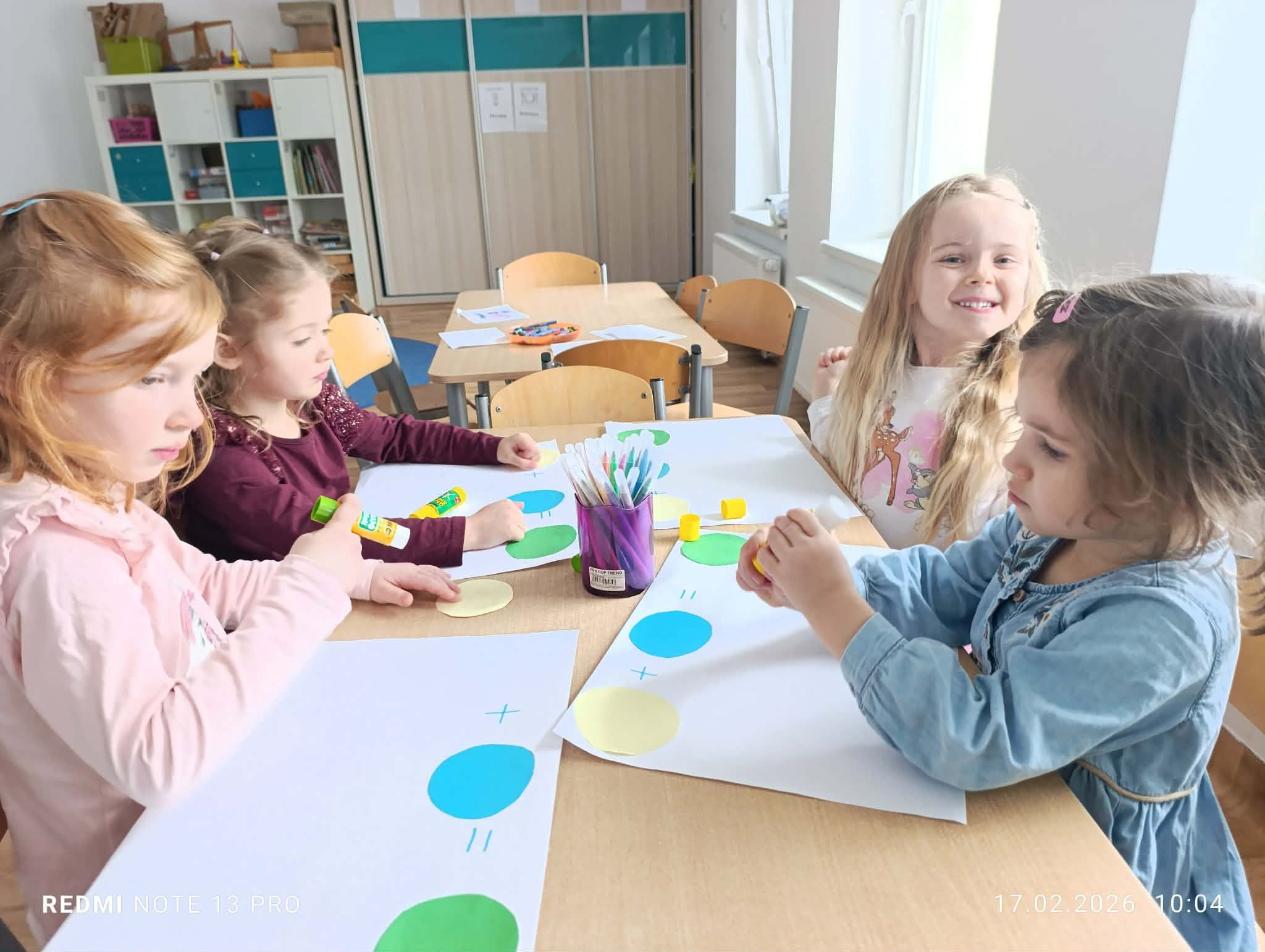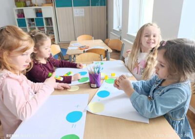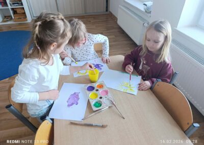 Podczas zajęć dzieci odkrywały świat barw poprzez twórczą zabawę farbami. Samodzielnie tworzyły swoje dzieła, eksperymentowały z mieszaniem kolorów oraz utrwalały znajomość barw podstawowych i pochodnych. Przedszkolaki z radością obserwowały, jak z połączenia dwóch kolorów powstaje zupełnie nowa barwa, rozwijając przy tym wyobraźnię, kreatywność oraz sprawność manualną. Zajęcia były także okazją do wyrażania emocji poprzez sztukę, współpracy w grupie oraz czerpania satysfakcji z własnej twórczości. Powstałe prace są pełne koloru, dziecięcej radości i dumy z wykonanych dzieł.