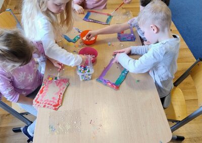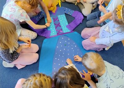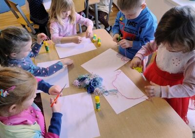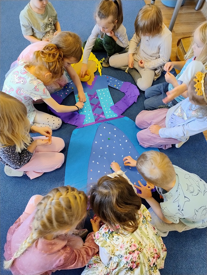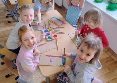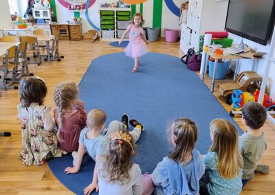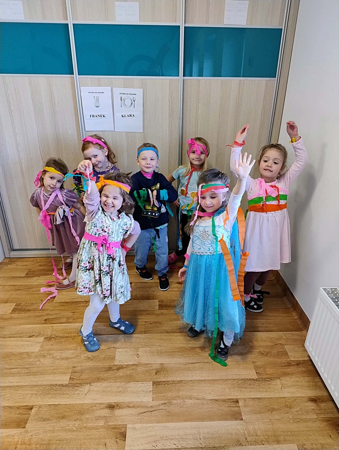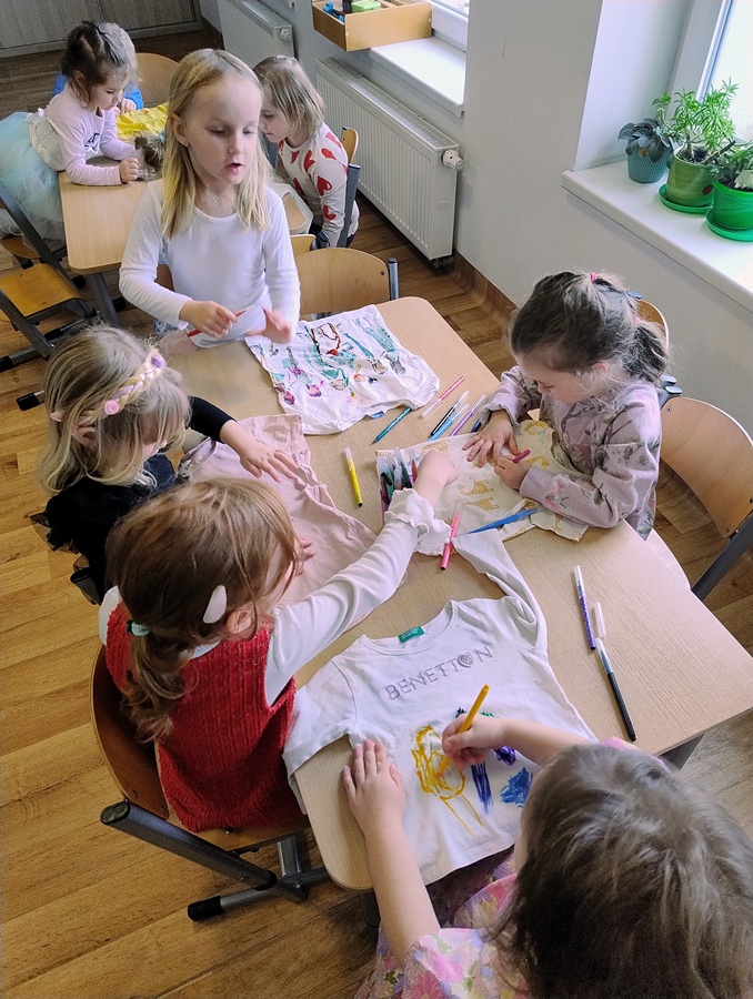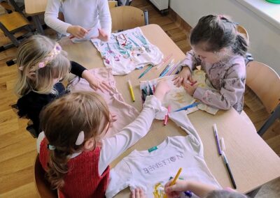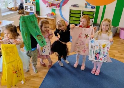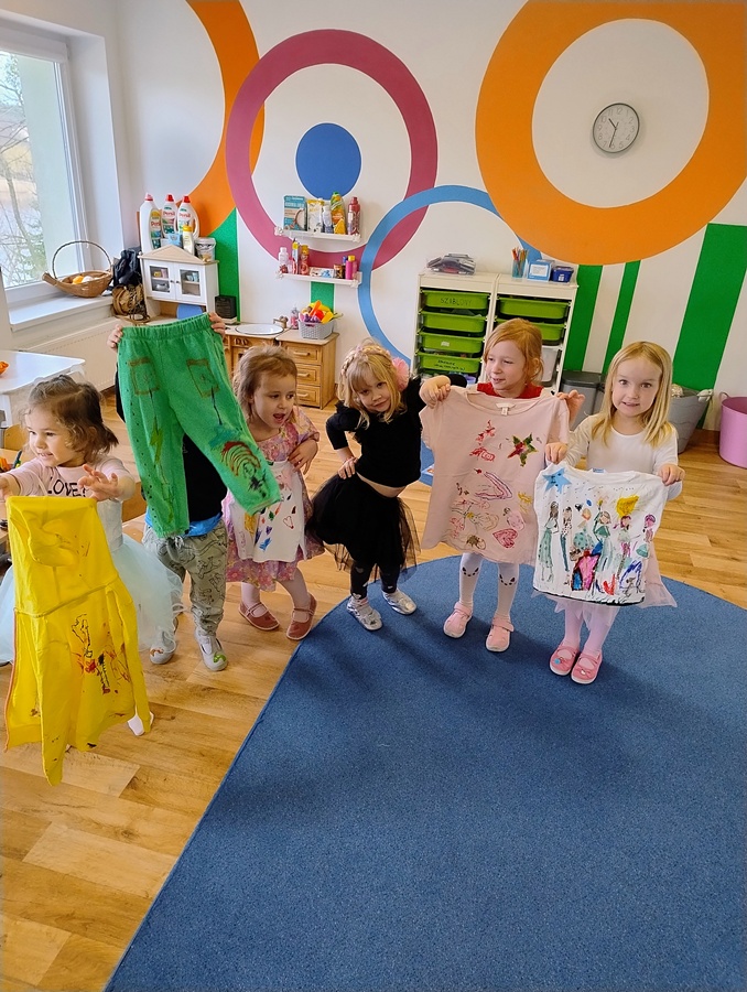 Poznaliśmy ubrania z różnych epok, sprawdziliśmy jak zmieniała się moda w Polsce na przestrzeni 100 lat. Projektowaliśmy i przerabialiśmy ubrania- dzieci stworzyły własne interpretacje dawnych strojów oraz nadały nowy wygląd starym i już niepotrzebnym ubraniom, co kształtowało swobodną ekspresję i twórcze myślenie. Zajęcia sprzyjały kształtowaniu postawy szacunku wobec historii, tradycji oraz różnorodności kulturowej, co pozwoliło dzieciom lepiej rozumieć otaczający je świat.