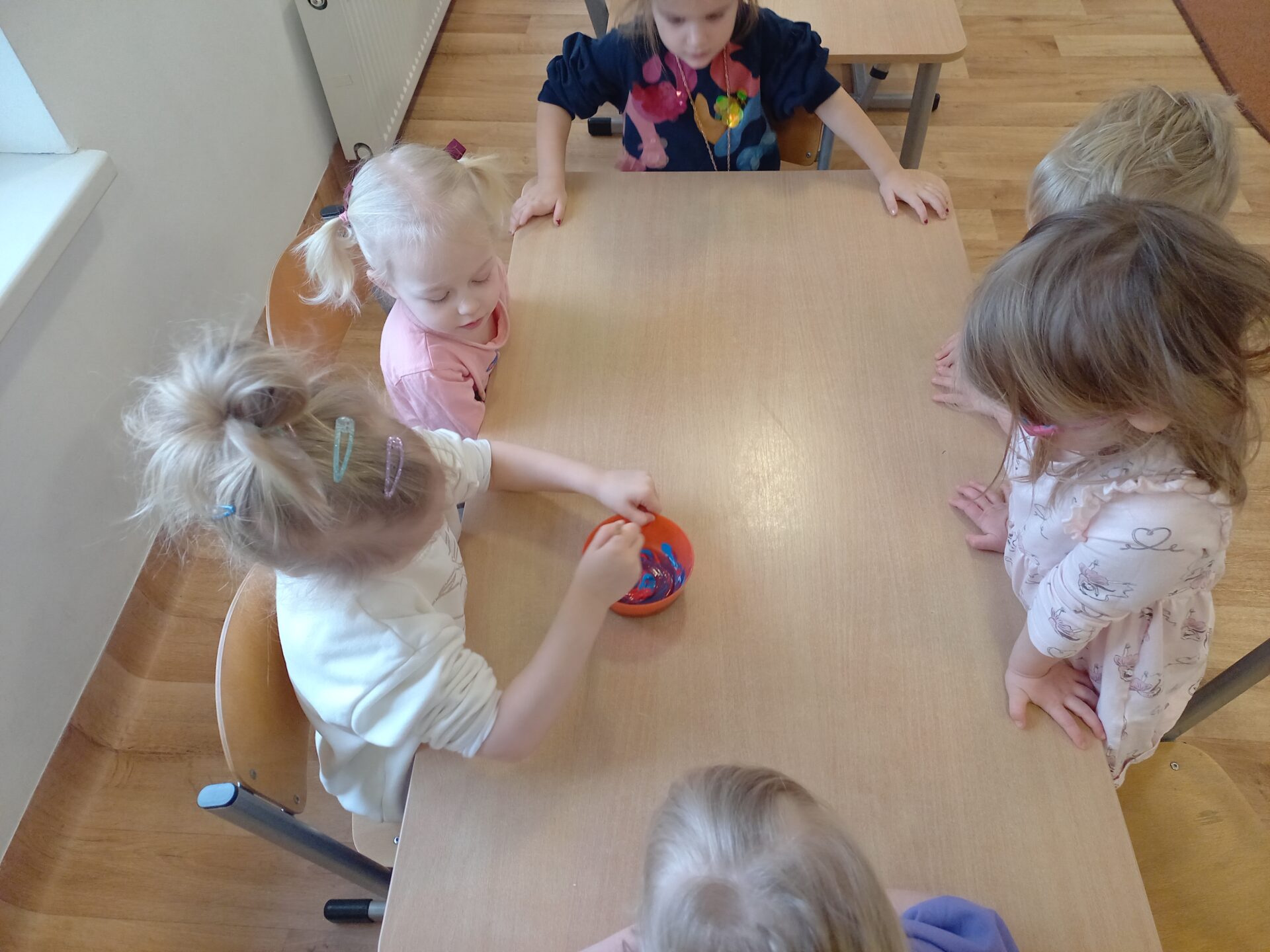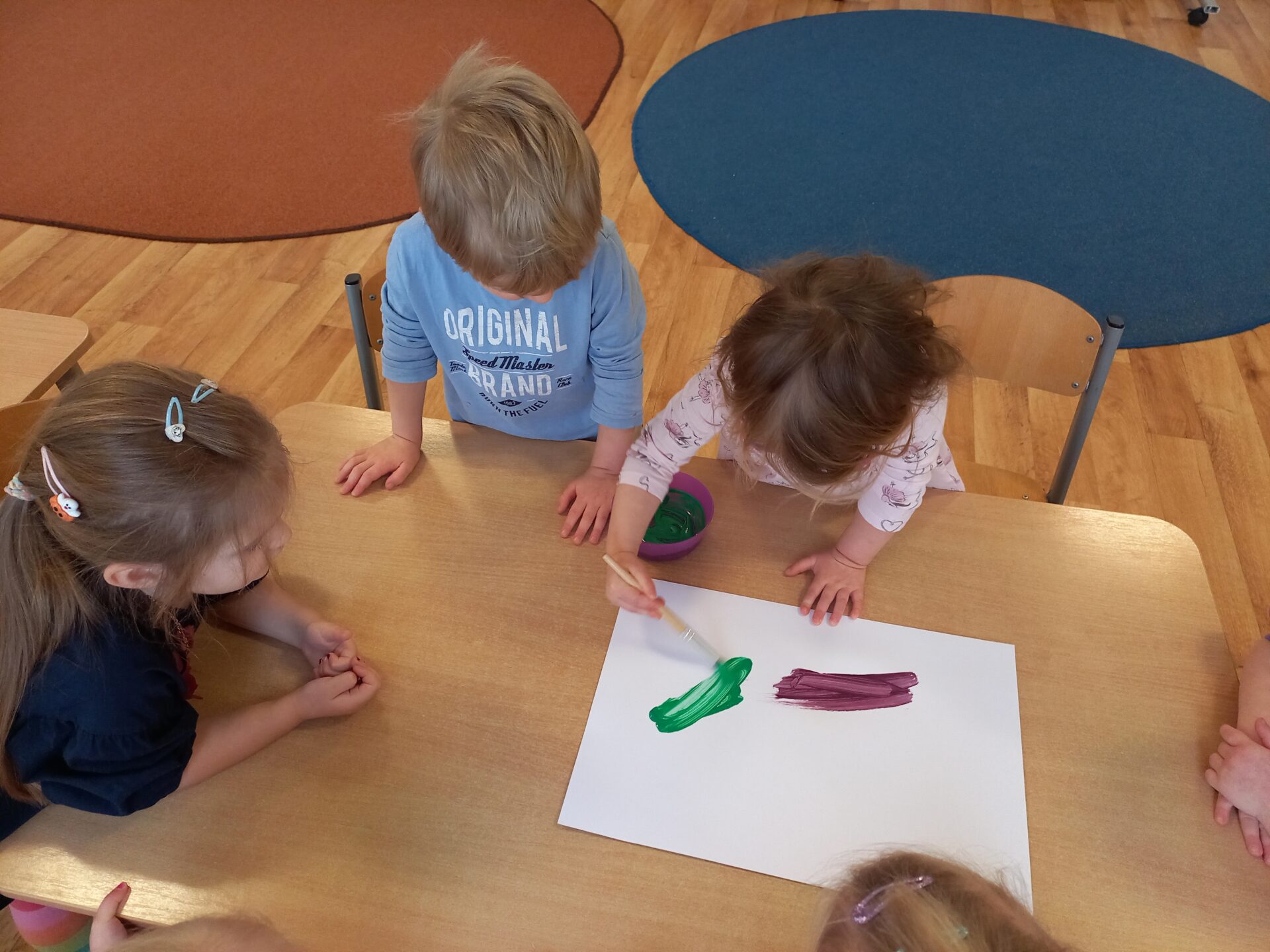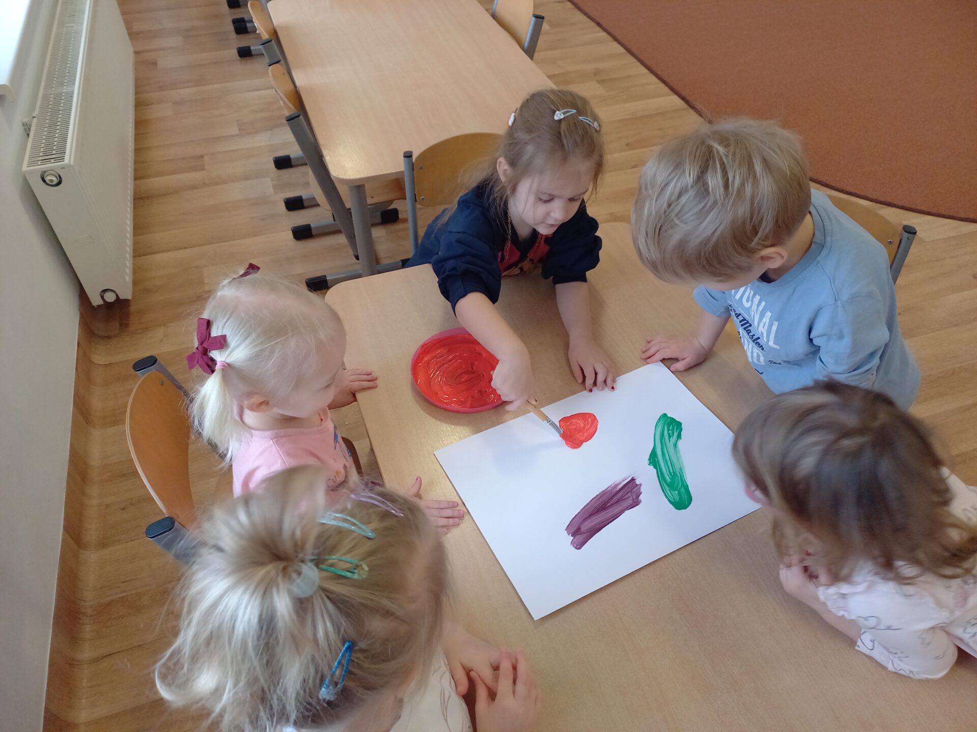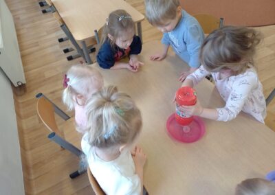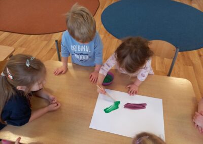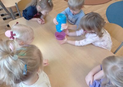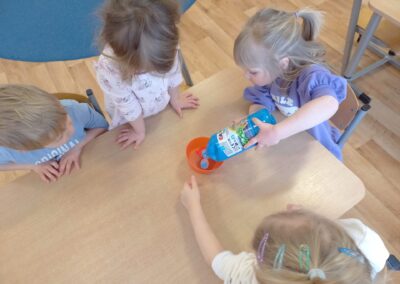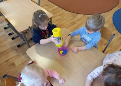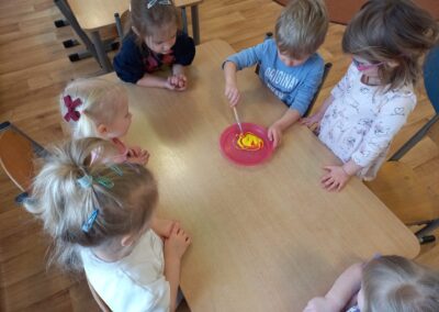 We wtorek w naszej grupie odbyła się zabawa badawcza pod hasłem „Co się stanie, gdy zmieszamy kolory?”. Dzieci miały okazję samodzielnie eksperymentować z farbami. Na początku przypomnieliśmy sobie kolory podstawowe: czerwony, żółty i niebieski. Następnie dzieci próbowały przewidzieć, jaki kolor powstanie po ich zmieszaniu. Dzieci z dużym zaangażowaniem obserwowały, jak kolory zmieniają się na ich oczach. Zabawa sprawiła im wiele radości, rozwijała ciekawość poznawczą, kreatywność oraz umiejętność wyciągania wniosków.