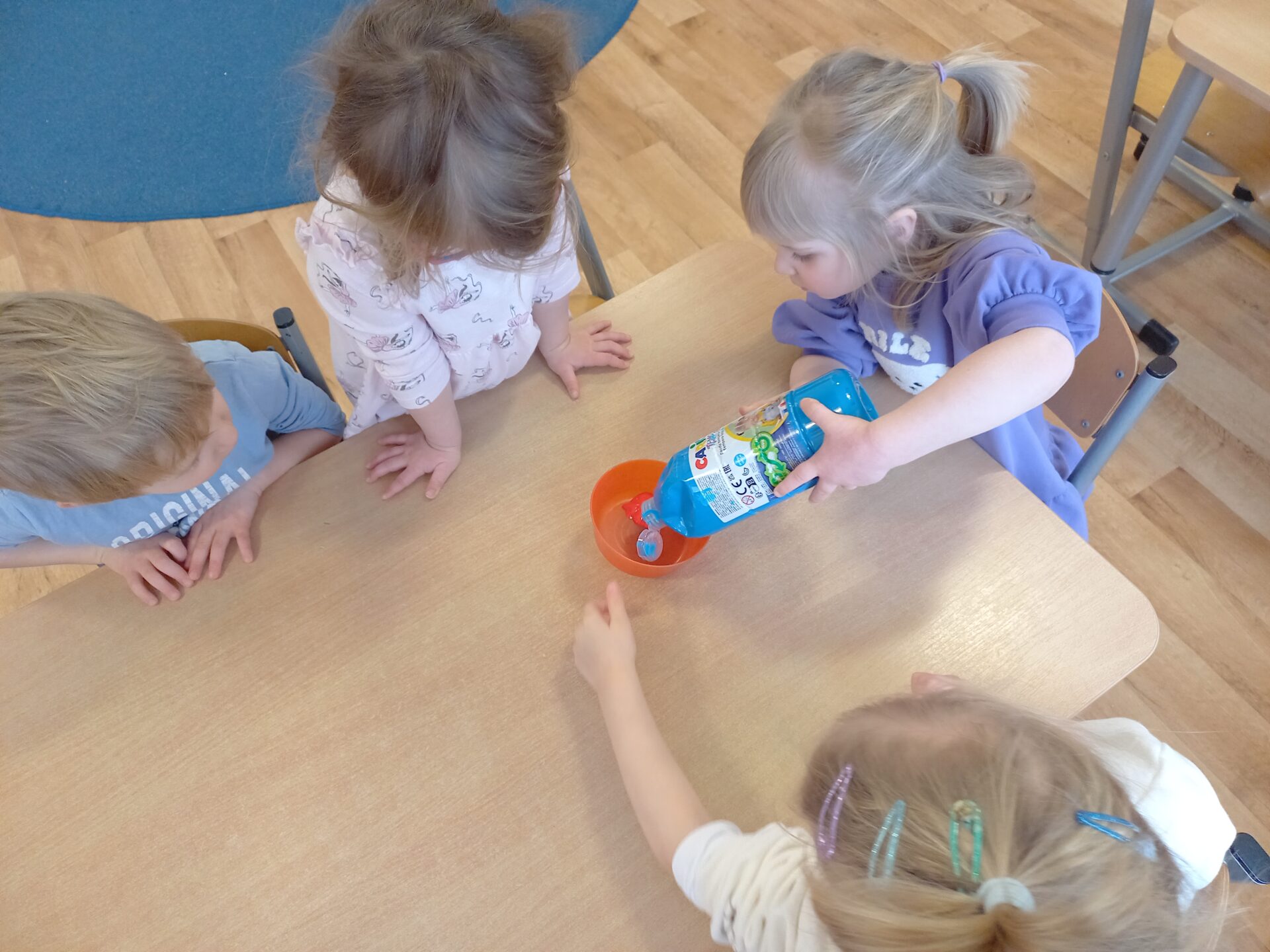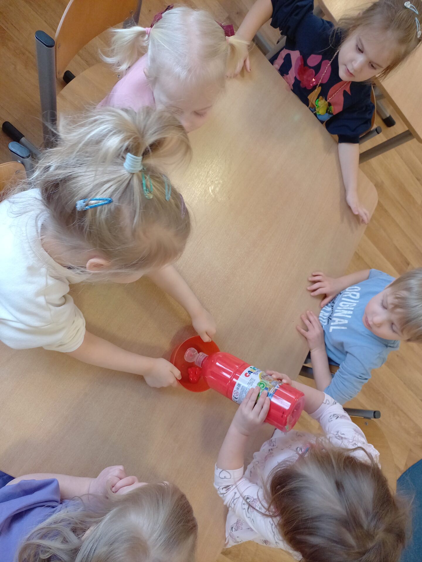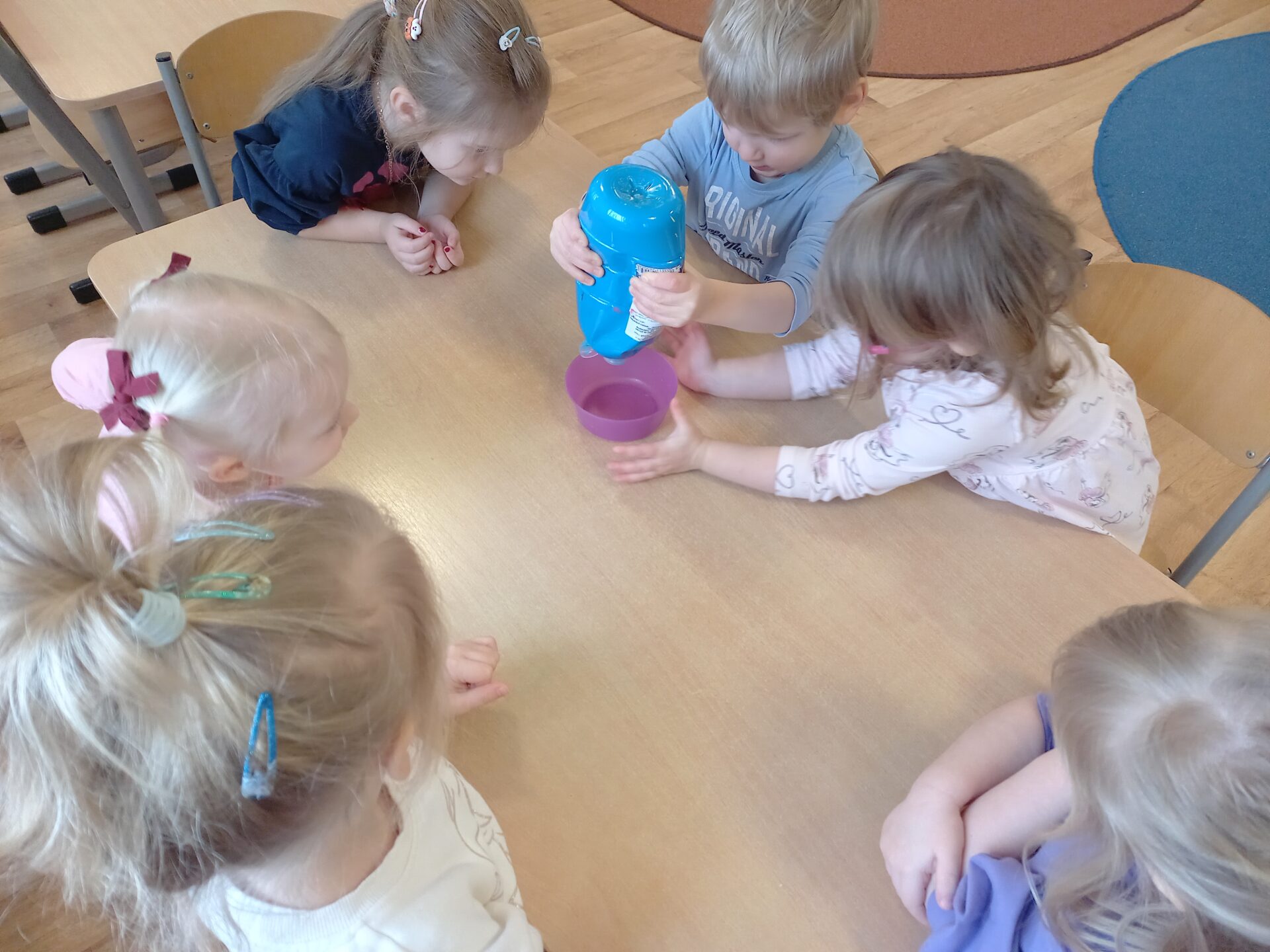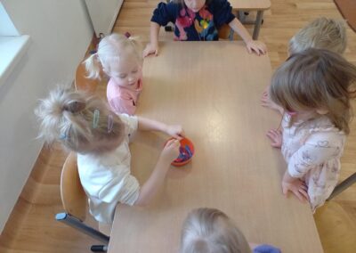 We wtorek w naszej grupie odbyła się zabawa badawcza pod hasłem „Co się stanie, gdy zmieszamy kolory?”. Dzieci miały okazję samodzielnie eksperymentować z farbami. Na początku przypomnieliśmy sobie kolory podstawowe: czerwony, żółty i niebieski. Następnie dzieci próbowały przewidzieć, jaki kolor powstanie po ich zmieszaniu. Dzieci z dużym zaangażowaniem obserwowały, jak kolory zmieniają się na ich oczach. Zabawa sprawiła im wiele radości, rozwijała ciekawość poznawczą, kreatywność oraz umiejętność wyciągania wniosków.