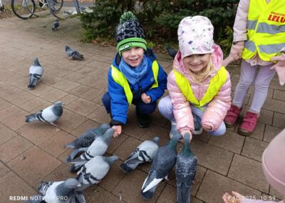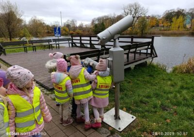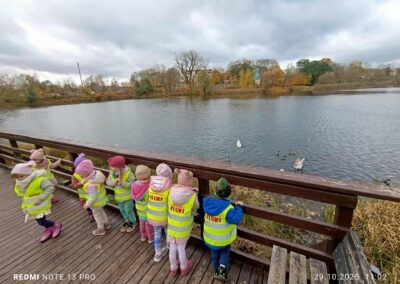 Następnie wyruszyliśmy na spacer nad jezioro, gdzie dokarmialiśmy ptaki i z ciekawością obserwowaliśmy zmieniającą się jesienną przyrodę. Dzieci szukały i nazywały różne gatunki ptaków, które zostają w Polsce na zimę.