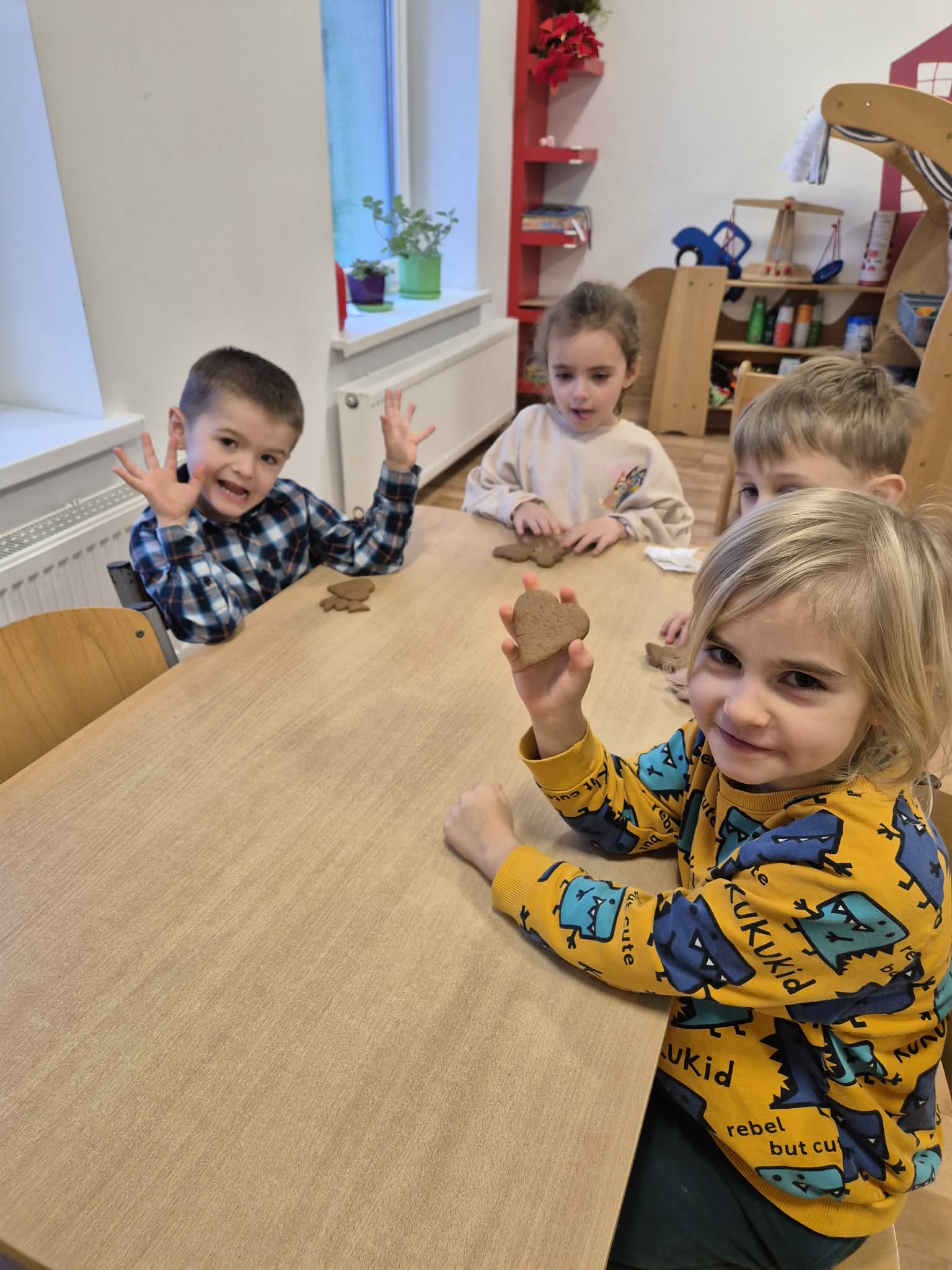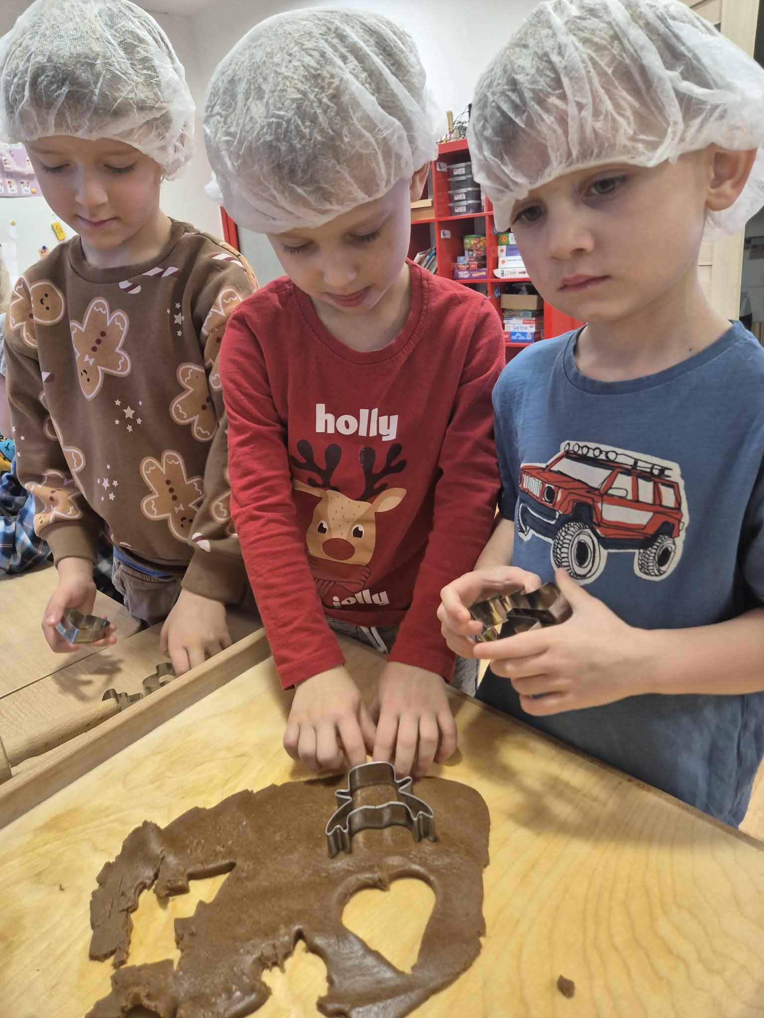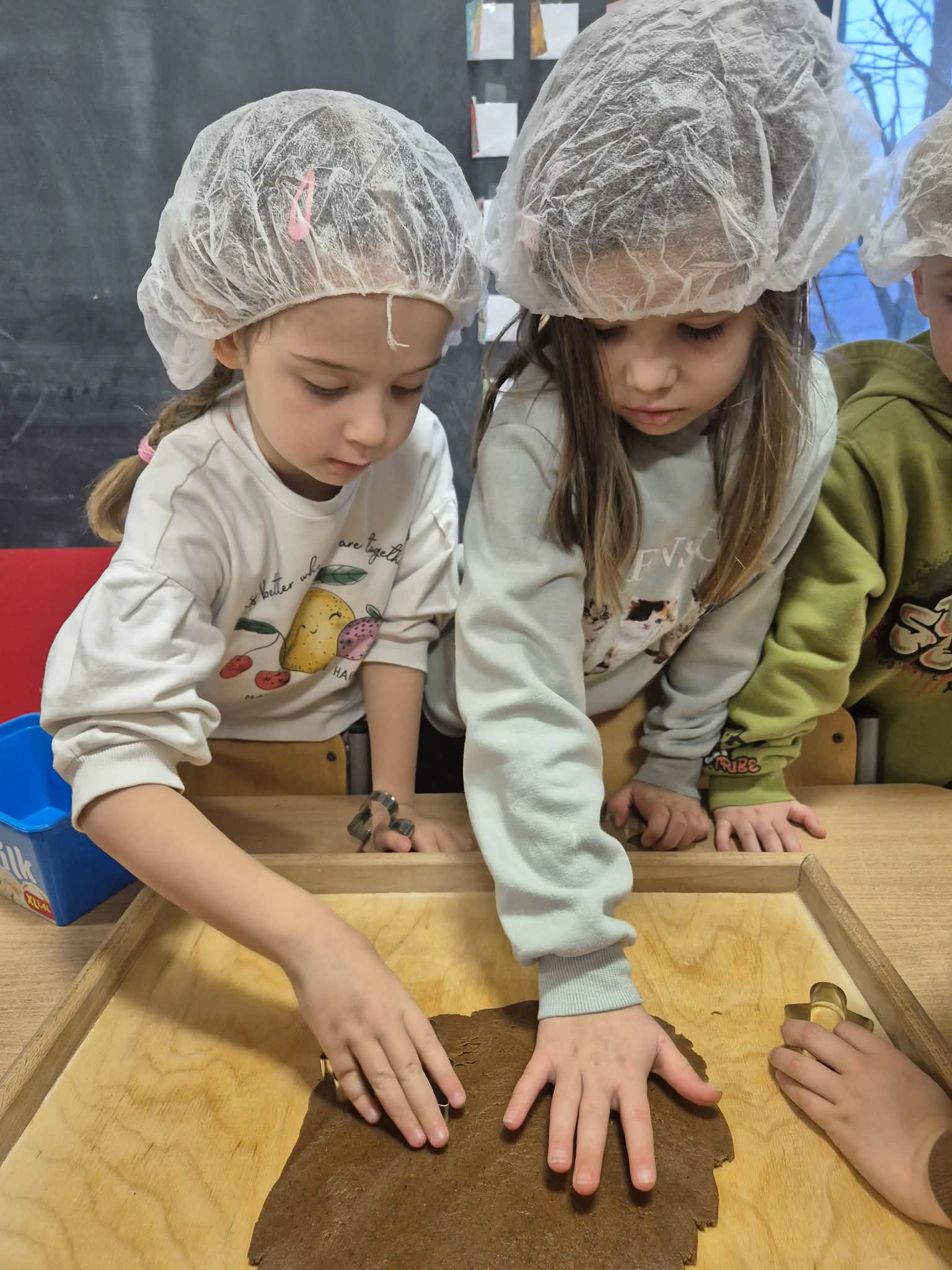 Każda stacja była poświęcona innej, angażującej misji. Dzieci rozwijały wiedzę geograficzną, poznając pochodzenie pierników i wyszukując na mapie (Niemiec oraz Polski – Torunia), a także wiedzę poznawczą, odkrywając znaczenie kształtów pierników. Uwrażliwiały zmysł węchu, poznając zapachy przypraw korzennych, zmysł słuchu – wsłuchując się w brzmienie dzwonów – dowiadując się o historii pieczenia pierników przez mnichów w klasztorach, oraz zmysł dotyku, ponieważ zwieńczeniem zajęć było wspólne robienie pierników, które sprawiło dzieciom mnóstwo radości i wprowadziło wszystkich w prawdziwie świąteczny nastrój. 🎄