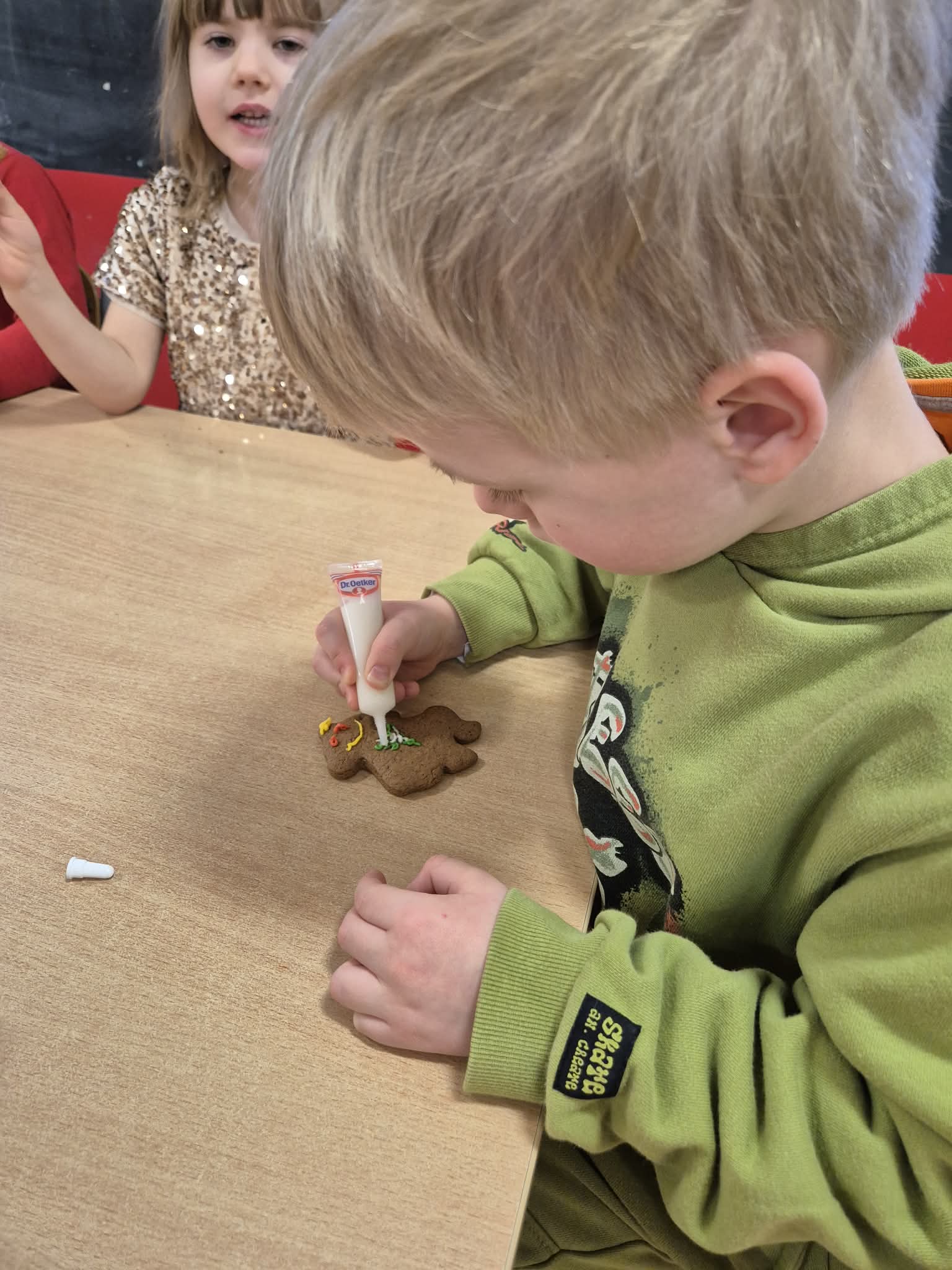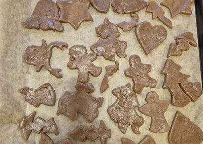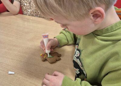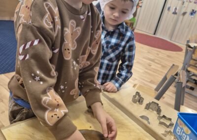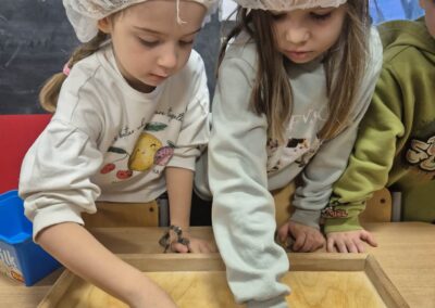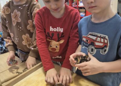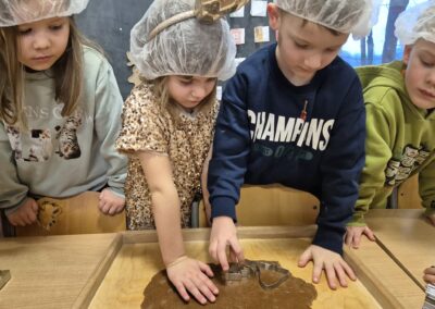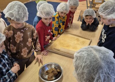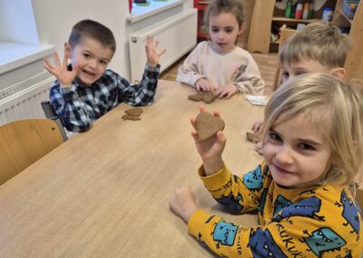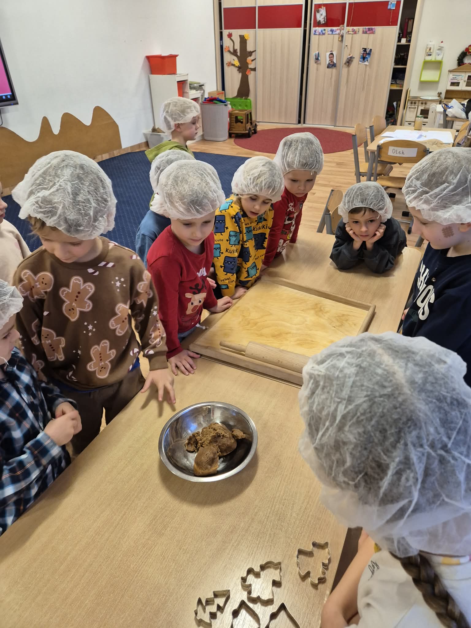 Każda stacja była poświęcona innej, angażującej misji. Dzieci rozwijały wiedzę geograficzną, poznając pochodzenie pierników i wyszukując na mapie (Niemiec oraz Polski – Torunia), a także wiedzę poznawczą, odkrywając znaczenie kształtów pierników. Uwrażliwiały zmysł węchu, poznając zapachy przypraw korzennych, zmysł słuchu – wsłuchując się w brzmienie dzwonów – dowiadując się o historii pieczenia pierników przez mnichów w klasztorach, oraz zmysł dotyku, ponieważ zwieńczeniem zajęć było wspólne robienie pierników, które sprawiło dzieciom mnóstwo radości i wprowadziło wszystkich w prawdziwie świąteczny nastrój. 🎄