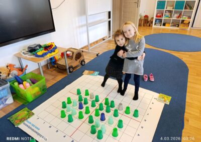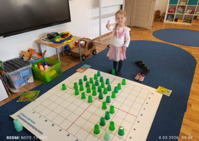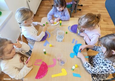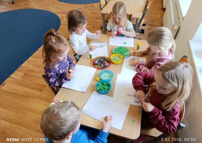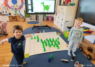 Wykonaliśmy kreatywne prace plastyczne inspirowane dinozaurami, rozwijając wyobraźnię i zdolności manualne. Nie zabrakło również zajęć z kodowania, które w ciekawy i przystępny sposób rozwijały logiczne myślenie oraz umiejętność współpracy. Dodatkowo dzieci brały udział w zabawach ruchowych i sensorycznych, które jeszcze bardziej przybliżyły im tematykę prehistorii.