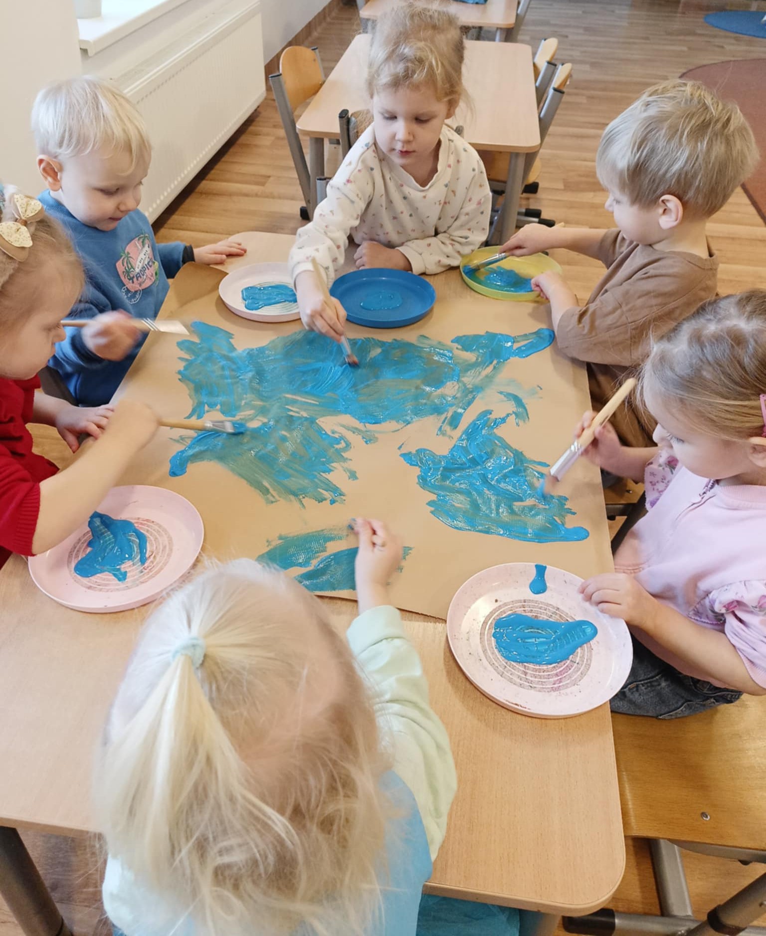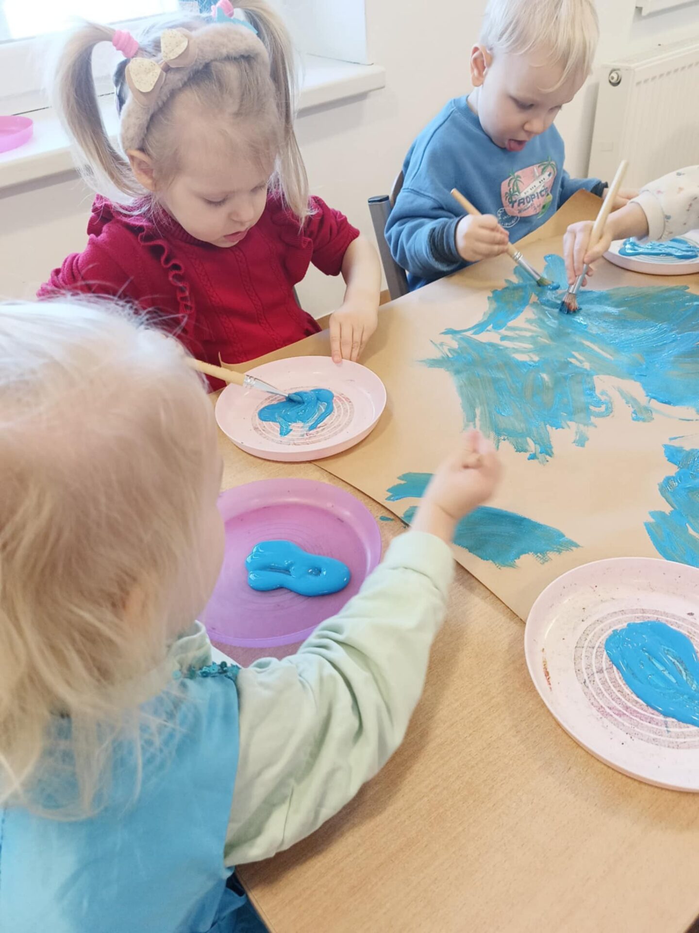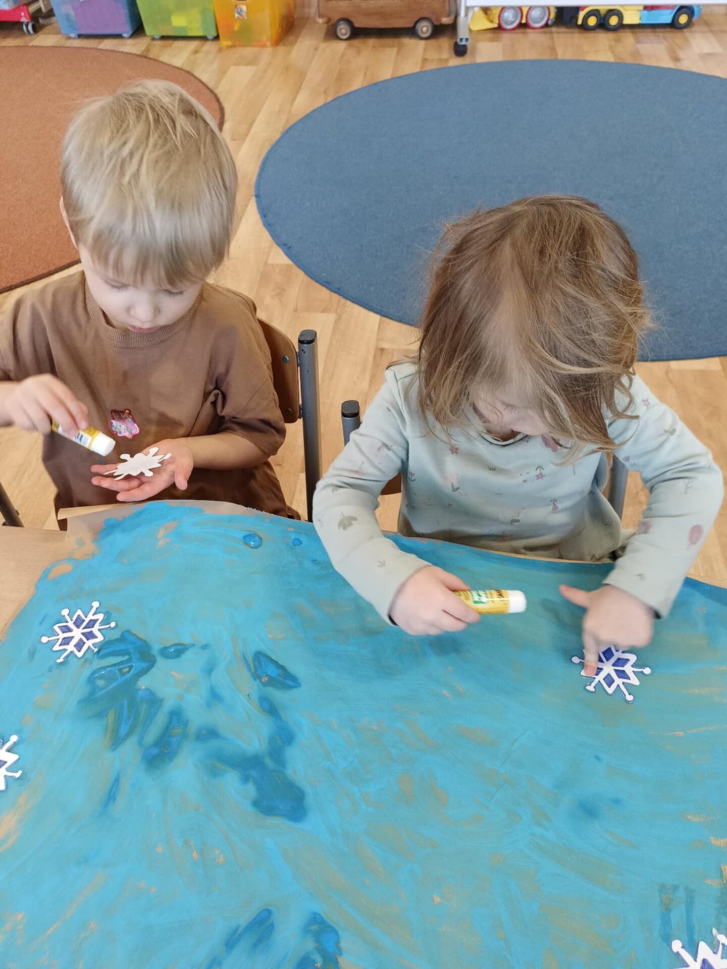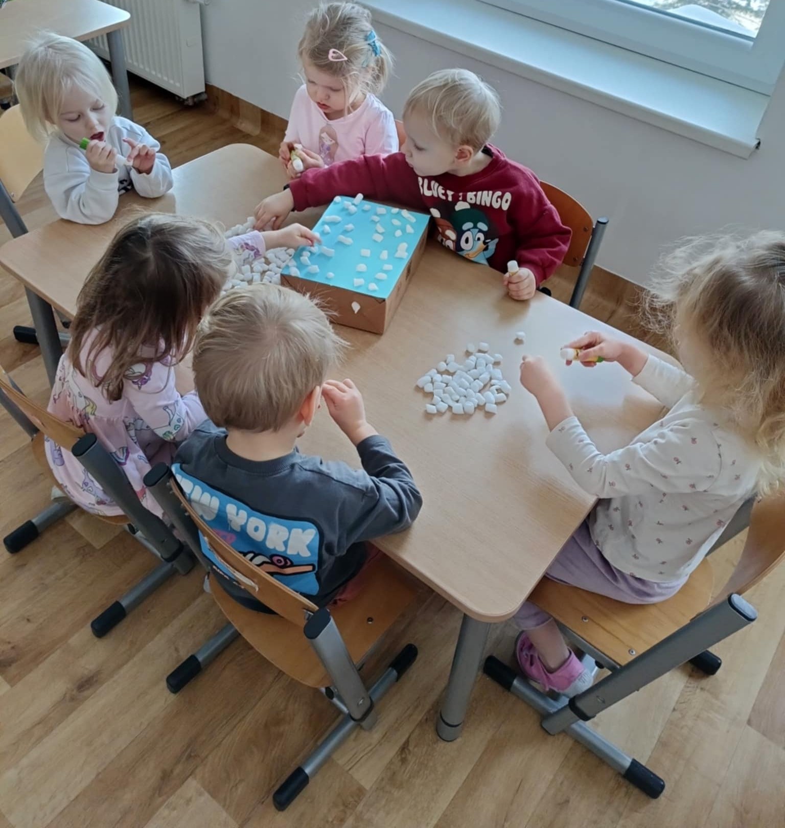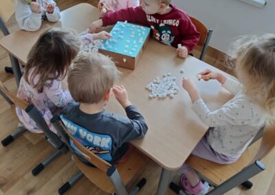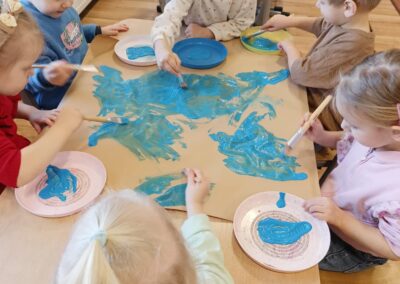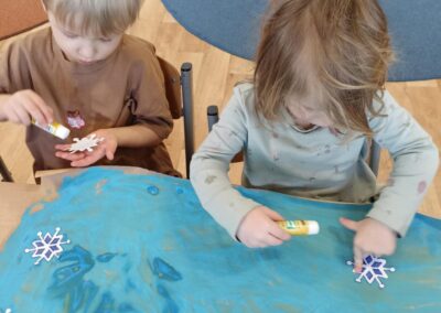 W minionym tygodniu 19.01-23.01.2026r. Dzieci uczestniczyły w zimowych zajęciach plastycznych, których celem było rozwijanie sprawności manualnej, koordynacji wzrokowo-ruchowej oraz kreatywności u trzylatków. Maluchy wspólnie tworzyły Zamek Królowej Śniegu z kartonu, malowały farbami na szarym papierze oraz przyklejały papierowe śnieżynki, ucząc się przy tym współpracy i samodzielnego działania. Zajęcia sprzyjały swobodnej ekspresji twórczej, poznawaniu różnych materiałów plastycznych oraz budowaniu radości z tworzenia i dobrej zabawy.