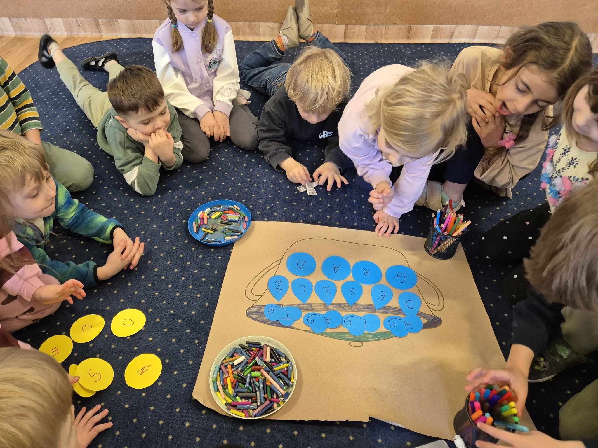 W dalszej części dnia dzieci aktywnie uczestniczyły w zabawach językowych z wykorzystaniem „garnka”, podczas których głoskowały i – przy niewielkiej pomocy – tworzyły pełne wyrazy związane ze słownictwem pogodowym. Ćwiczeniom towarzyszyło duże zaangażowanie, radość oraz satysfakcja z samodzielnych prób.