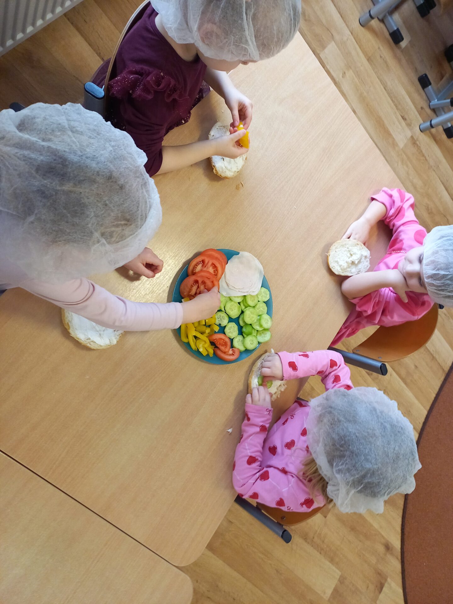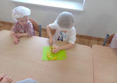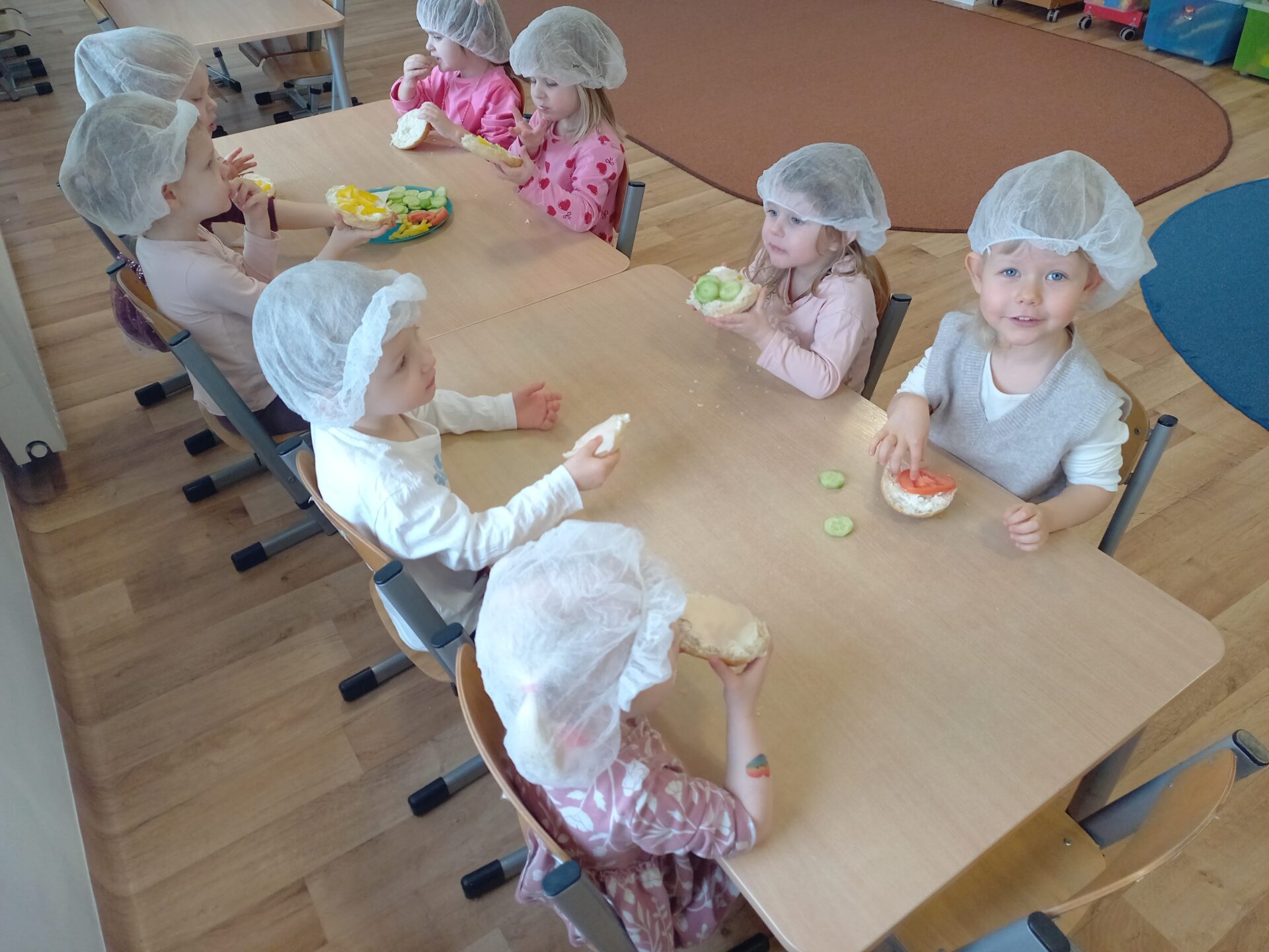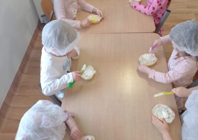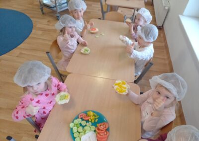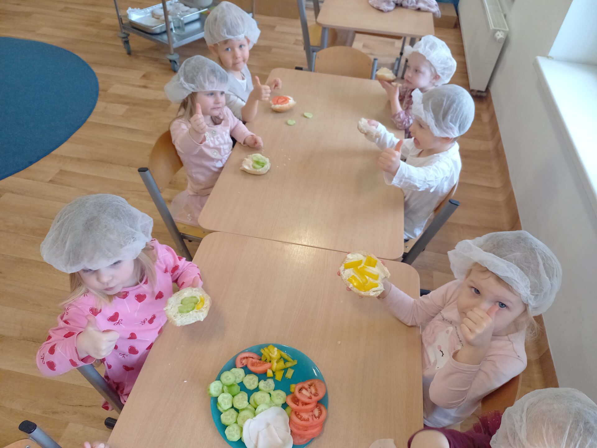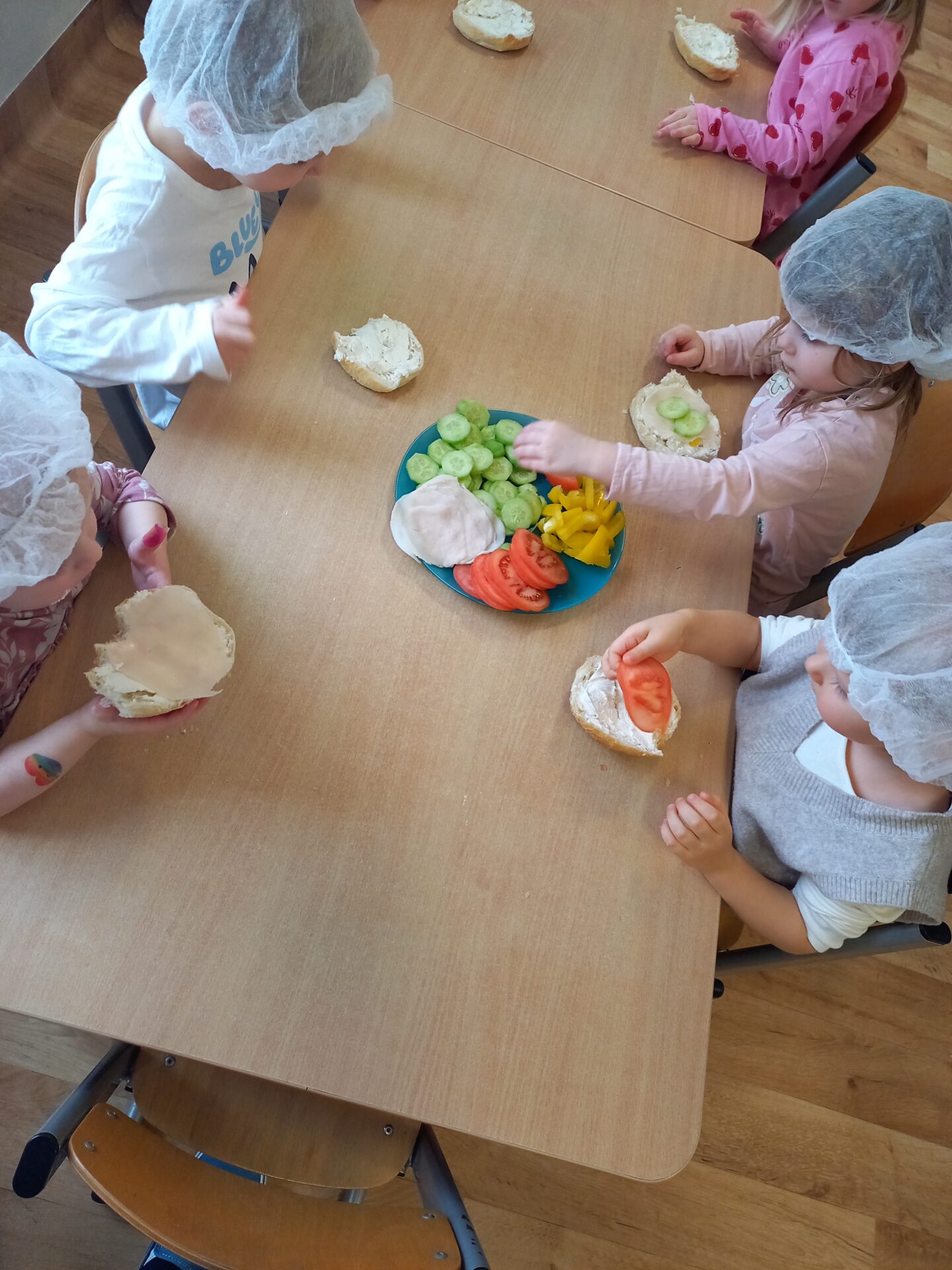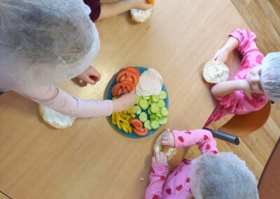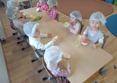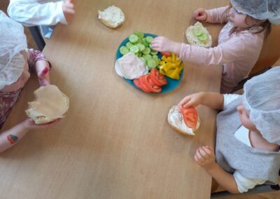 W naszym przedszkolu odbyły się wyjątkowe zajęcia kulinarne – dzieci samodzielnie przygotowywały zdrowe i kolorowe kanapki. Była to nie tylko świetna zabawa, ale również doskonała okazja do nauki samodzielności oraz zasad zdrowego odżywiania. Na stołach pojawiło się świeże pieczywo, serek śmietankowy, wędlina oraz kolorowe warzywa: ogórek, pomidor i papryka. Każde dziecko mogło samodzielnie wybrać składniki i stworzyć własną, niepowtarzalną kompozycję. Powstały prawdziwe kanapkowe dzieła sztuki!