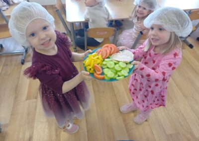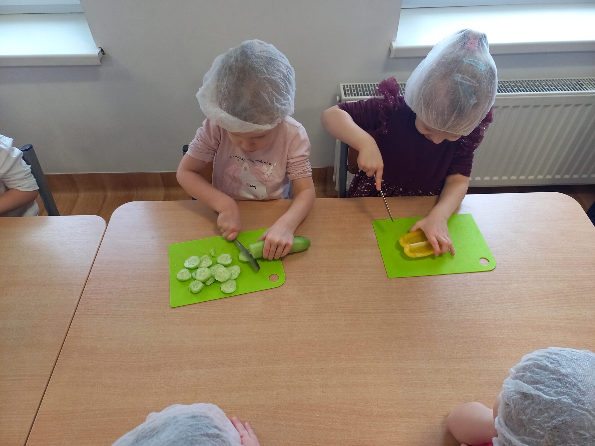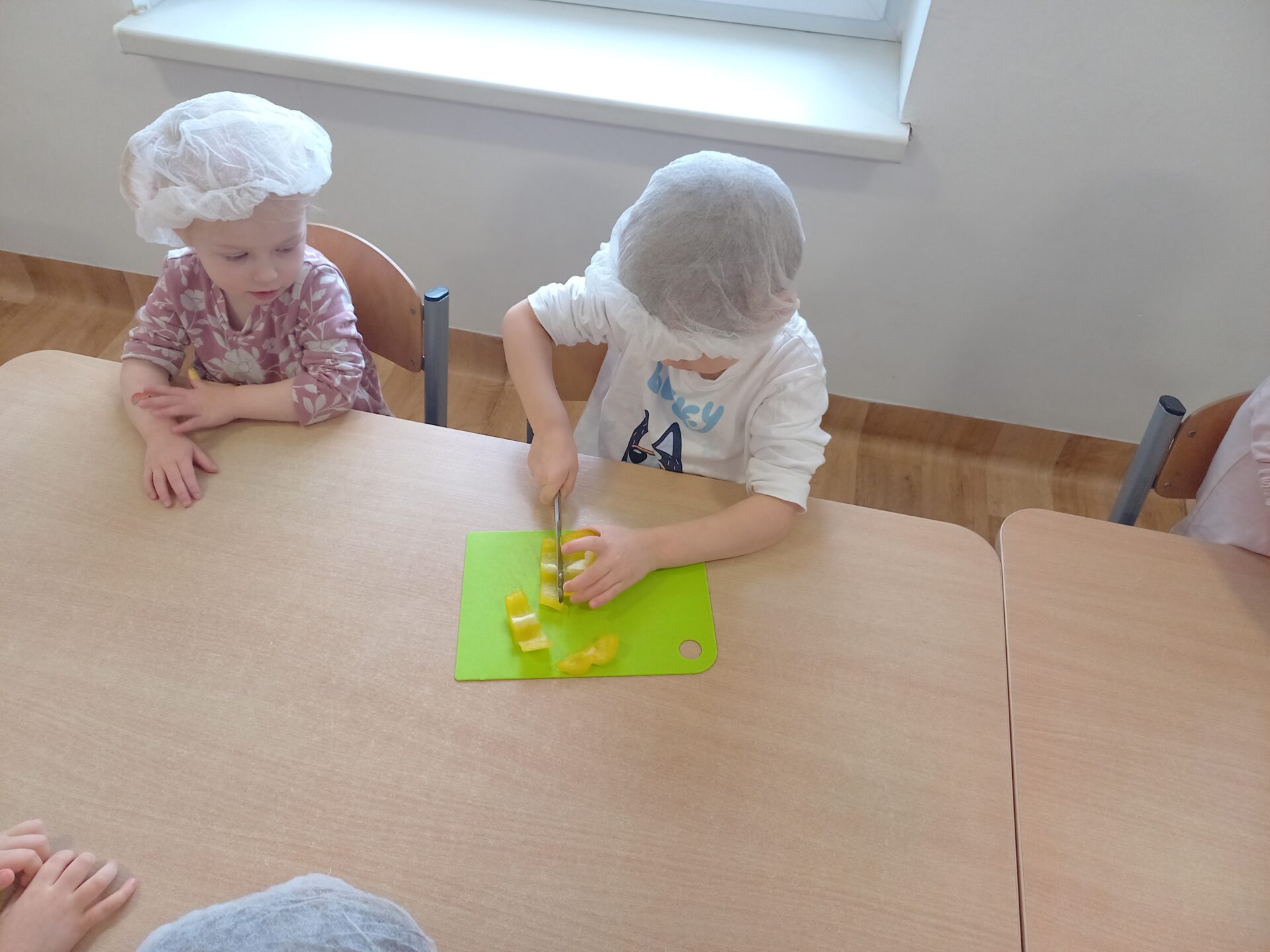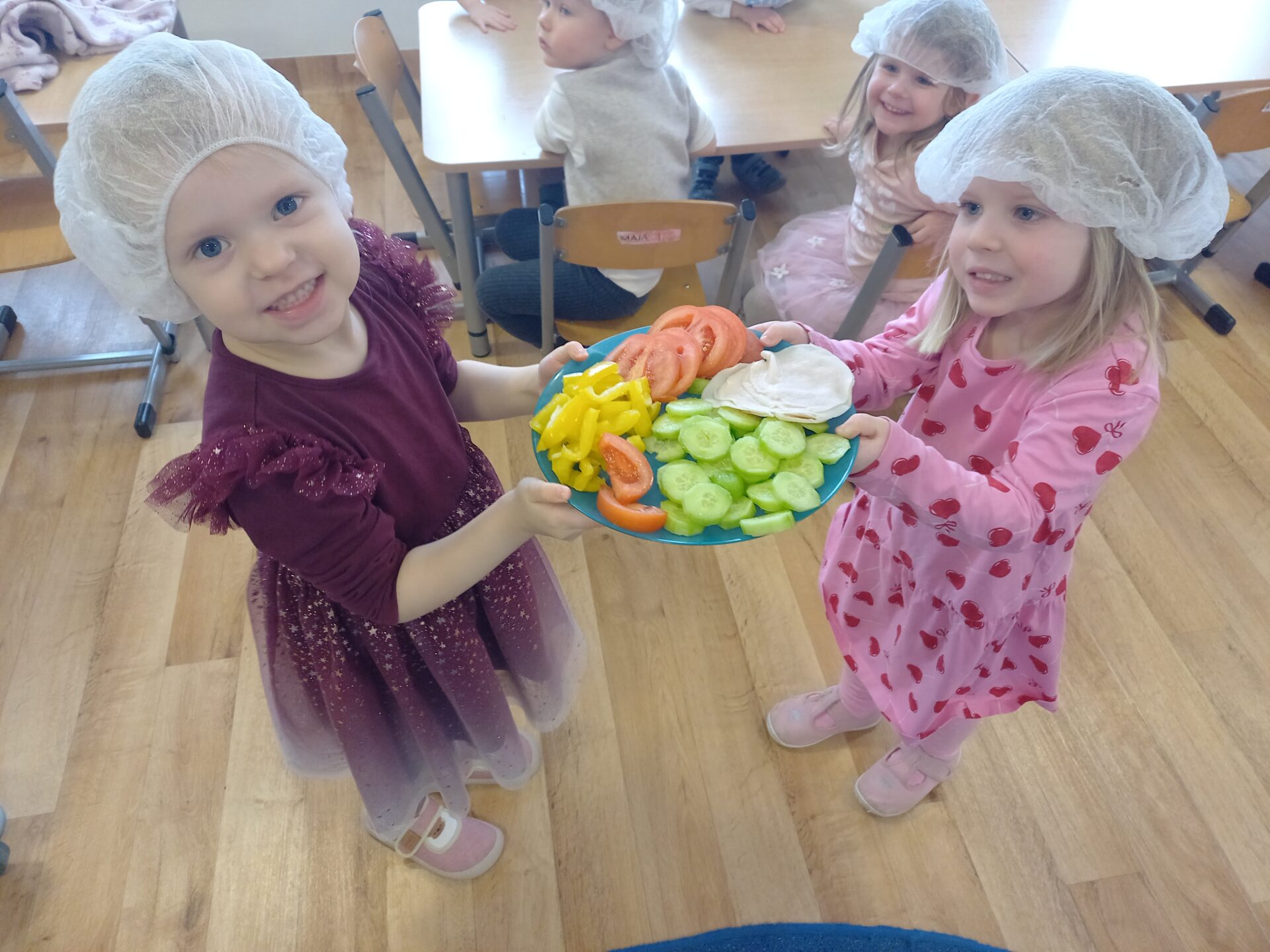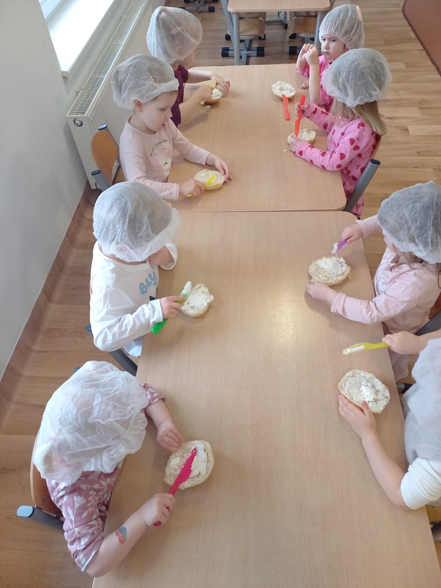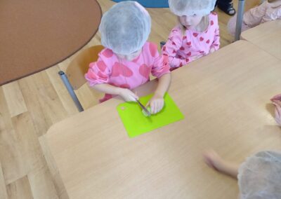 W naszym przedszkolu odbyły się wyjątkowe zajęcia kulinarne – dzieci samodzielnie przygotowywały zdrowe i kolorowe kanapki. Była to nie tylko świetna zabawa, ale również doskonała okazja do nauki samodzielności oraz zasad zdrowego odżywiania. Na stołach pojawiło się świeże pieczywo, serek śmietankowy, wędlina oraz kolorowe warzywa: ogórek, pomidor i papryka. Każde dziecko mogło samodzielnie wybrać składniki i stworzyć własną, niepowtarzalną kompozycję. Powstały prawdziwe kanapkowe dzieła sztuki!