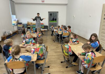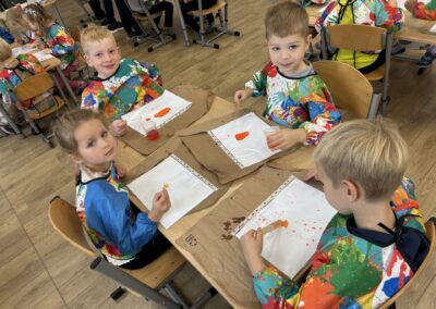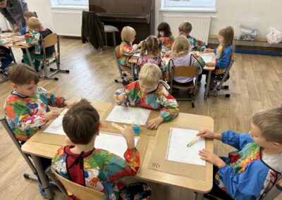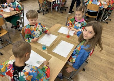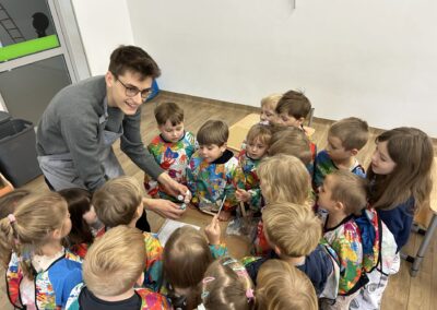 Dziś w naszym przedszkolu odbyły się wyjątkowe warsztaty badawcze pod hasłem „Wodne labirynty” Dzieci miały okazję wcielić się w małych naukowców i odkrywców. Podczas zajęć samodzielnie eksperymentowały z wodą, barwnikami i ruchem kropelek. Obserwowały, jak kolory łączą się i zmieniają, a następnie tworzyły barwne ścieżki i labirynty na kartkach umieszczonych w koszulkach foliowych. Było przy tym mnóstwo radości, śmiechu i zdziwienia – bo każdy eksperyment przynosił inny efekt!  Dzieci przekonały się, że nauka może być świetną zabawą, a do ciekawych odkryć nie zawsze potrzebne są skomplikowane przyrządy – czasem wystarczy trochę wody, koloru i wyobraźni. Warsztaty pomogły rozwijać ciekawość poznawczą, umiejętność obserwacji oraz logiczne myślenie, a także zachęciły dzieci do samodzielnego poszukiwania odpowiedzi na pytania: „Dlaczego?” i „Co się stanie, jeśli…?” To był dzień pełen barwnych wrażeń, naukowych odkryć i twórczej zabawy!
