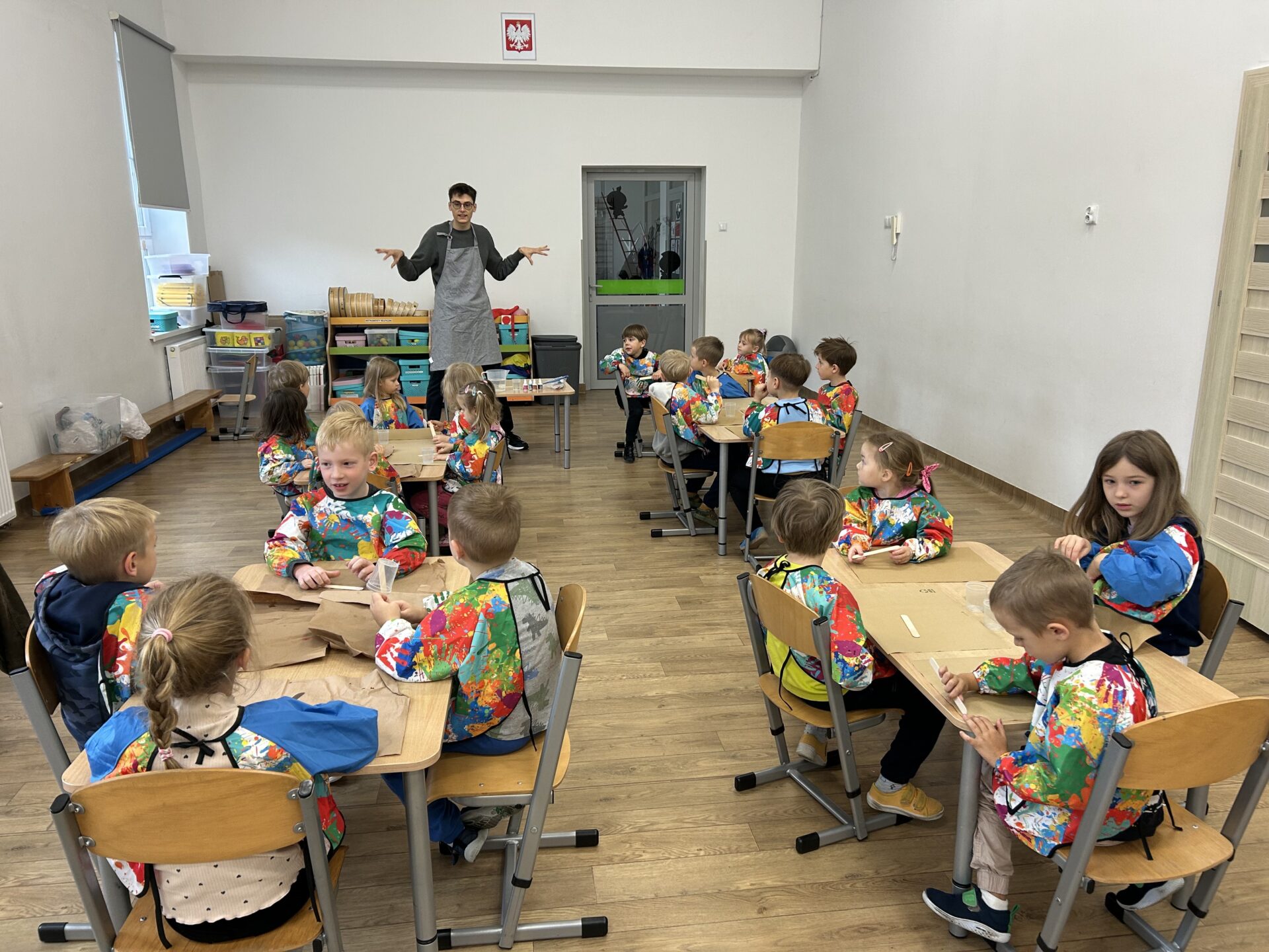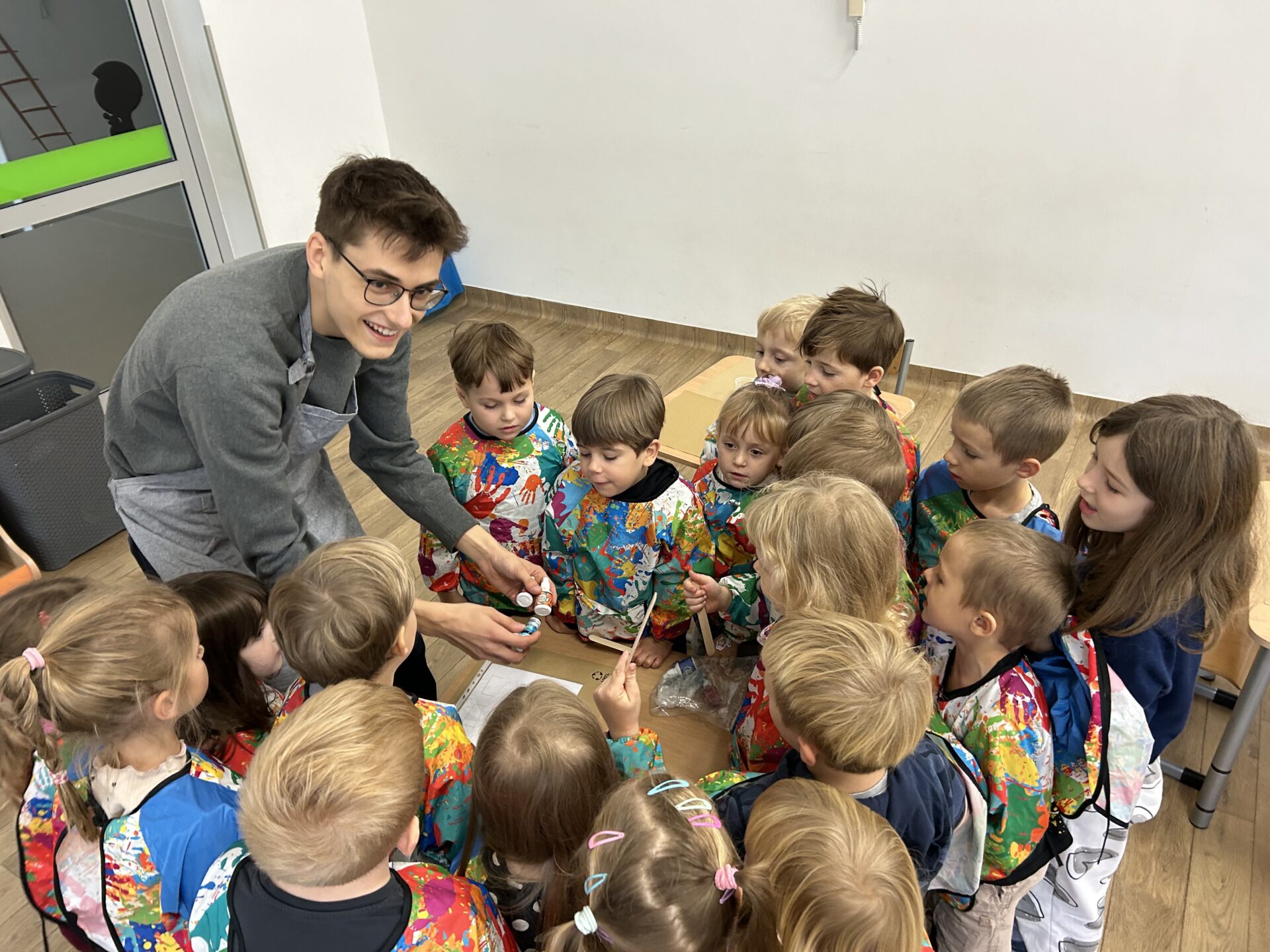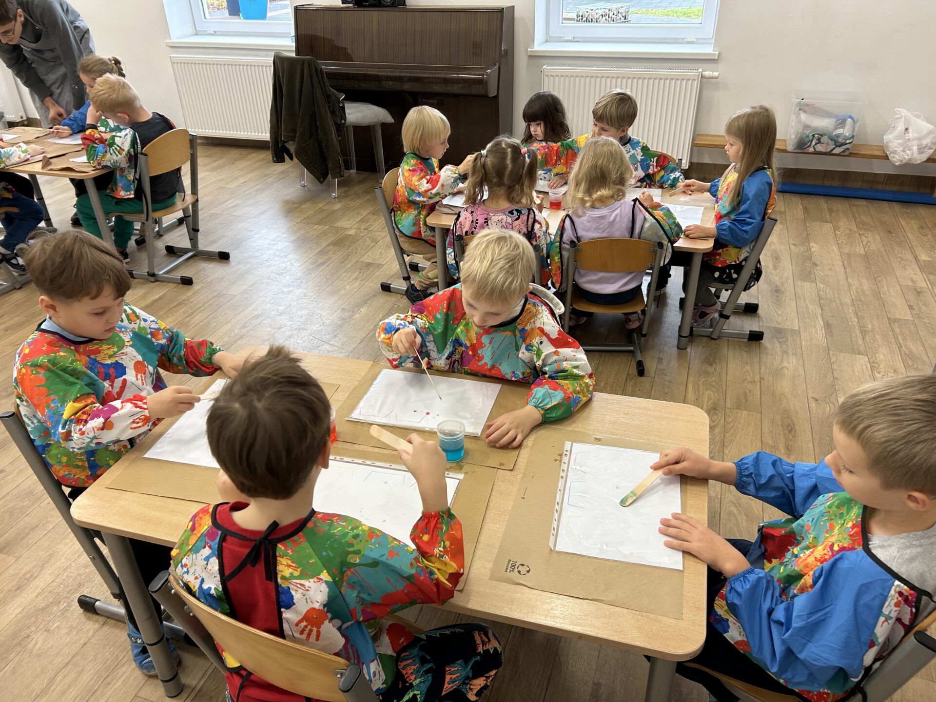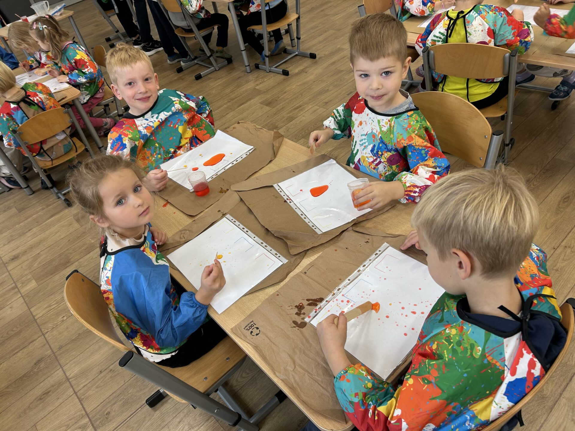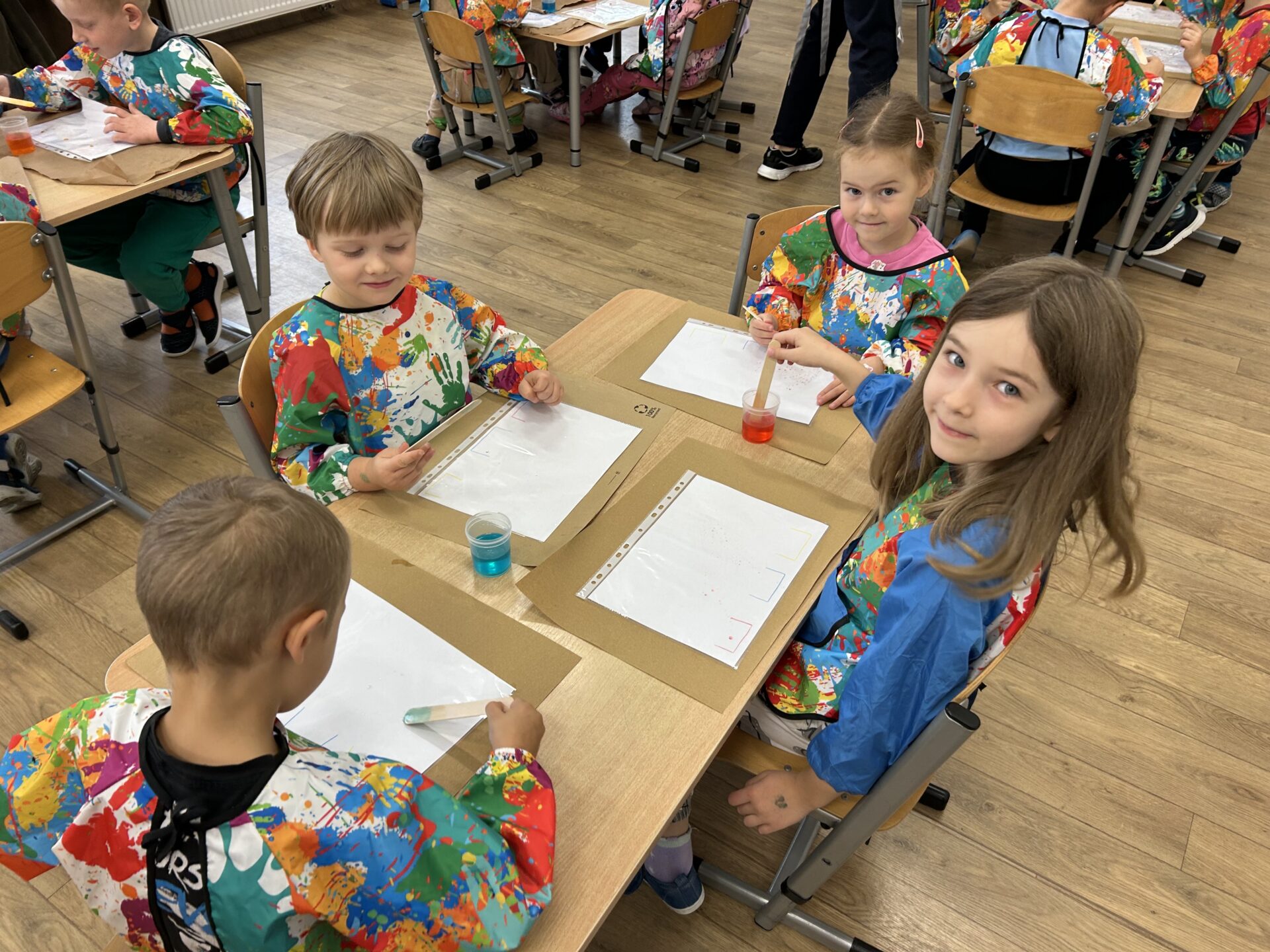 Dziś w naszym przedszkolu odbyły się wyjątkowe warsztaty badawcze pod hasłem „Wodne labirynty” Dzieci miały okazję wcielić się w małych naukowców i odkrywców. Podczas zajęć samodzielnie eksperymentowały z wodą, barwnikami i ruchem kropelek. Obserwowały, jak kolory łączą się i zmieniają, a następnie tworzyły barwne ścieżki i labirynty na kartkach umieszczonych w koszulkach foliowych. Było przy tym mnóstwo radości, śmiechu i zdziwienia – bo każdy eksperyment przynosił inny efekt!  Dzieci przekonały się, że nauka może być świetną zabawą, a do ciekawych odkryć nie zawsze potrzebne są skomplikowane przyrządy – czasem wystarczy trochę wody, koloru i wyobraźni. Warsztaty pomogły rozwijać ciekawość poznawczą, umiejętność obserwacji oraz logiczne myślenie, a także zachęciły dzieci do samodzielnego poszukiwania odpowiedzi na pytania: „Dlaczego?” i „Co się stanie, jeśli…?” To był dzień pełen barwnych wrażeń, naukowych odkryć i twórczej zabawy!