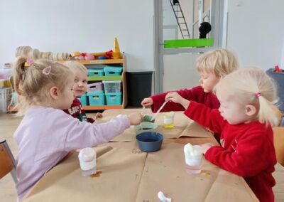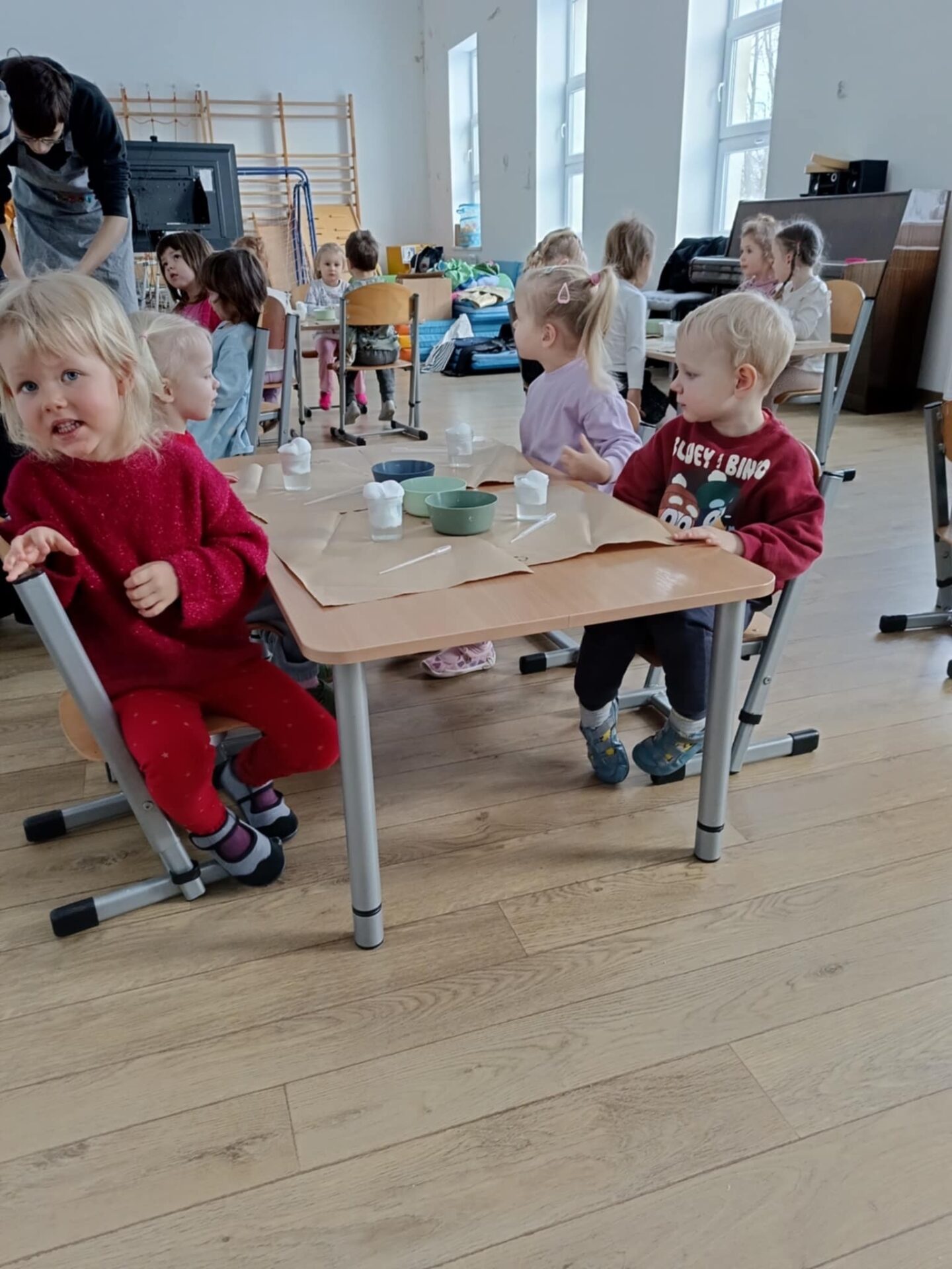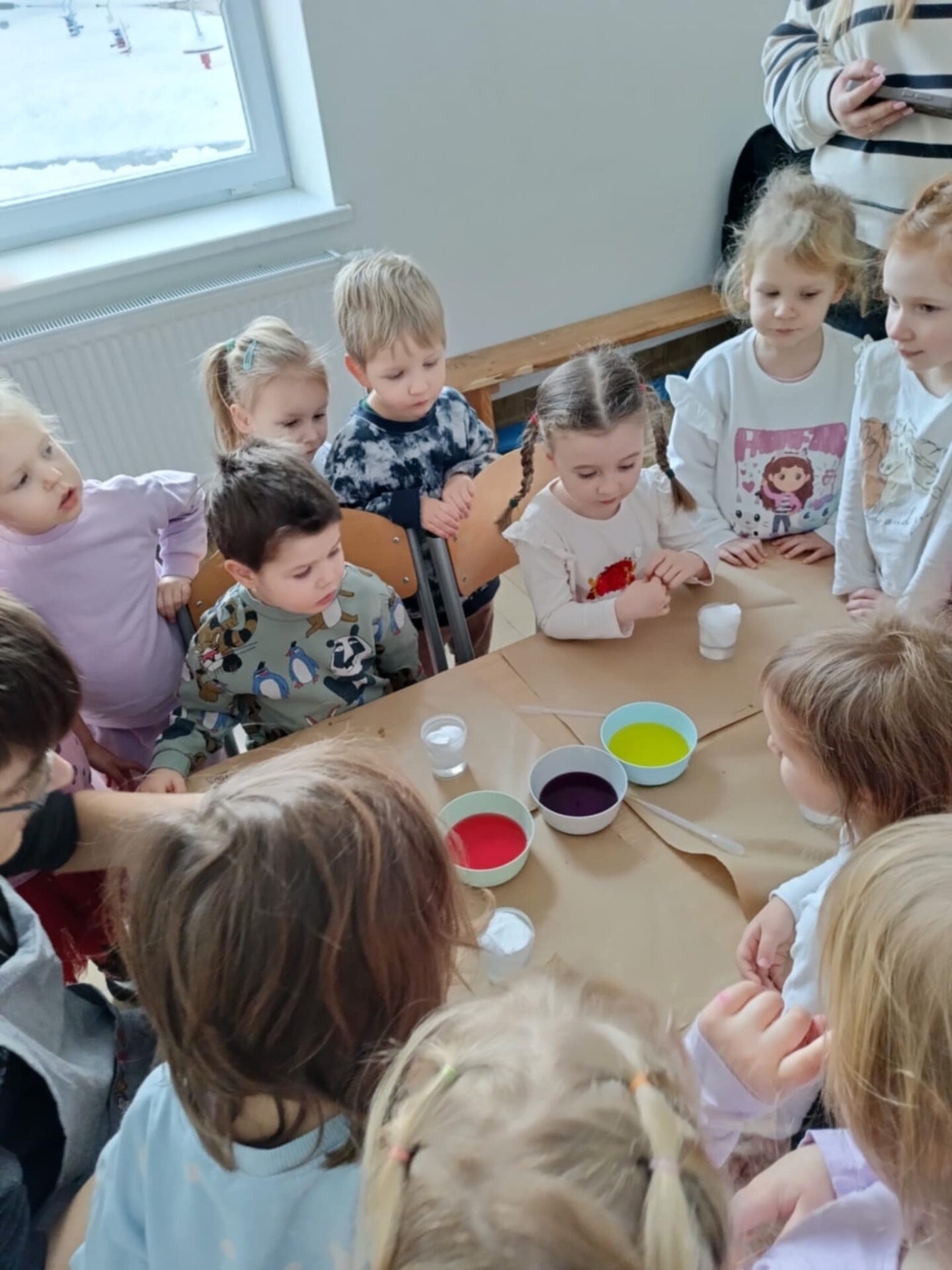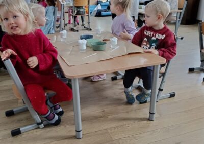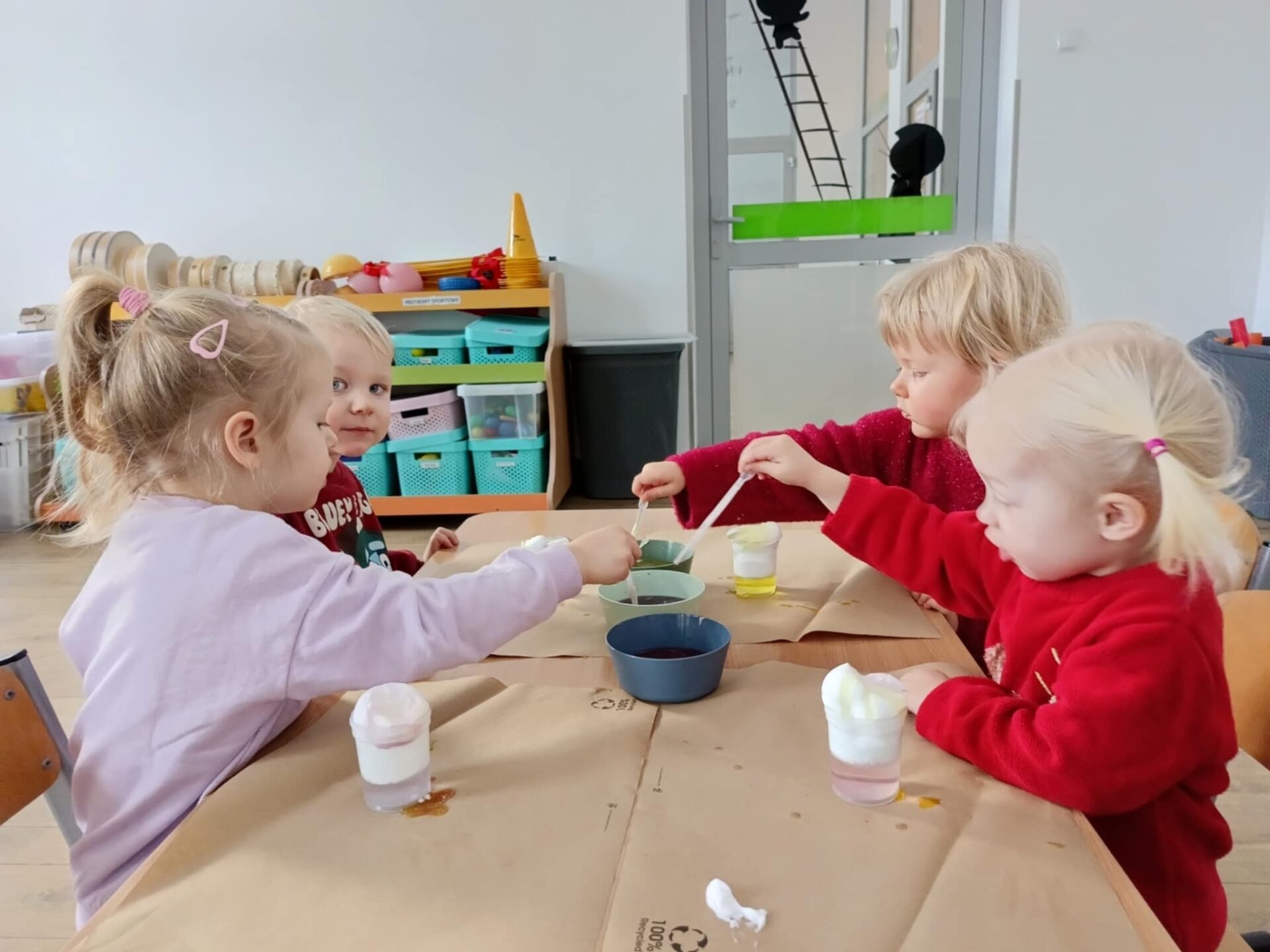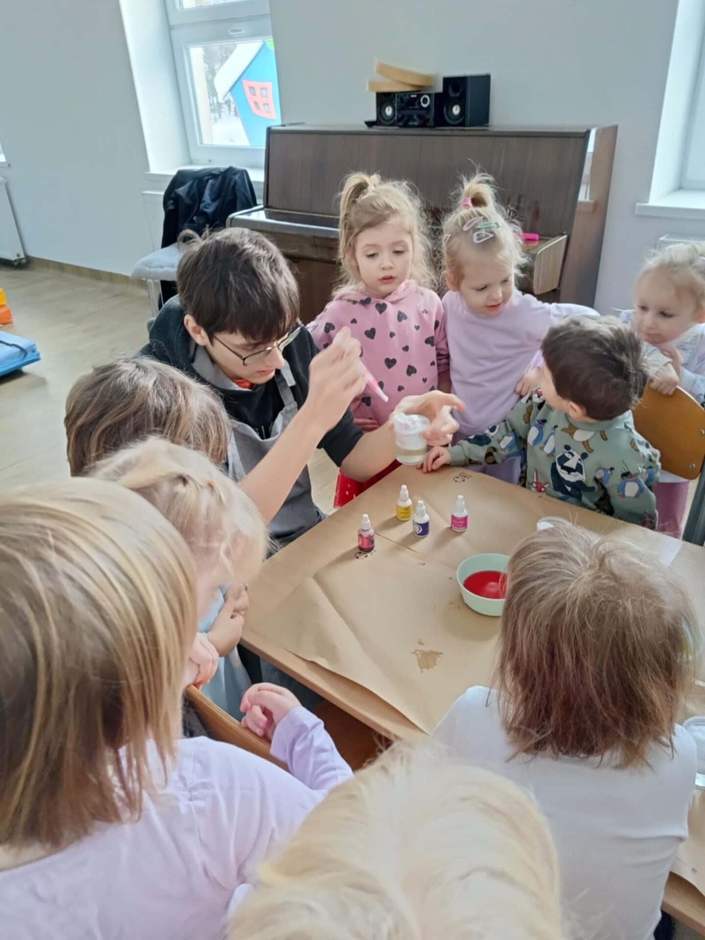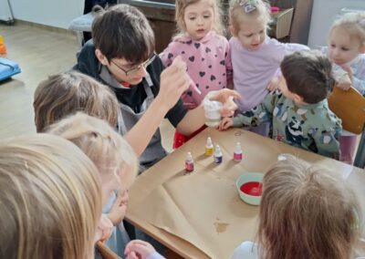 W trakcie dzisiejszych warsztatów badawczych dzieci mogły poznać proces dyfuzji najpierw obserwując jakie kolory może przyjąć woda kiedy dodamy do niej kolorową ciecz, następnie dzieci obserwowały przemieszczanie się zabarwionej cieczy poprzez gęstą zawiesinę, aż do warstwy wody. A to wszystko mogły następnie same wykonać za pomocą przygotowanych dla nich narzędzi badawczych. Zajęcia były ciekawe i pełne niespodzianek, deszczyk w kubku zamienił się nawet w wulkan ,a zabawie nie było końca.