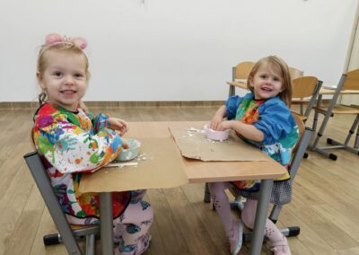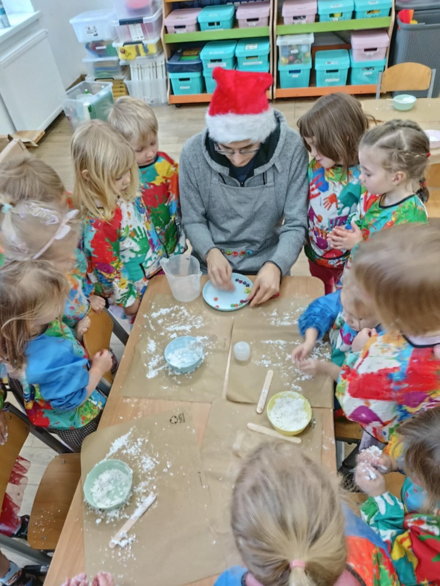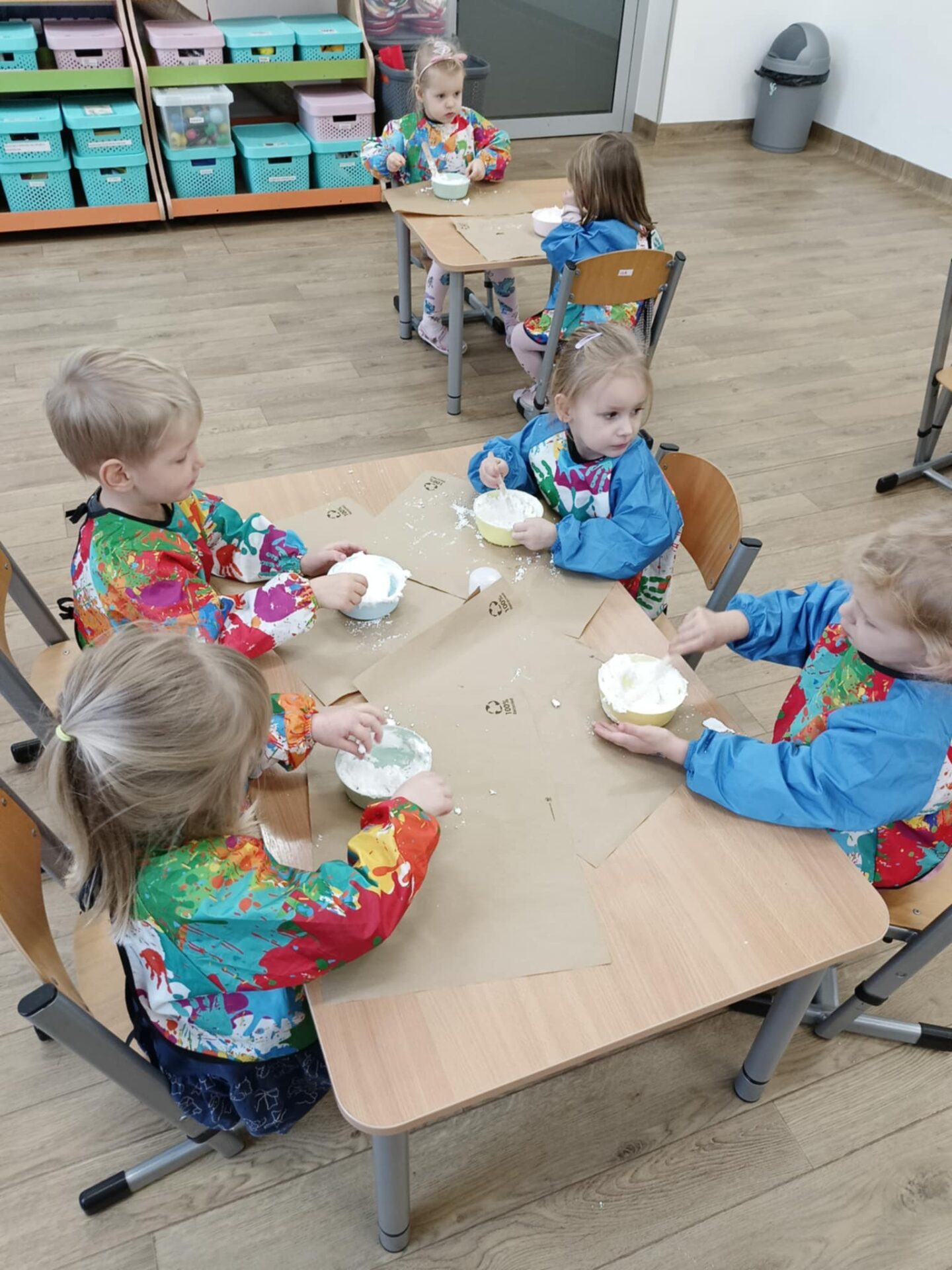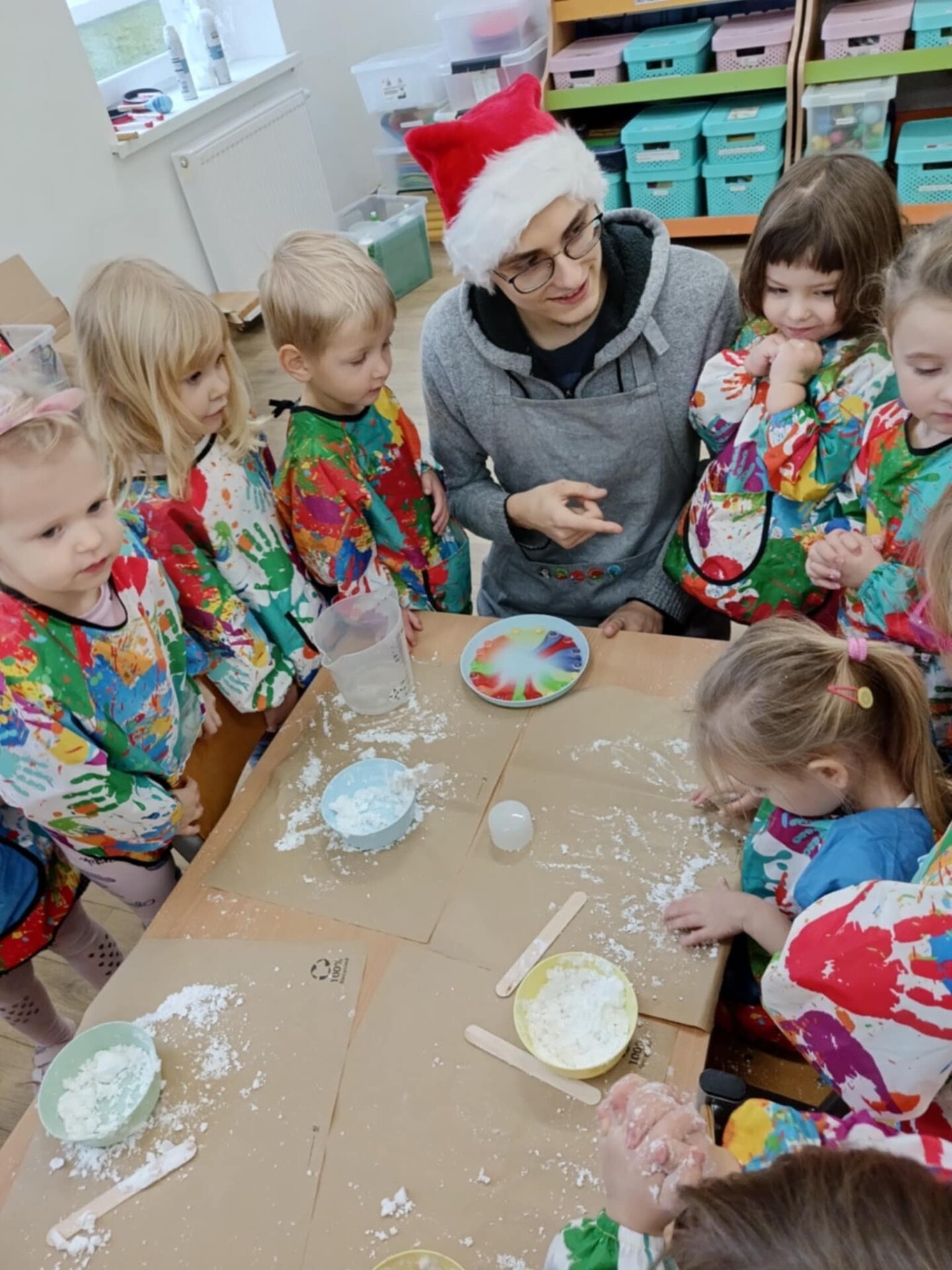 Podczas dzisiejszych warsztatów badawczych dzieci wykonywały świąteczne eksperymenty, które nie tylko wprowadziły je w zimowy nastrój, ale także wspierały rozwój umiejętności badawczych i motorycznych. W pierwszej części zajęć dzieci tworzyły sztuczny śnieg z którego następnie mogły uformować kulki śnieżne.