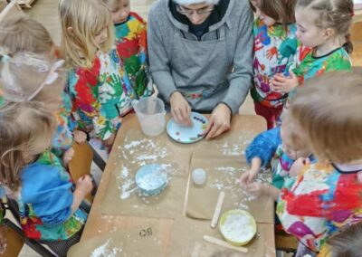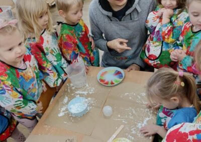 W drugiej części dzieci mogły zaobserwować tworzenie się efektownego „portalu Świętego Mikołaja”. Ten prosty, ale niezwykle atrakcyjny eksperyment zachęcał do uważnej obserwacji i dostrzegania zjawisk zachodzących wokół nich. Całe spotkanie sprzyjało rozwijaniu ciekawości poznawczej, kształtowaniu umiejętności eksperymentowania, odbywając się w radosnej, świątecznej atmosferze
