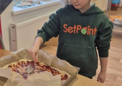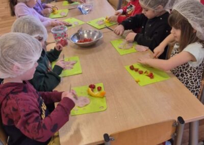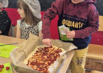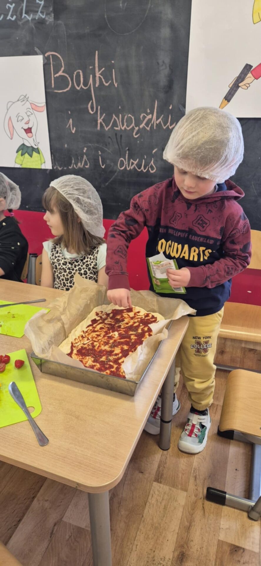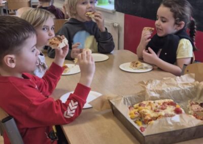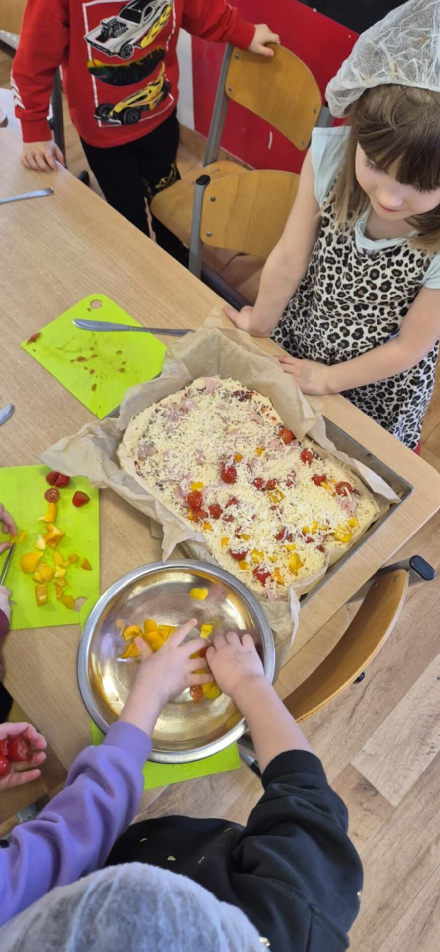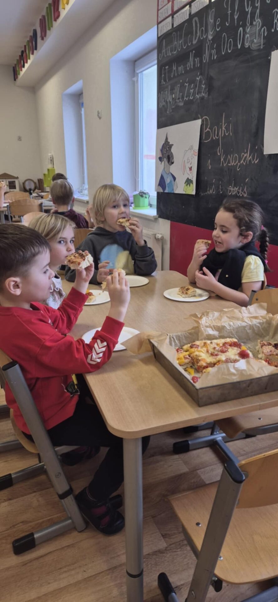 W środę podczas kulinarnych warsztatów świętowaliśmy w grupie Dzień Pizzy. Dzieci samodzielnie przygotowywały swoje pizze — kroiły składniki, dobierały dodatki i ćwiczyły bezpieczne posługiwanie się nożem.
