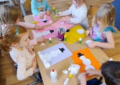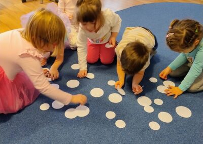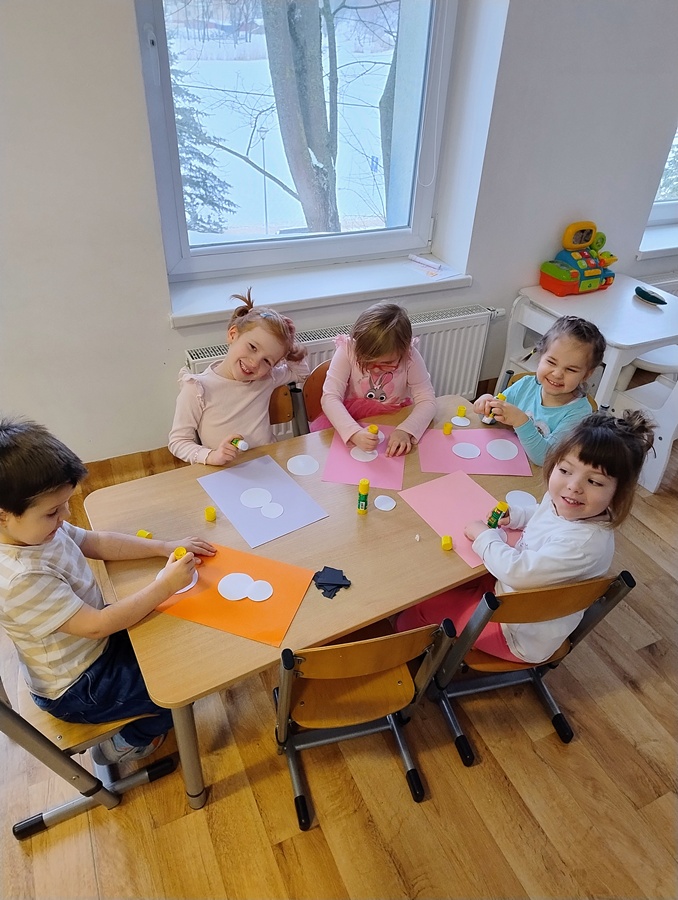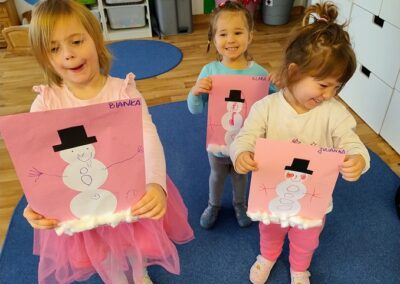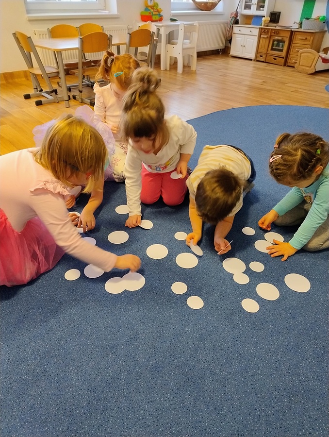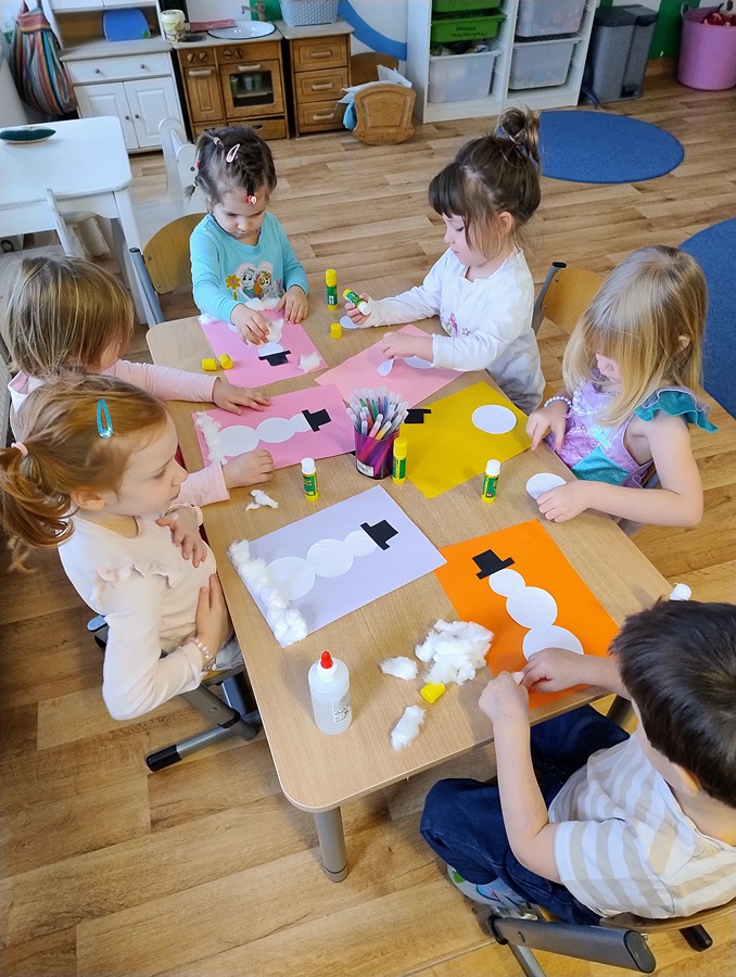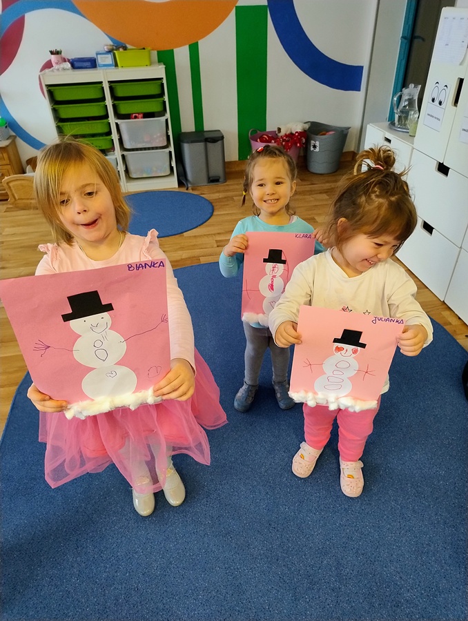 Podczas dzisiejszych zajęć Leluki Turkusowe rozwijały swoje umiejętności matematyczne poprzez zabawy z figurami geometrycznymi- nazywały różne figury geometryczne, porównywały ich wielkość i przeliczały je w dostępnym dla siebie zakresie. Swoją uwagę skupiliśmy na kołach, z których powstały „Wesołe bałwanki”.  Dzieci miały wybrać po 3 koła różnej wielkości i odpowiednio przykleić je na kartce. Dodaliśmy kapelusze, trochę śniegu z waty, a reszta elementów była dorysowana.