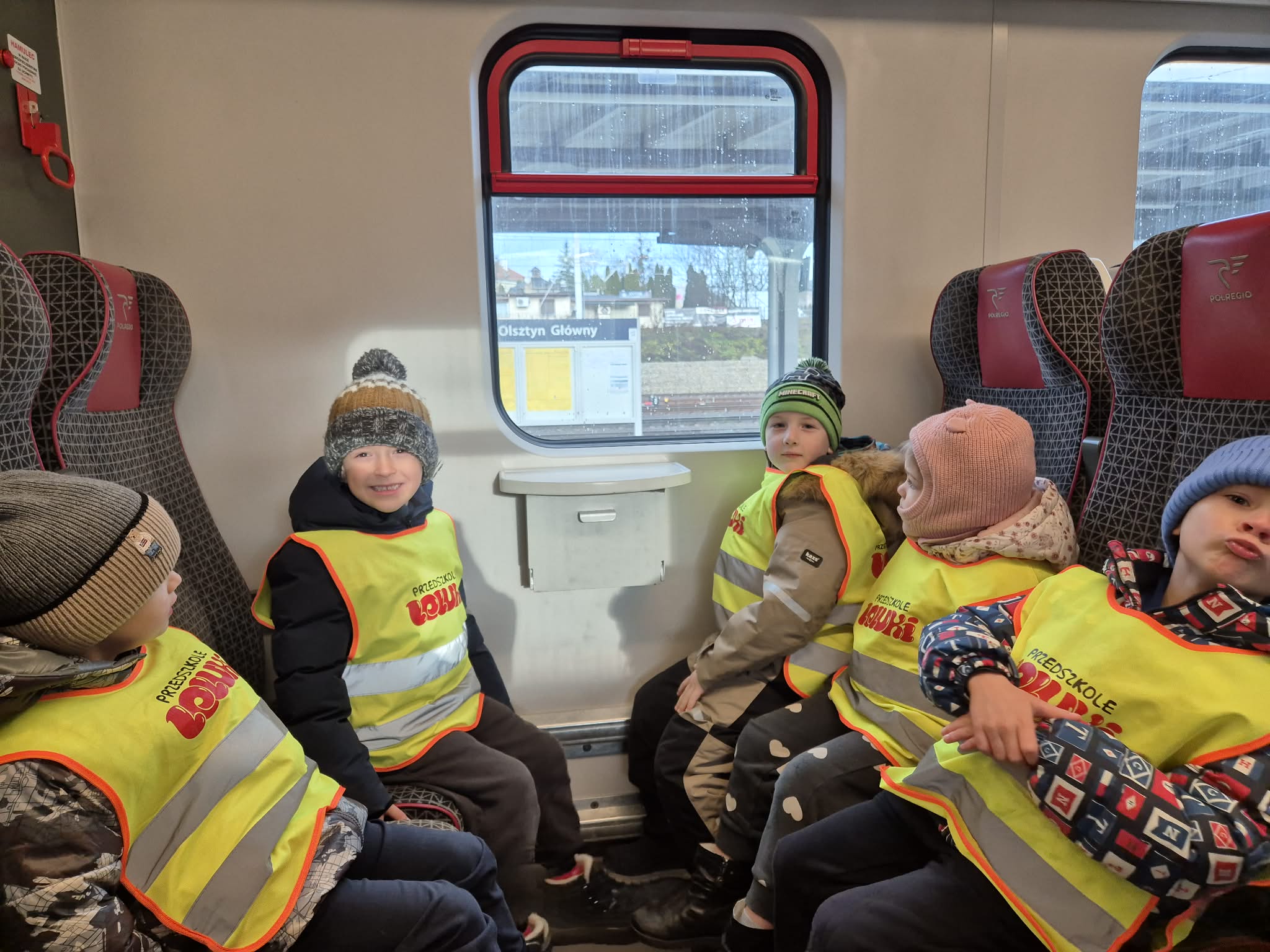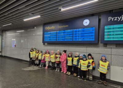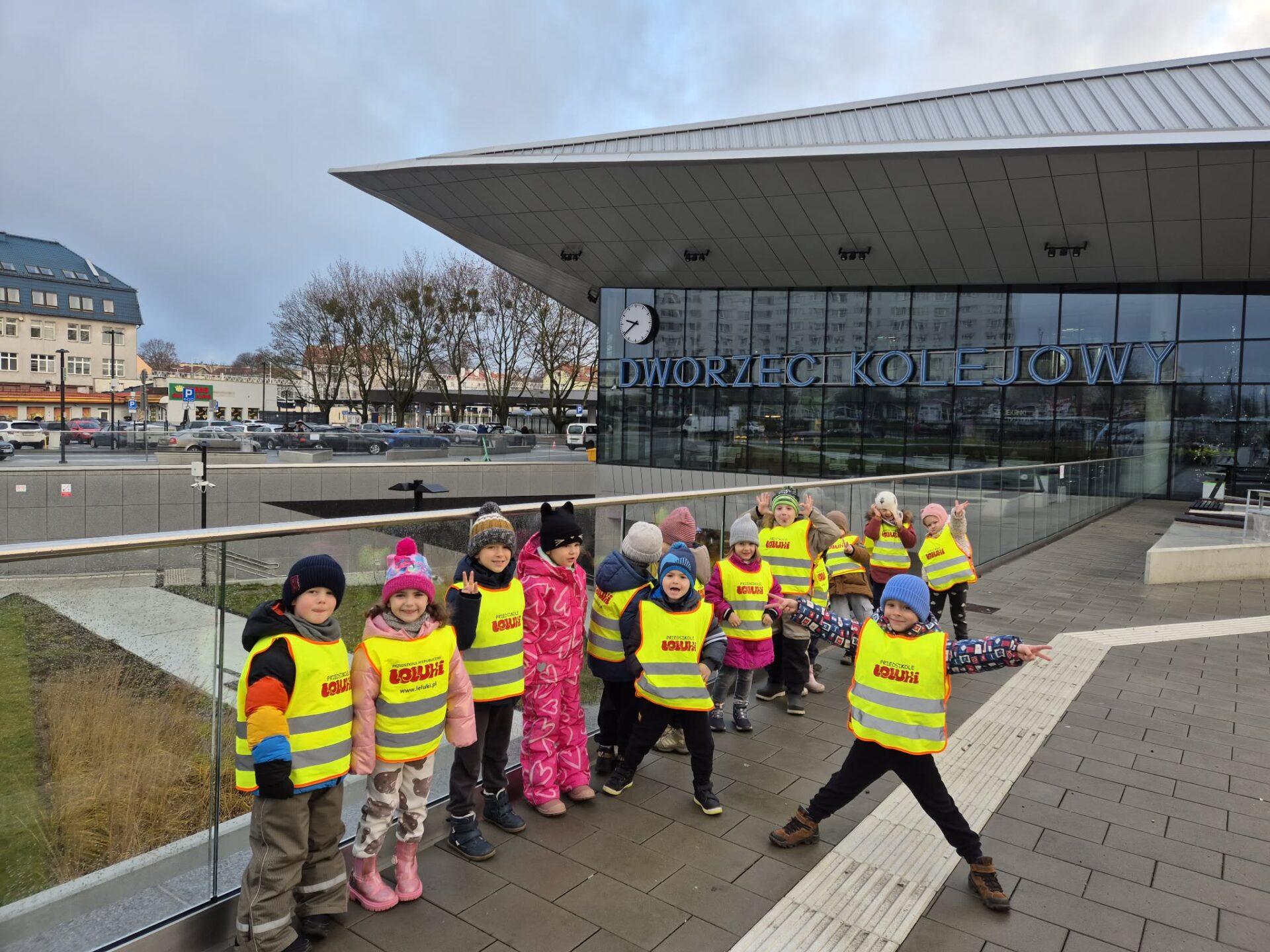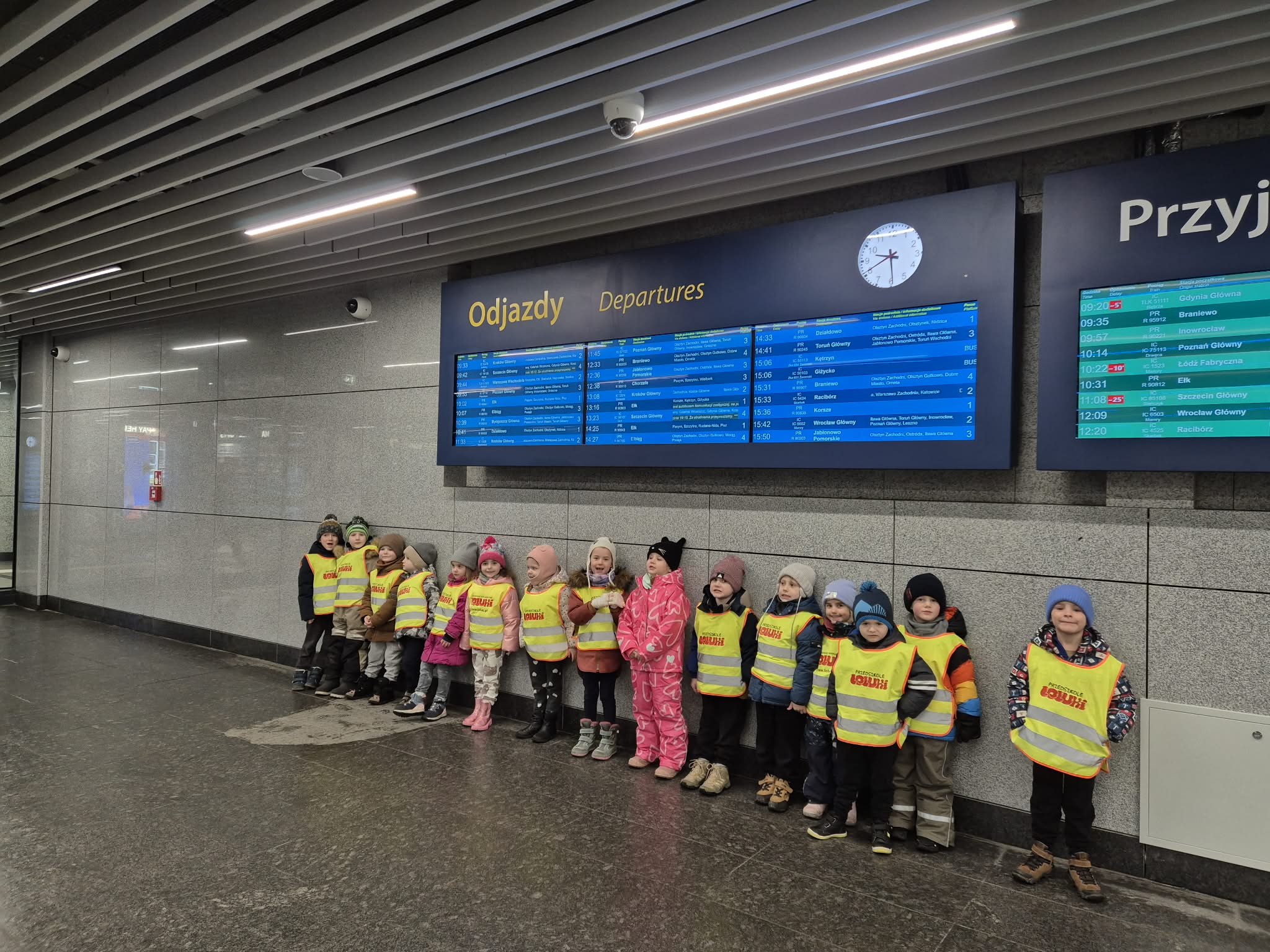 Nasze przedszkolaki wybrały się na wyjątkową wycieczkę – podróż pociągiem na Dworzec Główny w Olsztynie. Już sama jazda PKP była dla dzieci ogromnym przeżyciem! Z zainteresowaniem obserwowały mijane widoki za oknem. Podczas wyprawy przypomnieliśmy sobie zasady bezpieczeństwa, które obowiązują na terenie dworca i w pociągu. Dzieci dowiedziały się m.in., dlaczego należy trzymać się blisko opiekuna, nie podchodzić do krawędzi peronu oraz jak prawidłowo wsiadać do pociągu. Na miejscu mieliśmy okazję poznać przestrzeń dworca – obejrzeliśmy perony, kasy biletowe, tablice informacyjne oraz poczekalnię. Dzieci z zaciekawieniem odkrywały, do czego służą poszczególne elementy dworca i jak pomagają one podróżnym. Wycieczka była nie tylko świetną przygodą, ale także cenną lekcją samodzielności i odpowiedzialności. Dzieci wróciły z niej pełne wrażeń i nowych doświadczeń, które na pewno wykorzystają podczas przyszłych podróży!