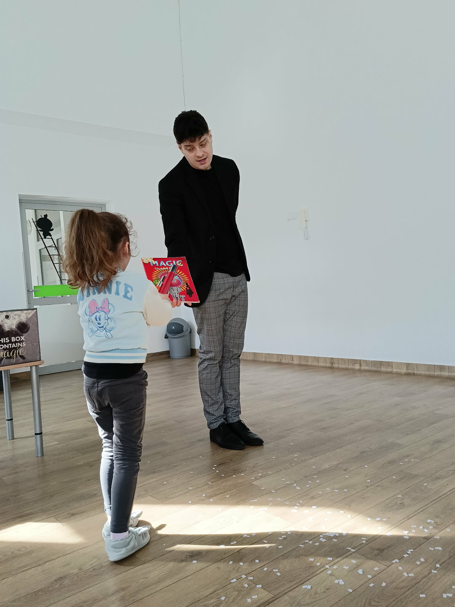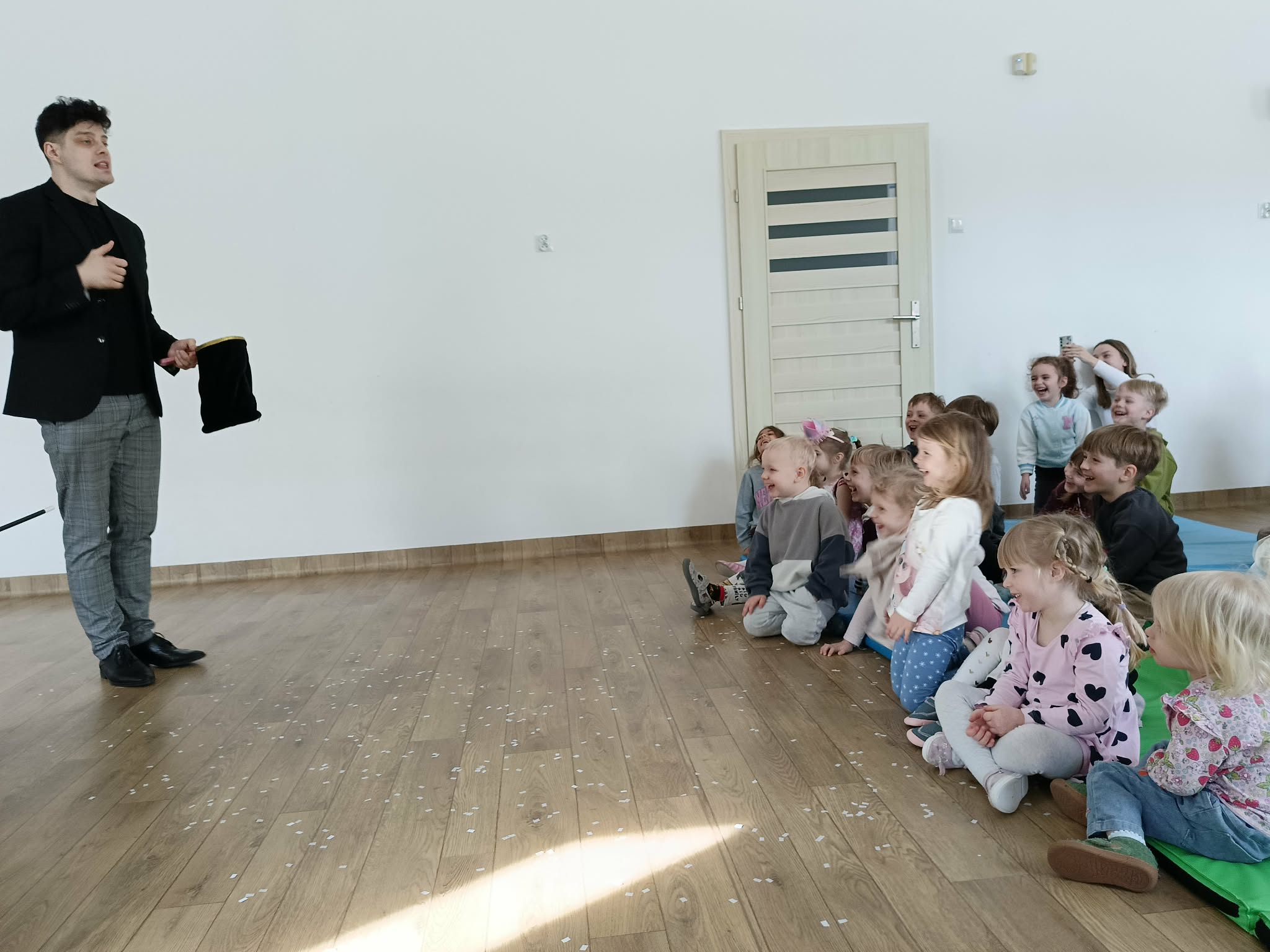 19.03.2026r w naszym przedszkolu odbył się wyjątkowy występ magika z grupy „Artyści Maccino”, który zabrał dzieci w niezwykły świat magii, iluzji i radości. Podczas pokazu nie zabrakło śmiechu oraz aktywnej zabawy z udziałem najmłodszych. Dzieci miały okazję zobaczyć niesamowite sztuczki, takie jak magiczna kostka, czy magiczny worek na drobiazgi skrywający wiele niespodzianek. Duże zainteresowanie wzbudziła także magiczna kolorowanka, która ożywała na oczach uczestników.