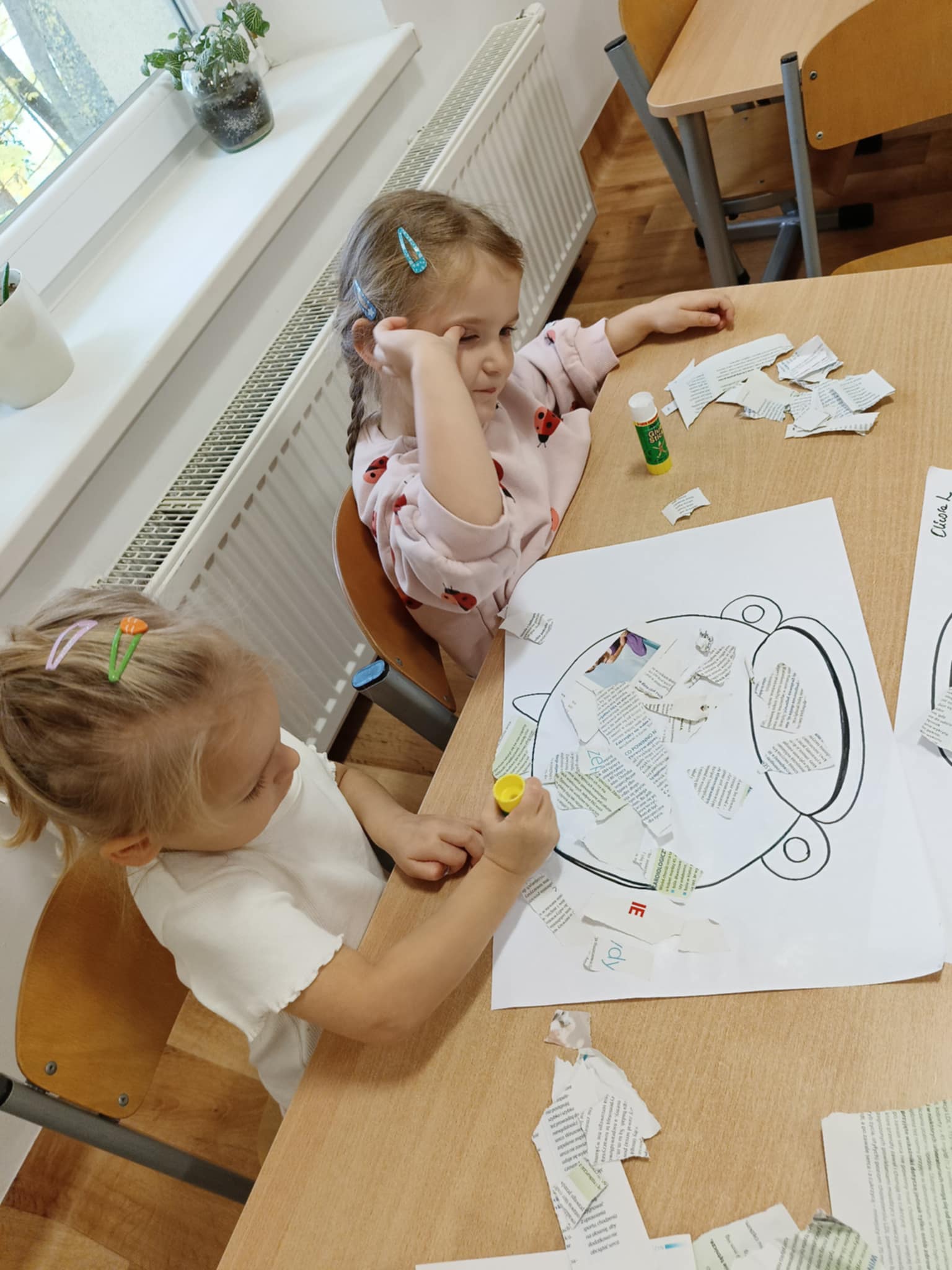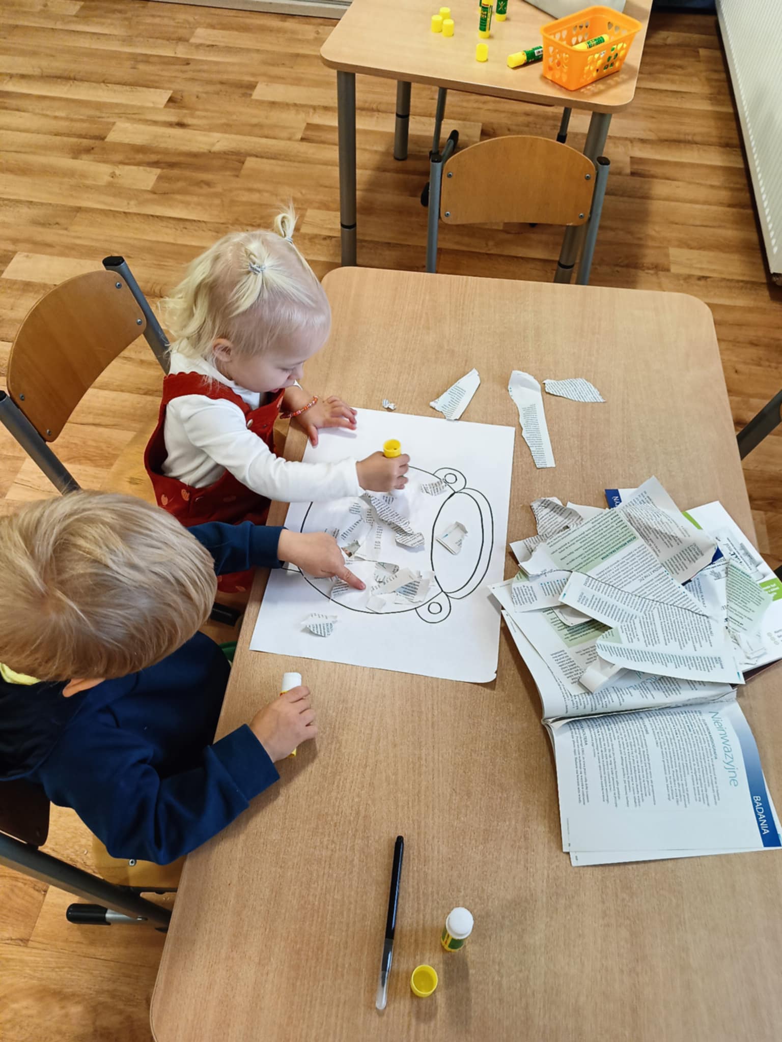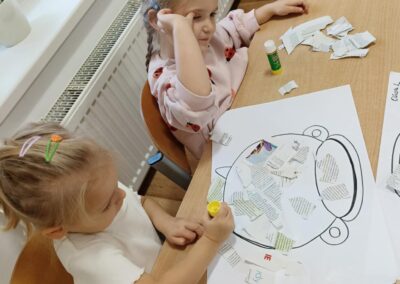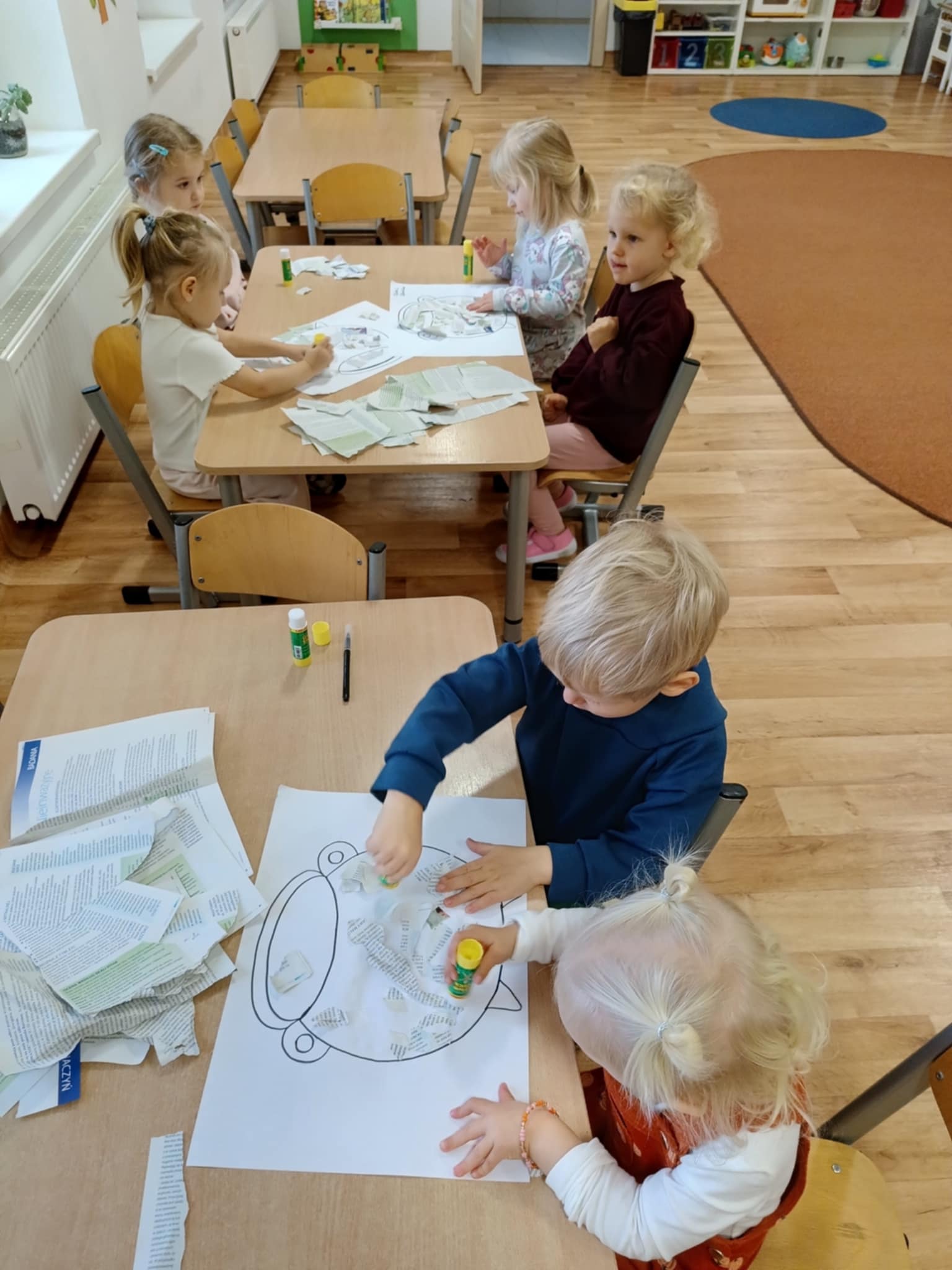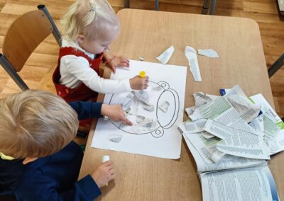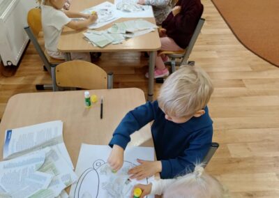 Podczas zajęć plastycznych dzieci najpierw darły gazety na małe kawałki co przyniosło dużo frajdy, następnie w zespołach dwuosobowych, przyklejały kawałki gazet klejem na kartce papieru w obrębie narysowanego garnka, w którym znajdowała się zupa dyniowa. W ten sposób powstały ciekawe, jesienne prace. Celem zajęć było rozwijanie sprawności manualnej, współpracy, kreatywności oraz utrwalenie tematyki jesiennej.